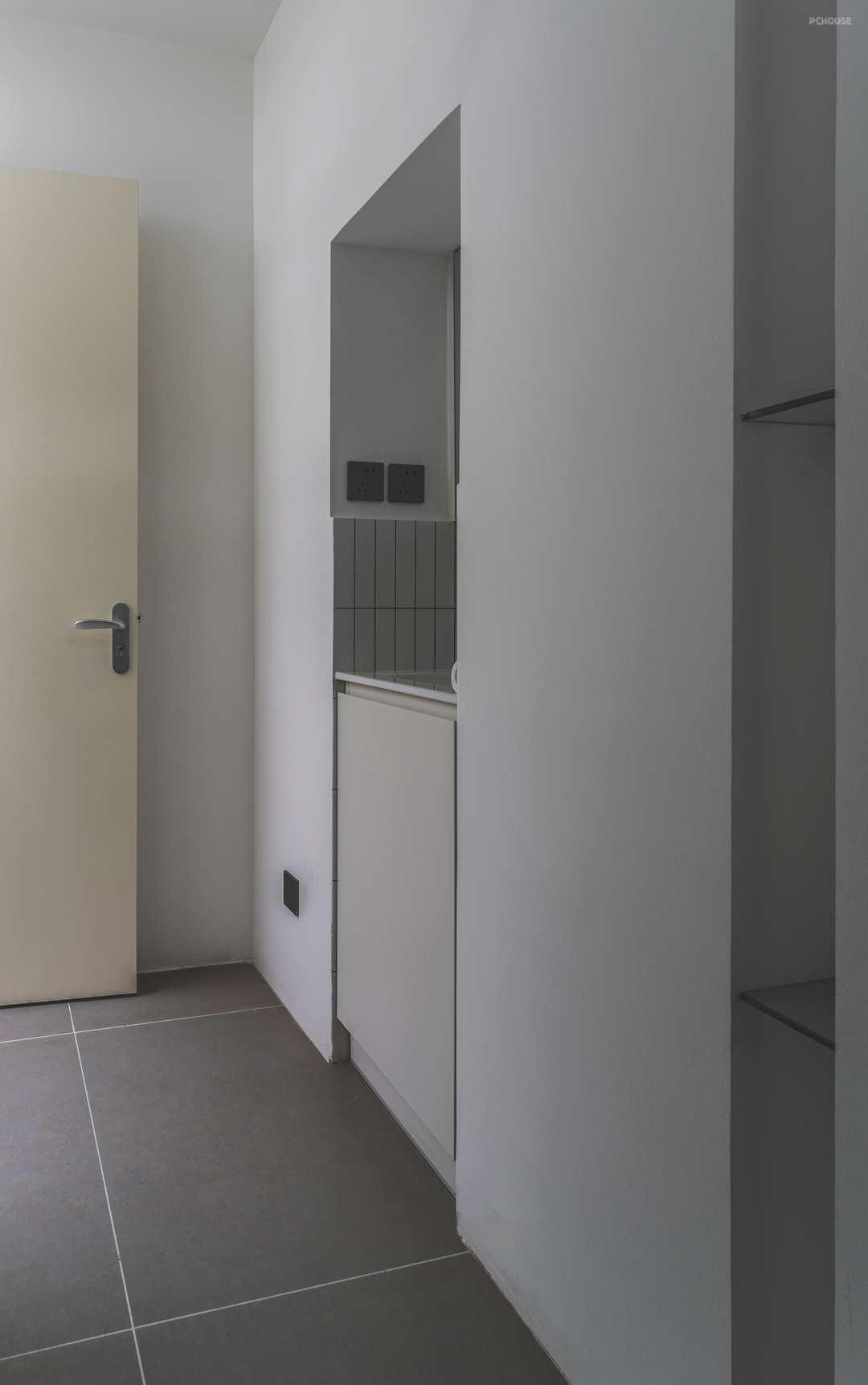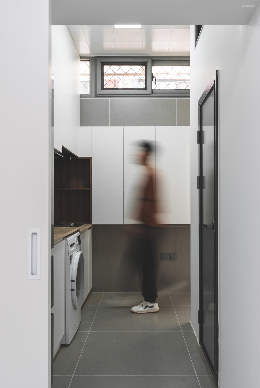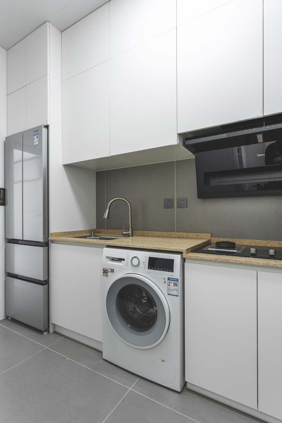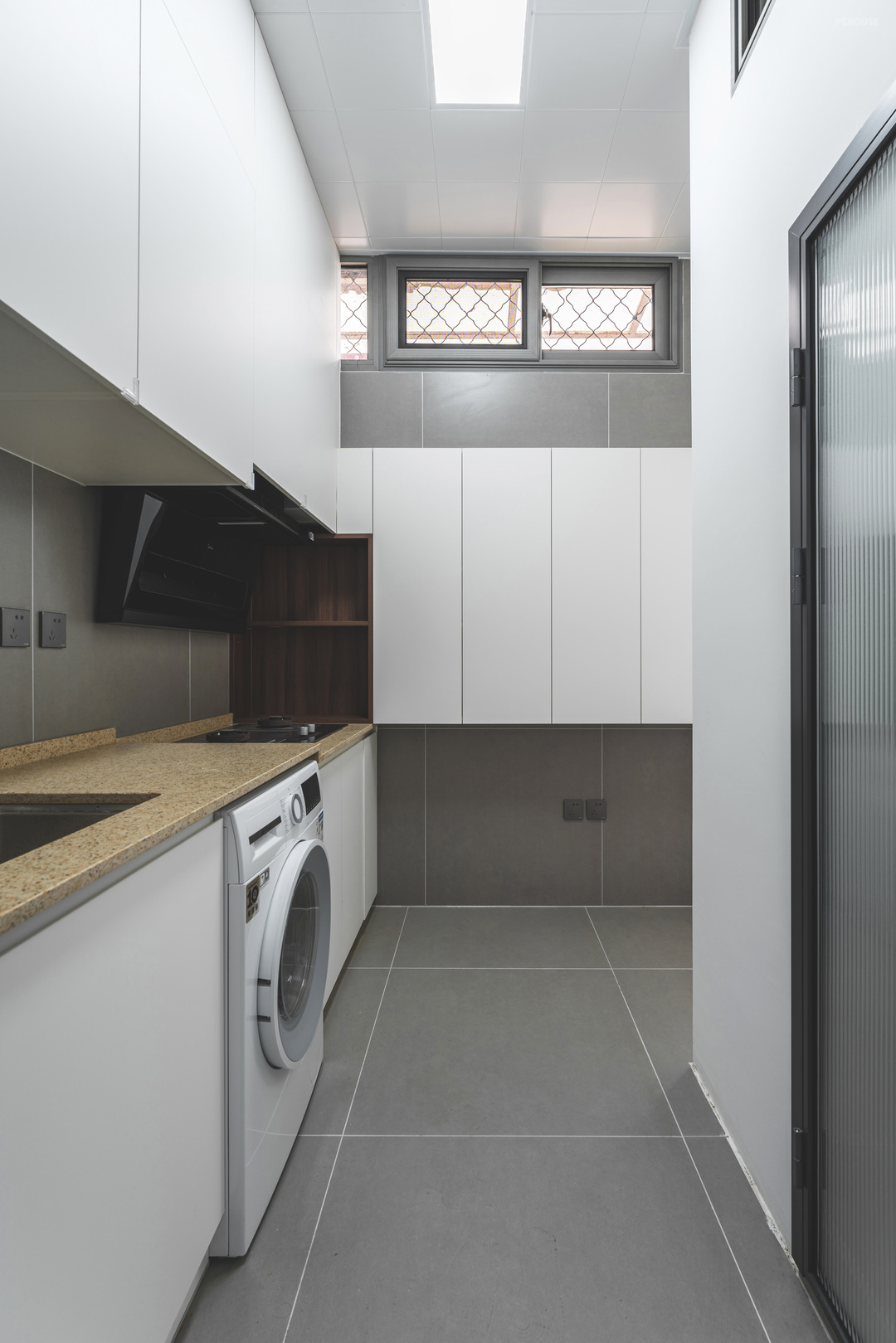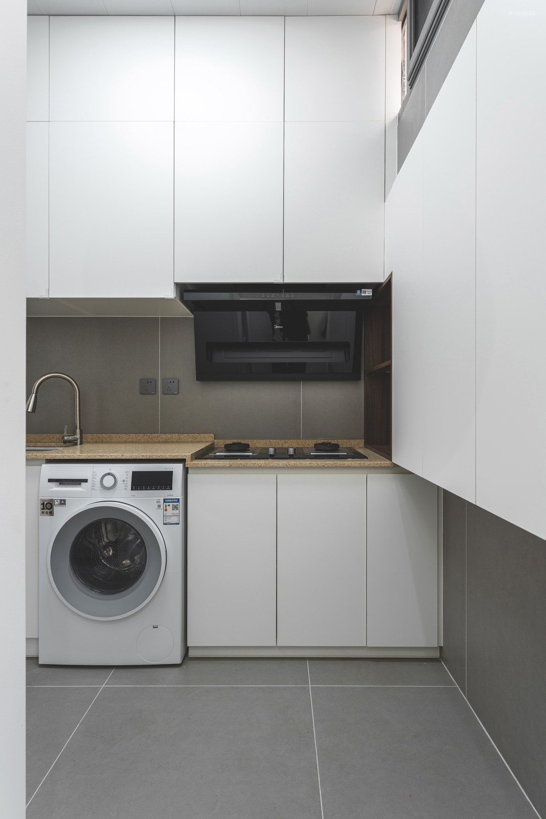 厨房由于洗衣机的内嵌做了高低台,由于空间较小,大面积使用了白色的板材饰面
