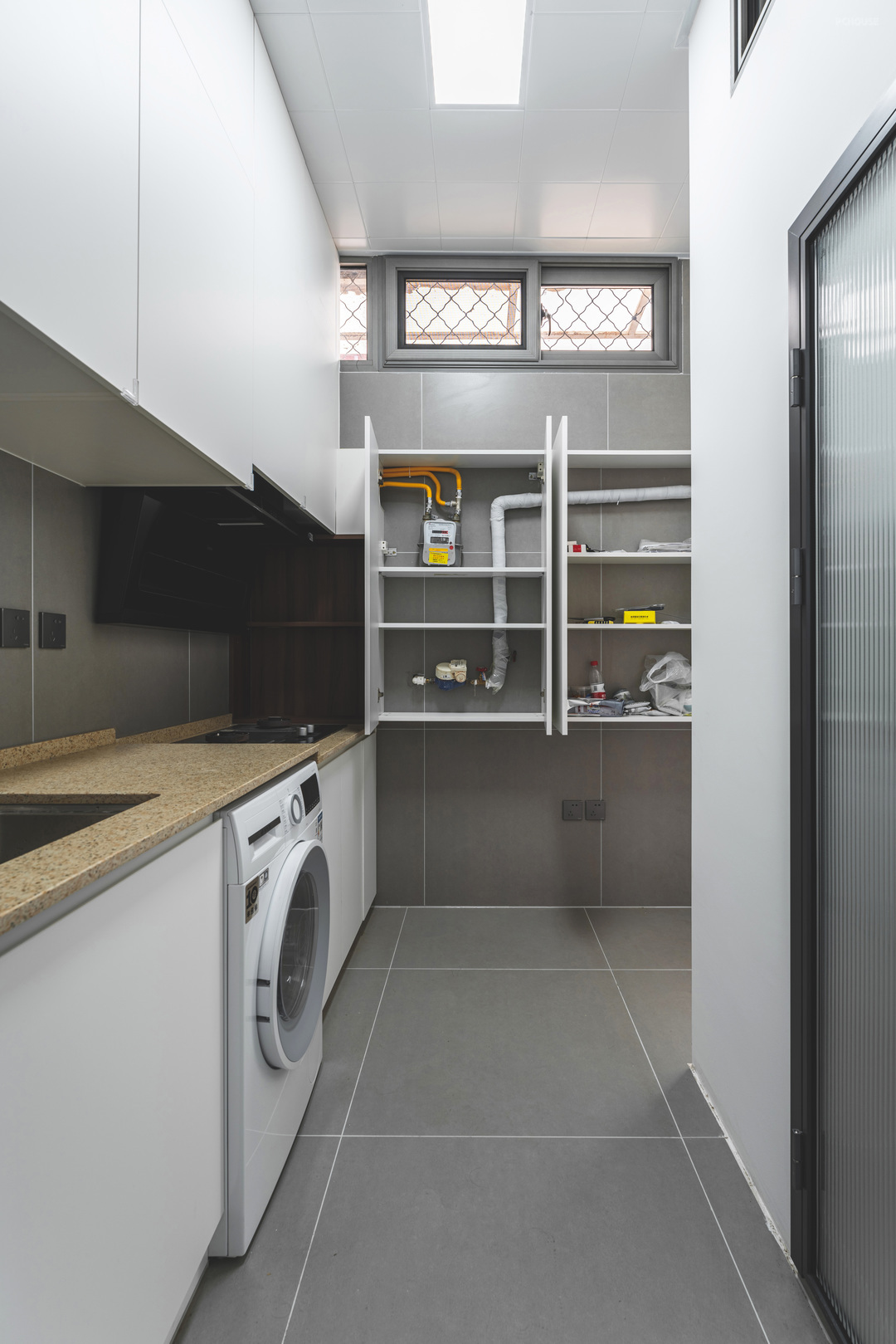 灶台右侧的收纳柜里边是燃气管道和燃气表,关上门的时候干净整洁,不影响视觉感受