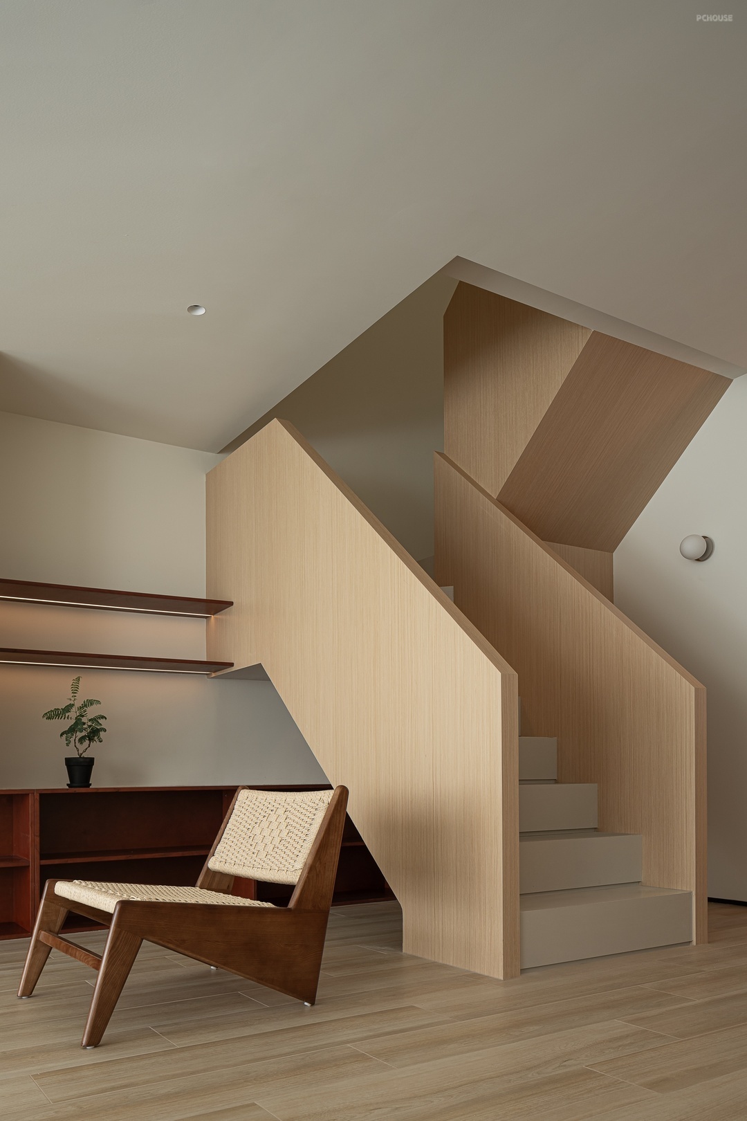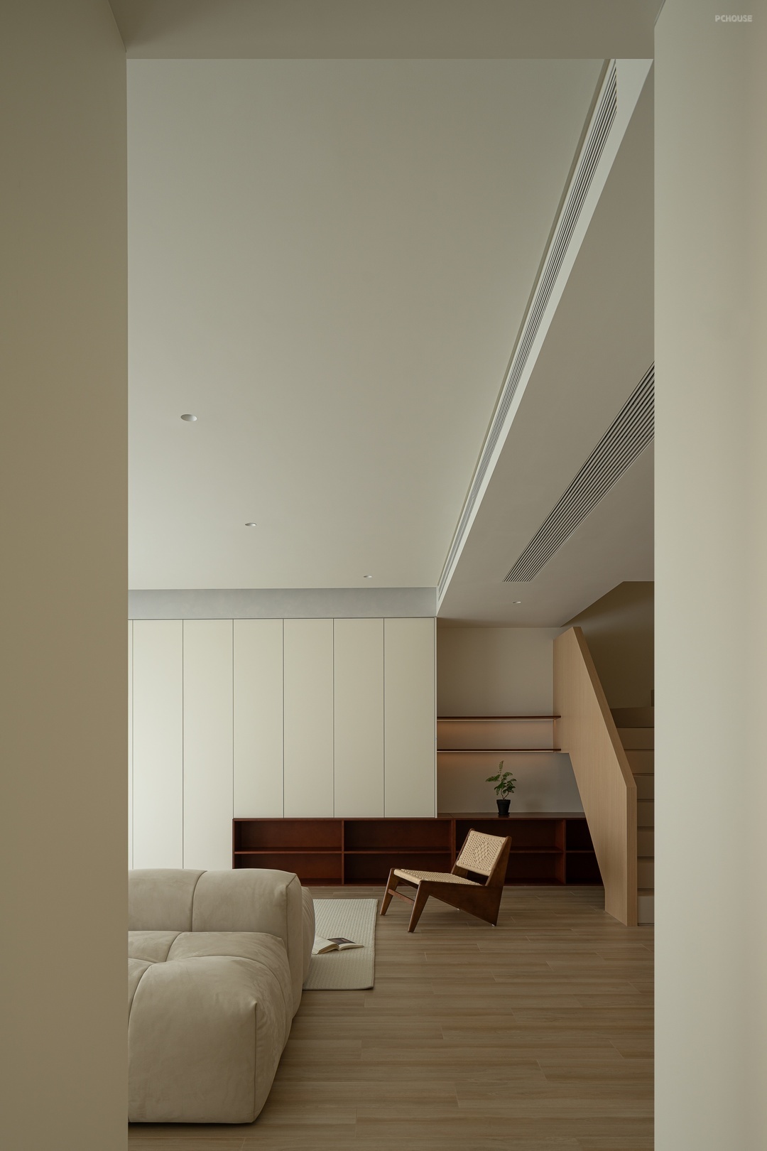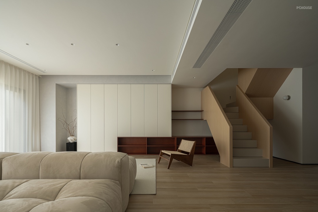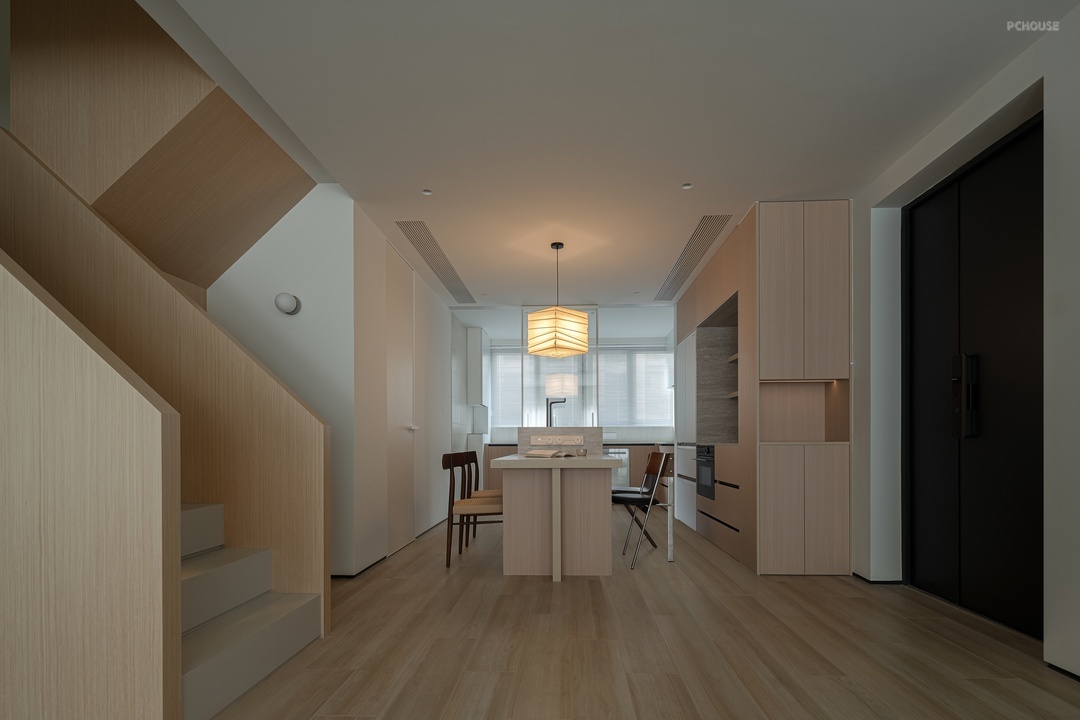 在色彩与材质的选择上,这套案例同样展现出了极高的水准。灰色艺术漆的墙面与纯白的储物柜形成了鲜明的对比,既简约又不失格调。而一侧的原木楼梯与地板相呼应,为整个空间增添了一份自然与温馨的气息。这种色彩与材质的巧妙搭配,不仅提升了空间的层次感,也让整个家显得更加舒适与宜居。
