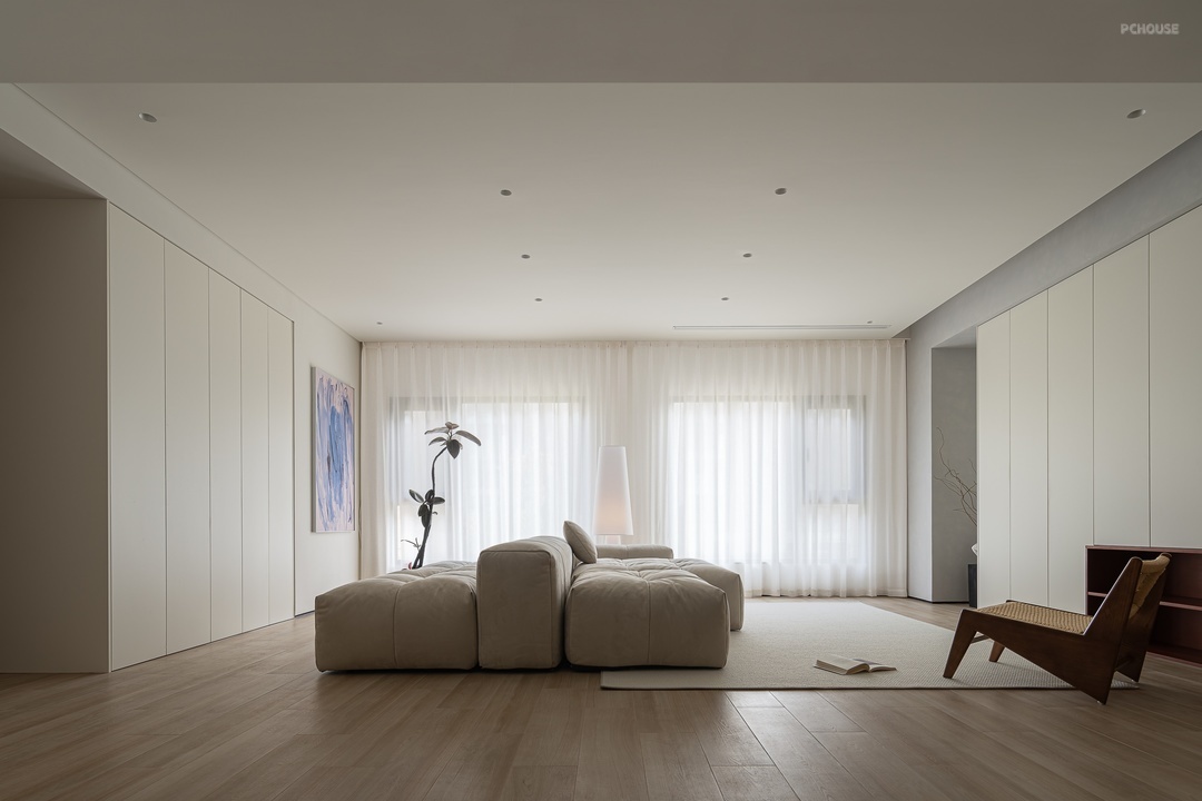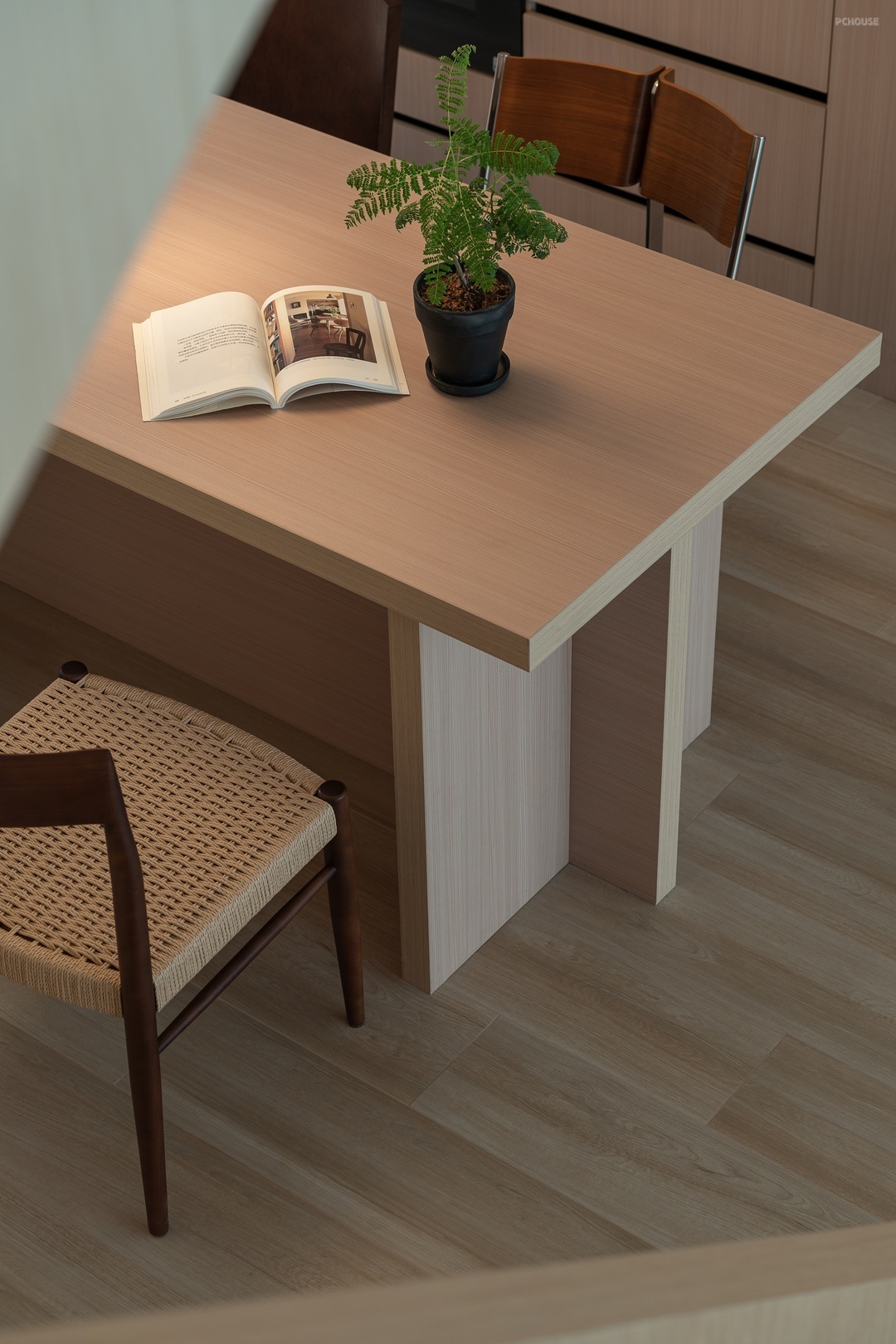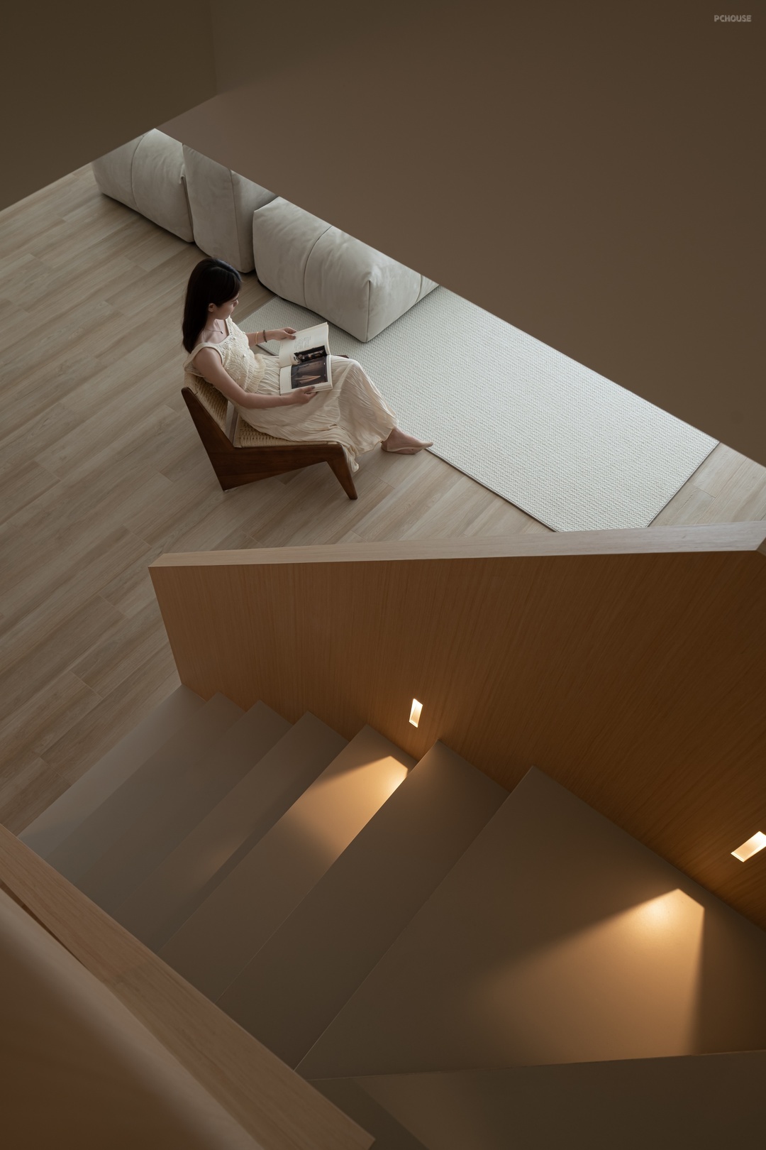 在色彩与材质的选择上,这套案例同样展现出了极高的水准。灰色艺术漆的墙面与纯白的储物柜形成了鲜明的对比,既简约又不失格调。而一侧的原木楼梯与地板相呼应,为整个空间增添了一份自然与温馨的气息。这种色彩与材质的巧妙搭配,不仅提升了空间的层次感,也让整个家显得更加舒适与宜居。