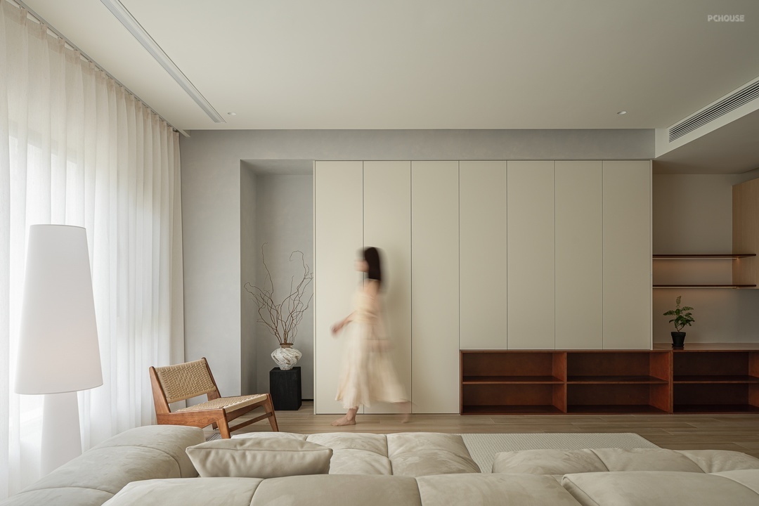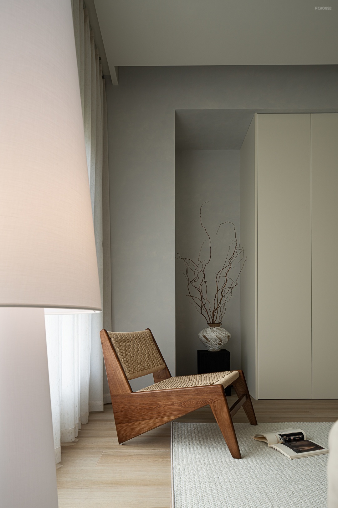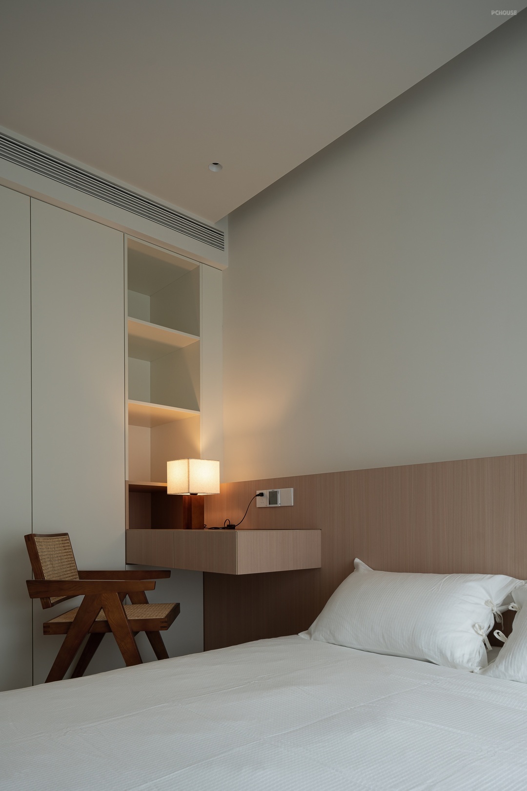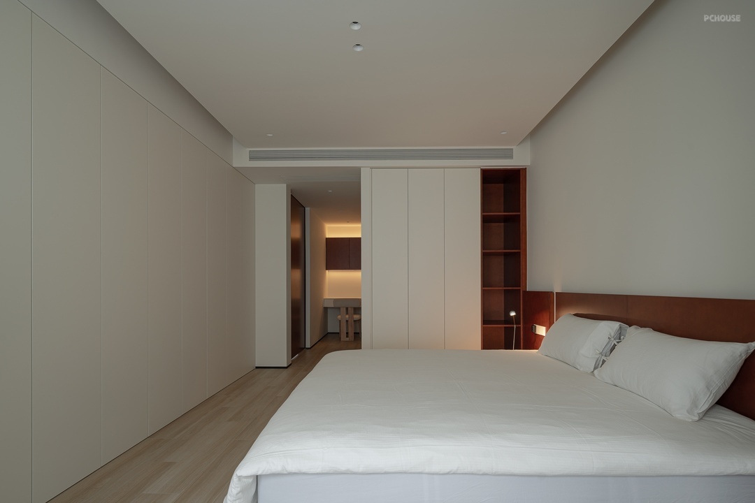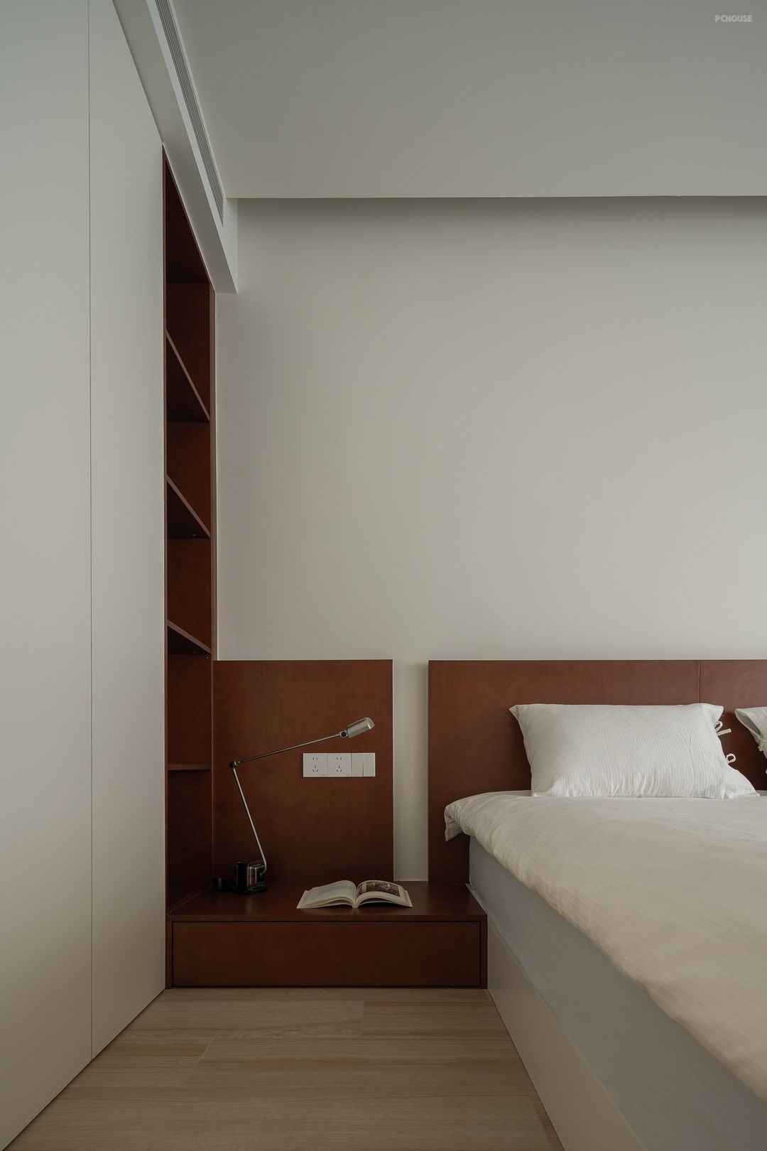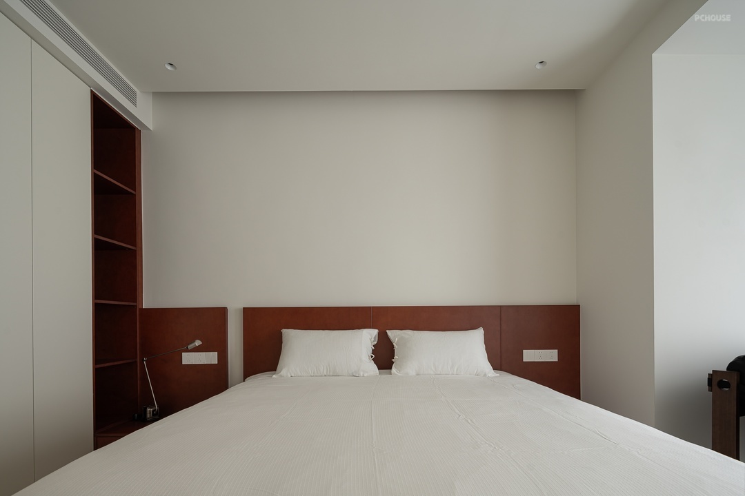 走进主卧,一股简约而不失温馨的气息扑面而来。暖白的基础色调简洁大方,为整个空间奠定了舒适的基调。而点缀其中的紫砂红定制床体和开放柜,则成为了视觉上的焦点。它们错落有致地排列着,色彩分明,既体现了主人的独特品味,又让整个空间充满了层次感。