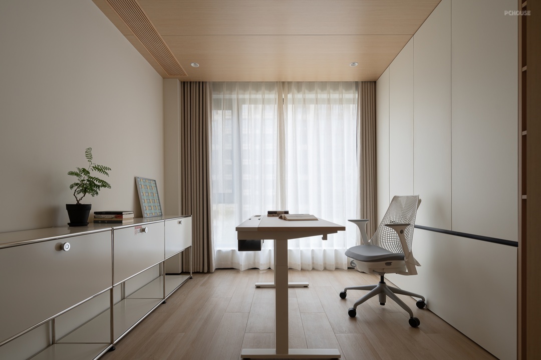 拾级而上,这里是二楼的多功能书房。这里不仅是一个静心阅读、思考的空间,更隐藏着一张设计巧妙的隐藏式折叠床。你是否已经发现了它的踪迹?口袋移门的设计大大节省了空间,使得整个书房既实用又不失宽敞感。在这样的环境中,无论是工作还是小憩,都能找到属于自己的那份宁静与自在。