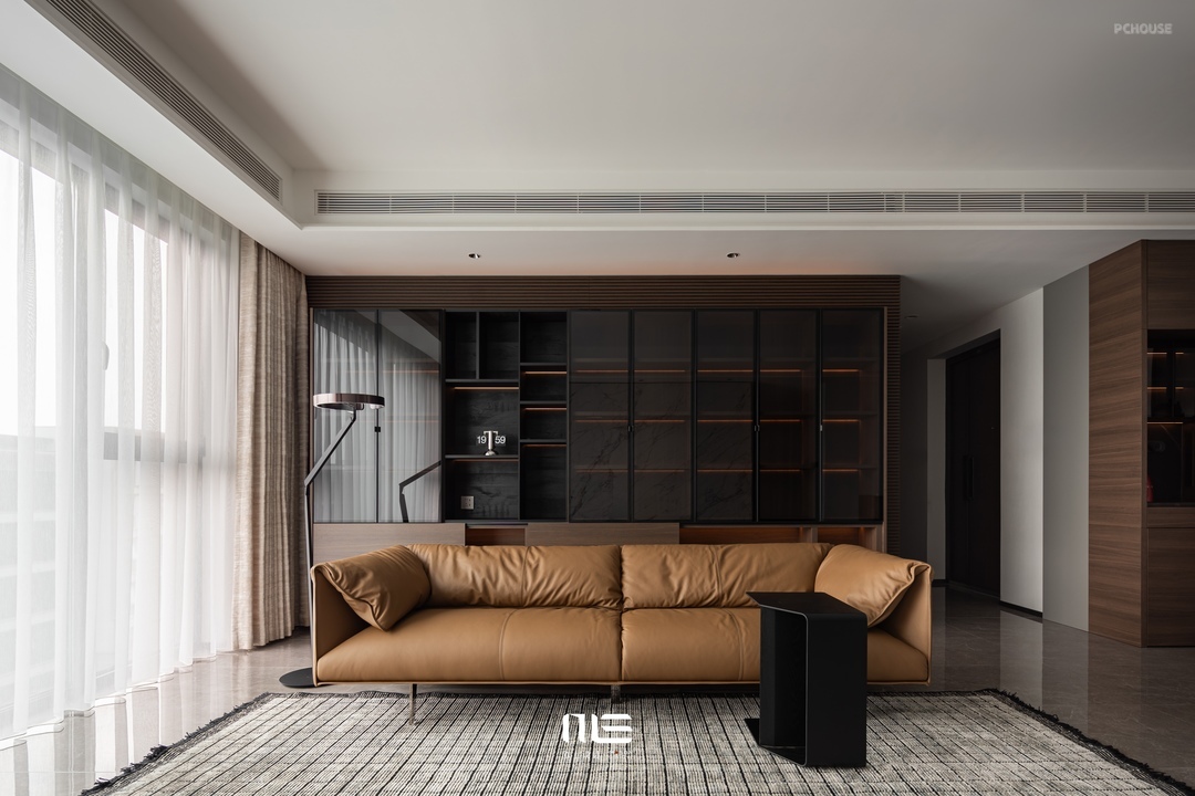 沙发的选择更是别具匠心,棕色皮质沙发柔软舒适,搭配上简约的黑色茶几,营造出一种温馨而不失格调的氛围。