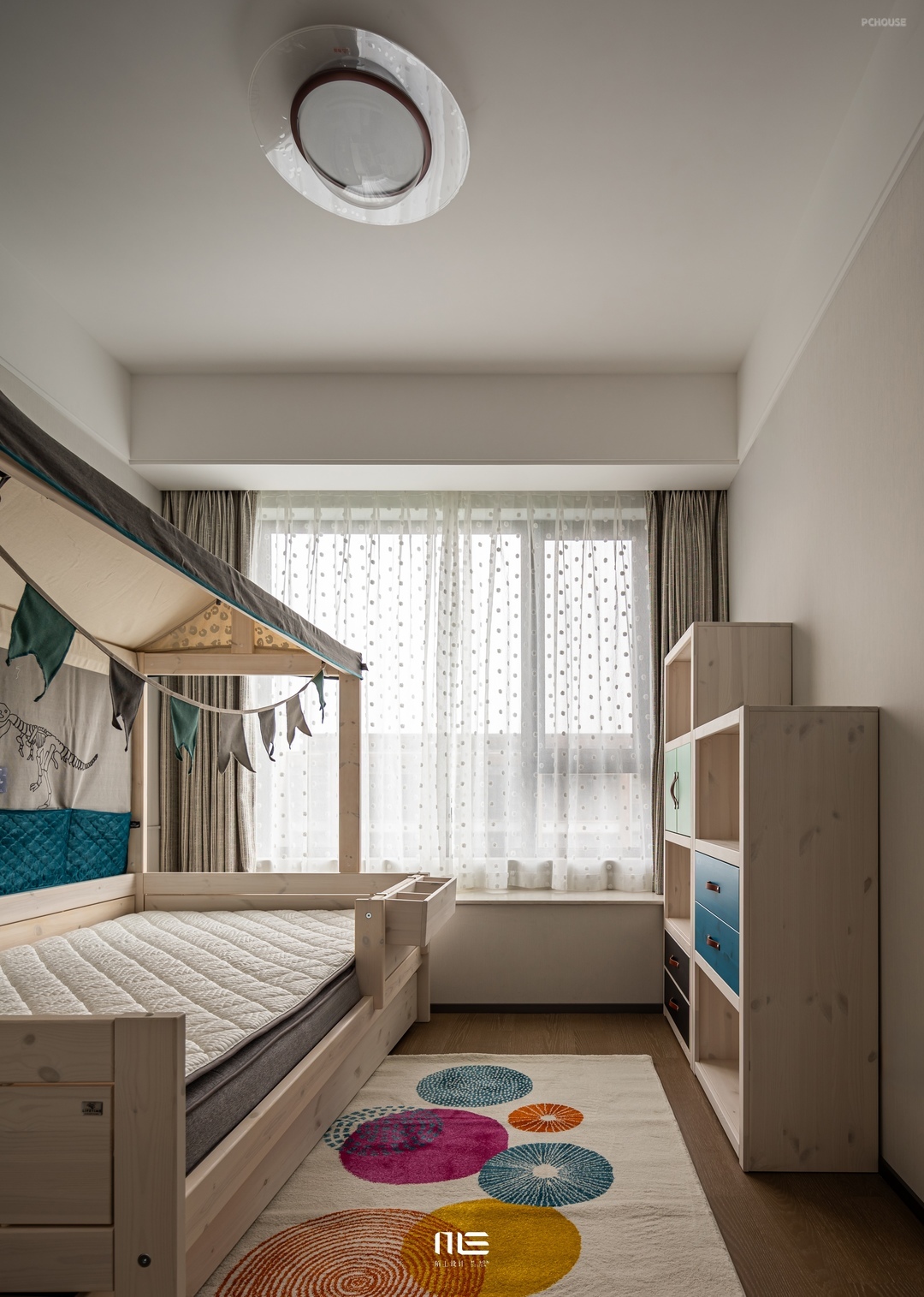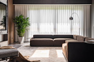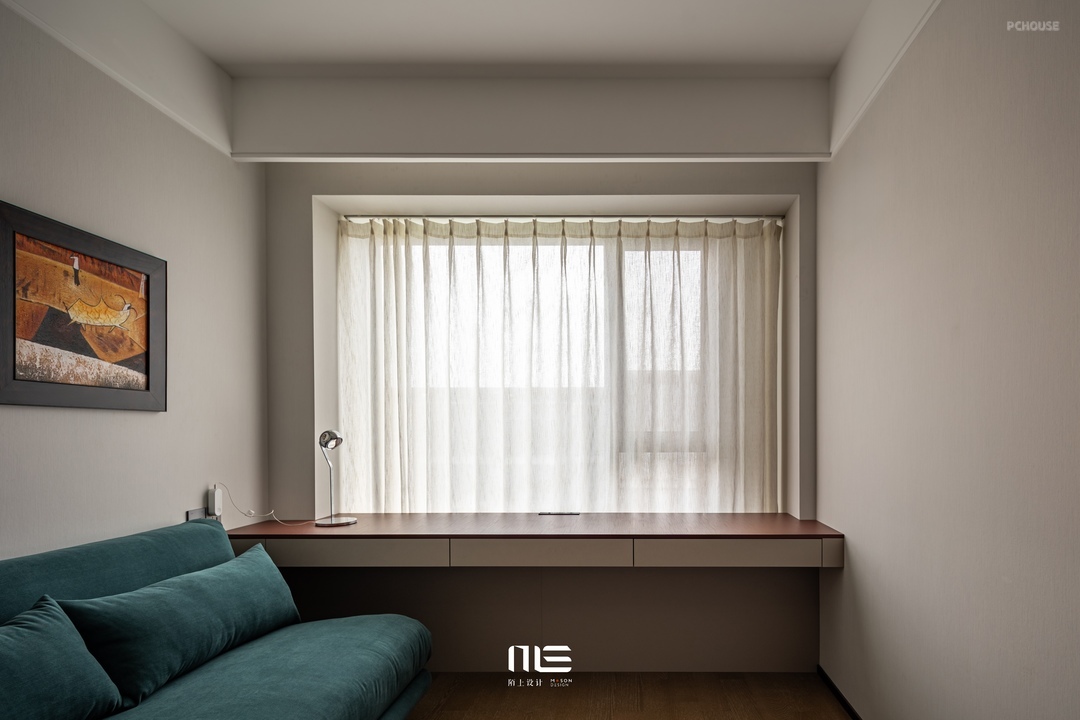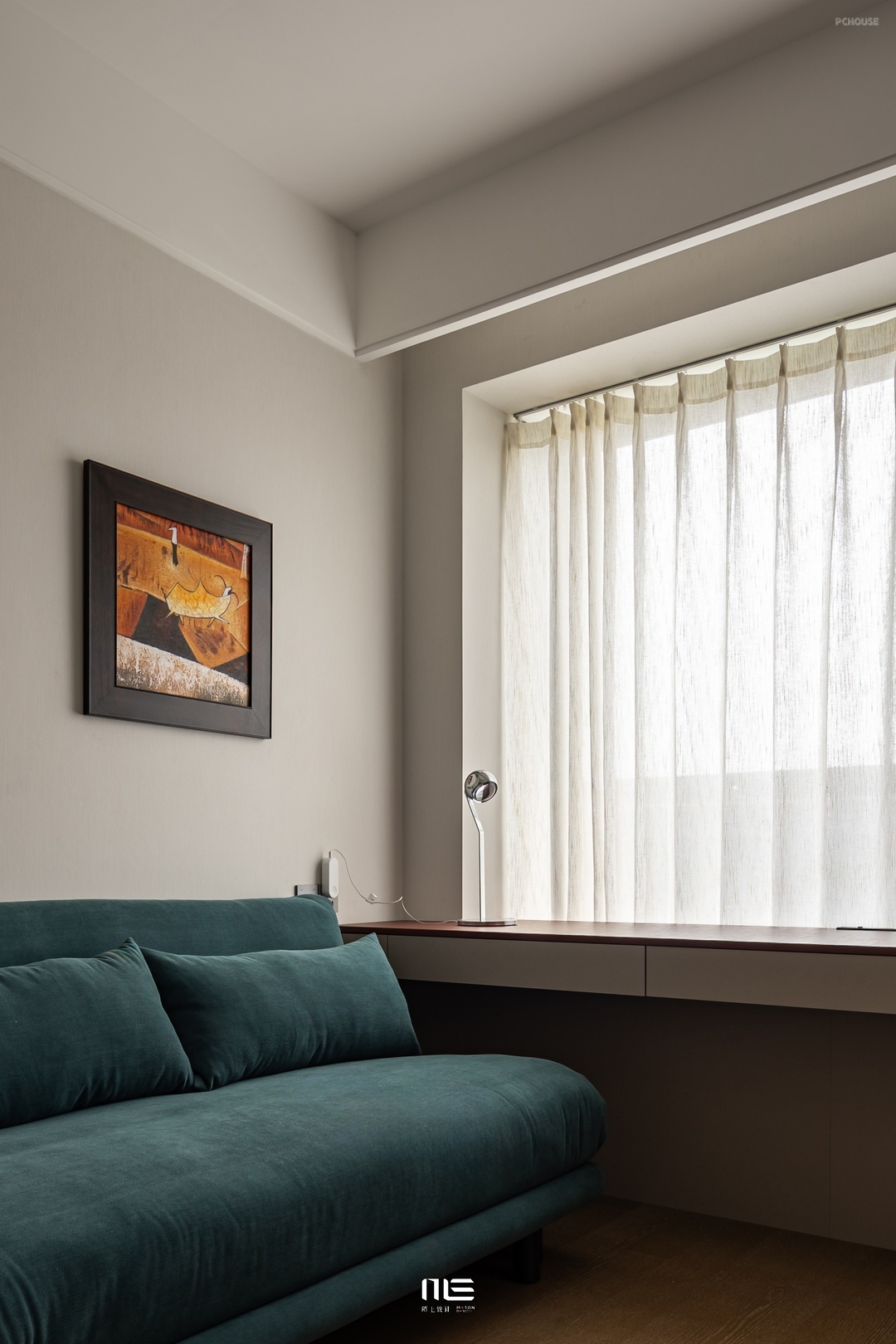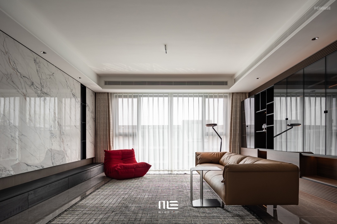 大面积的落地窗让阳光毫无保留地洒入室内,白色的纱帘随风轻轻飘动,光影交错间,营造出一种宁静而美好的氛围。