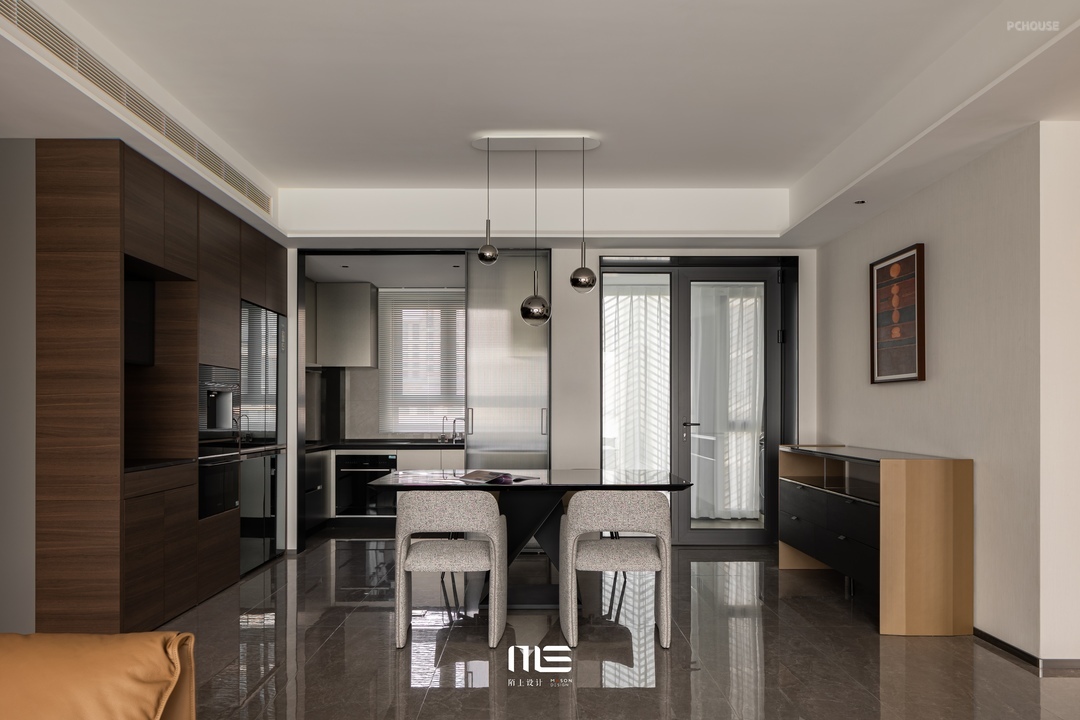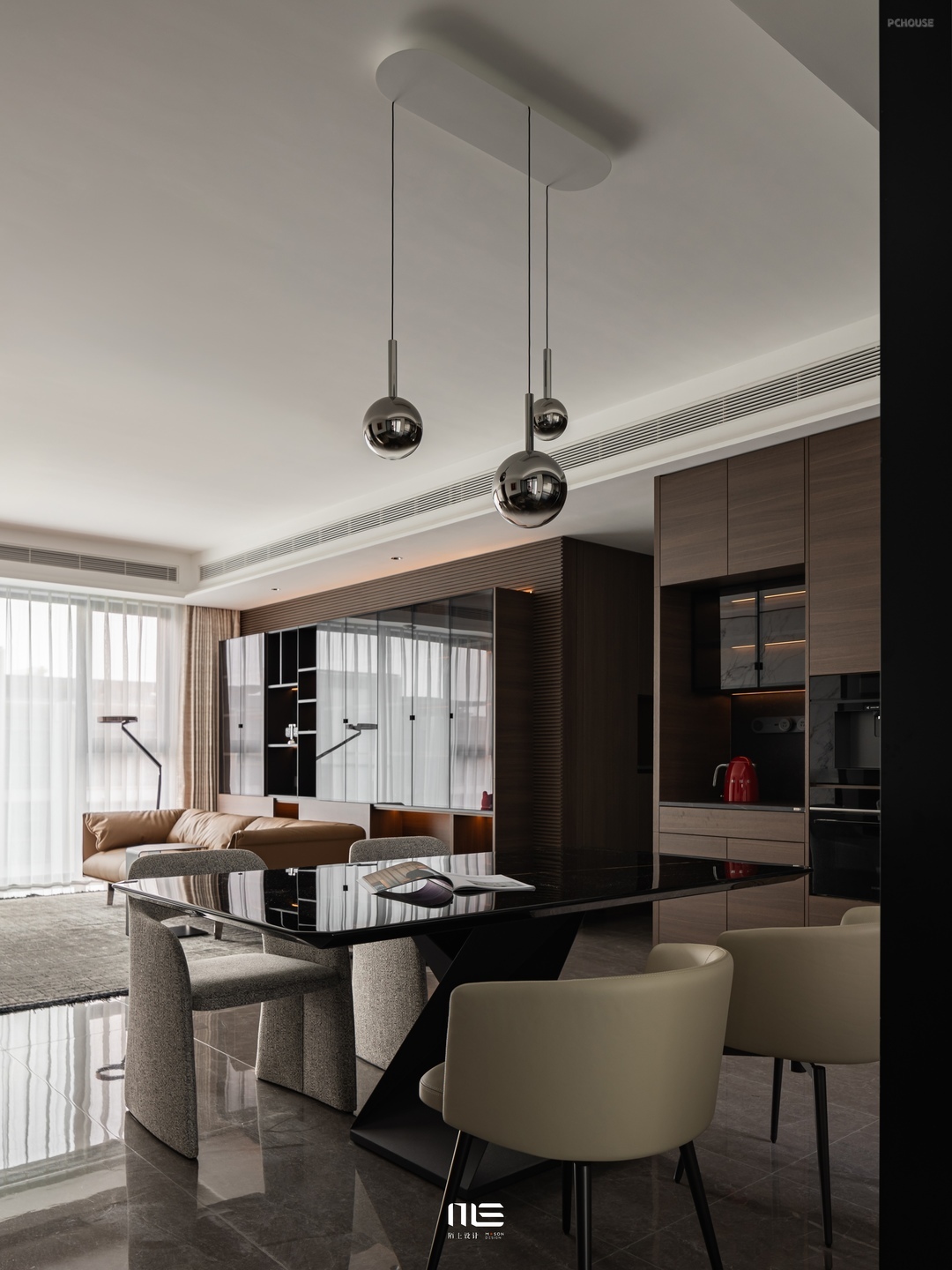 餐厅借悬浮餐台、精致吊灯,打造精致用餐氛围,融合不同材质与造型,浅灰色编制纹理椅具,传递自然质朴感。