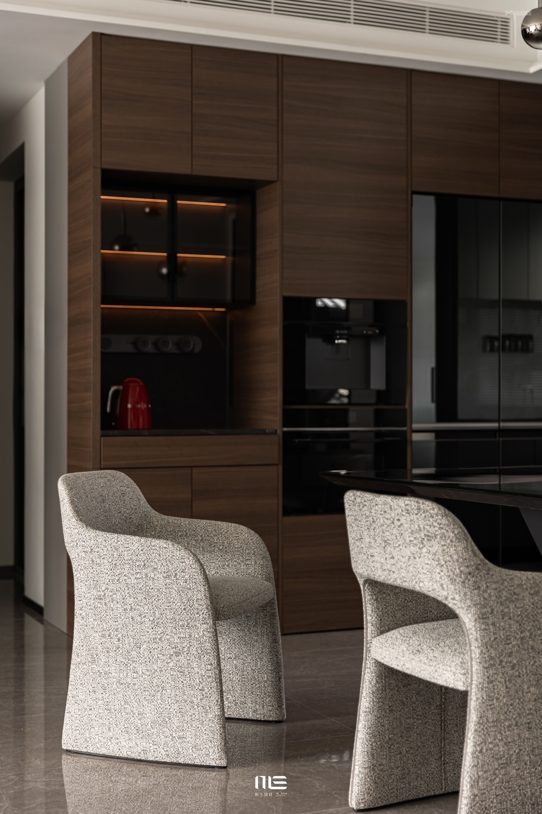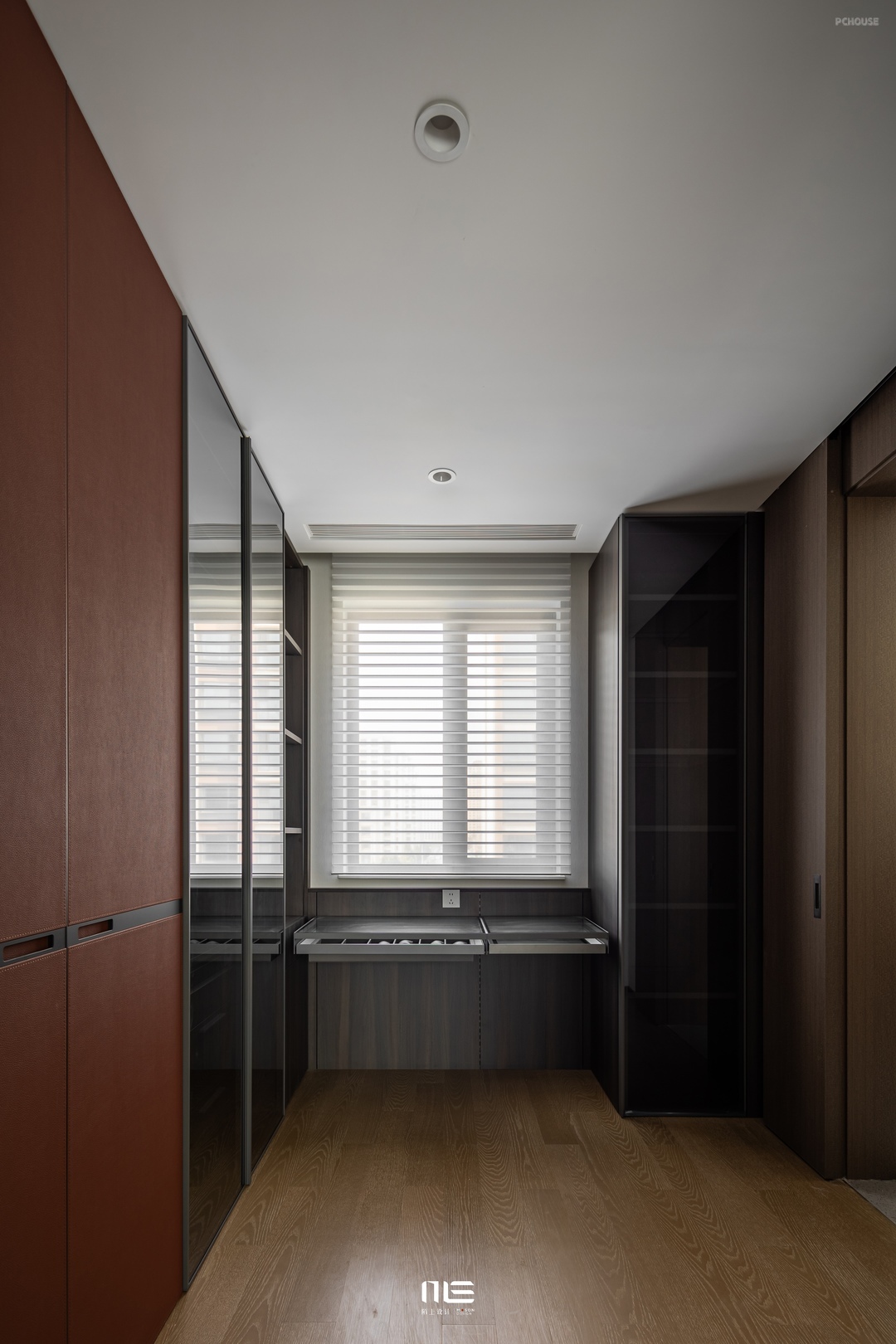 衣帽间更是收纳空的天堂!焦糖色柜体搭配玻璃门,高级又通透;隐藏式梳妆台嵌入窗边,化妆时还能享受自然光影。木质地板的温润,中和了深色系的冷冽,每一处细节都在说“精致是生活的底色”。