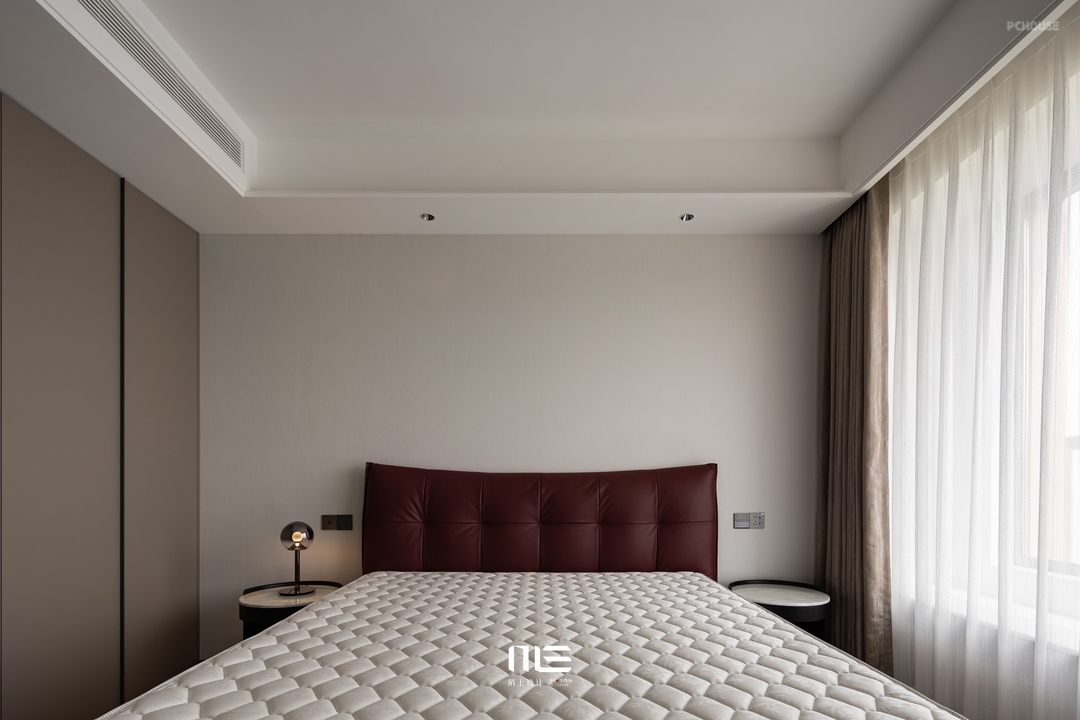 奶咖色墙面与酒红色皮革床头碰撞出轻奢感,无主灯设计让空间更显大气。床边的小台灯像一颗艺术感的星球,点亮每一个休憩的夜晚。