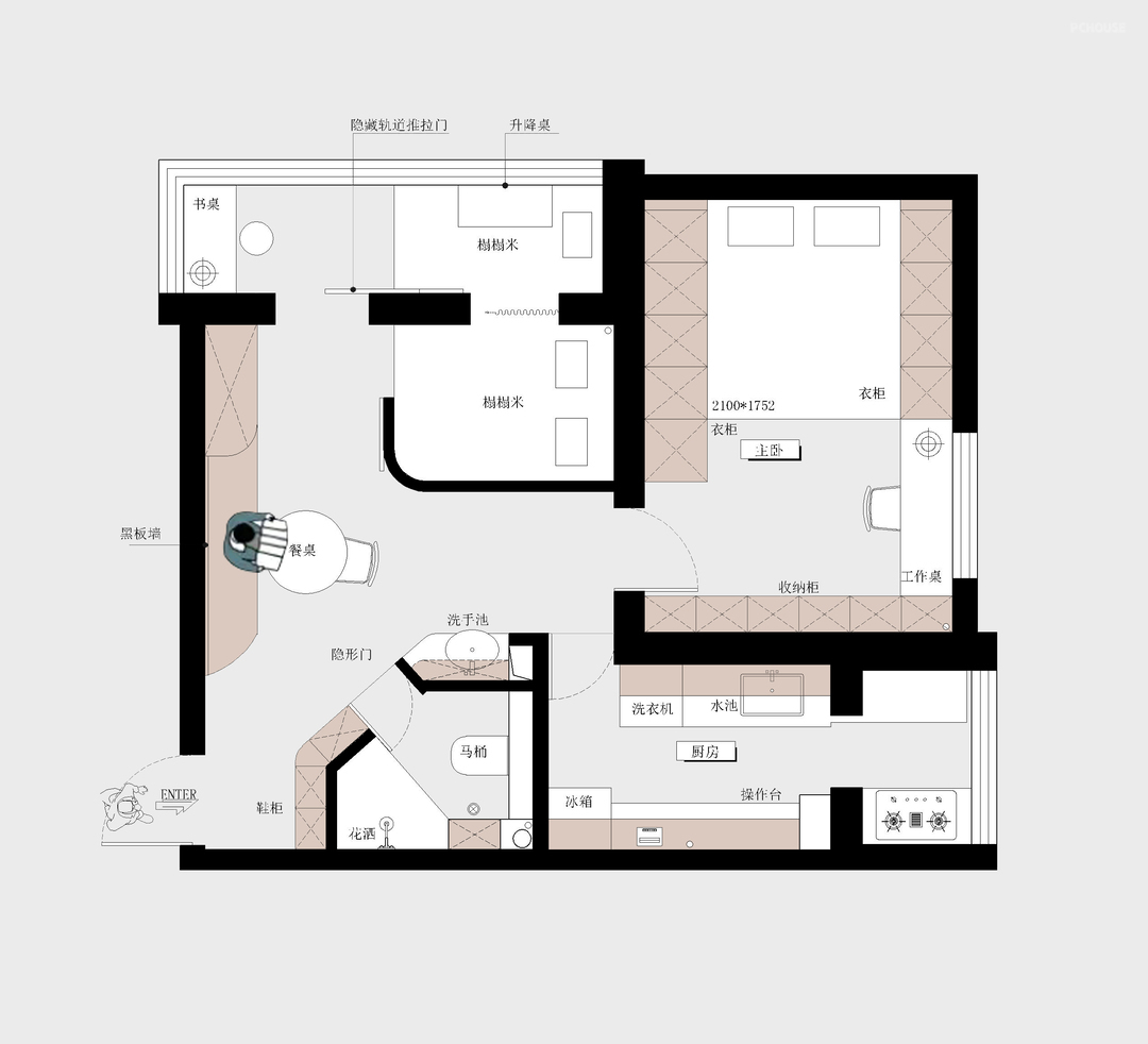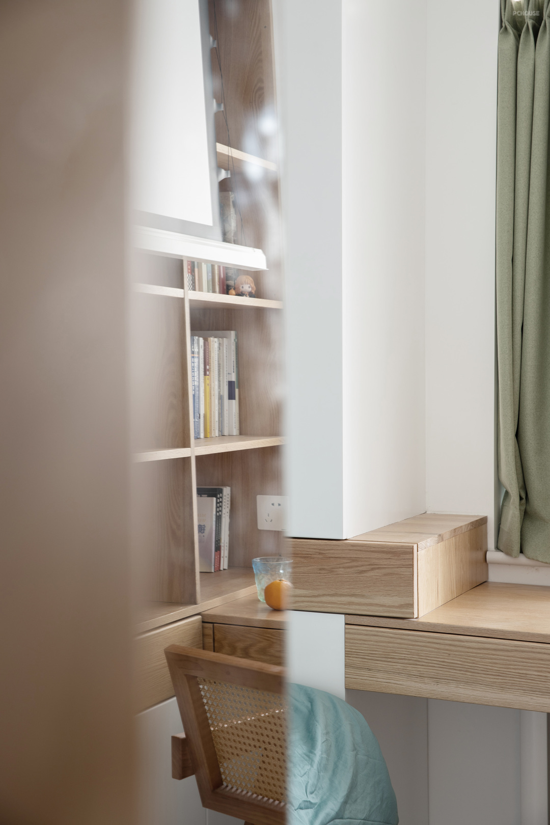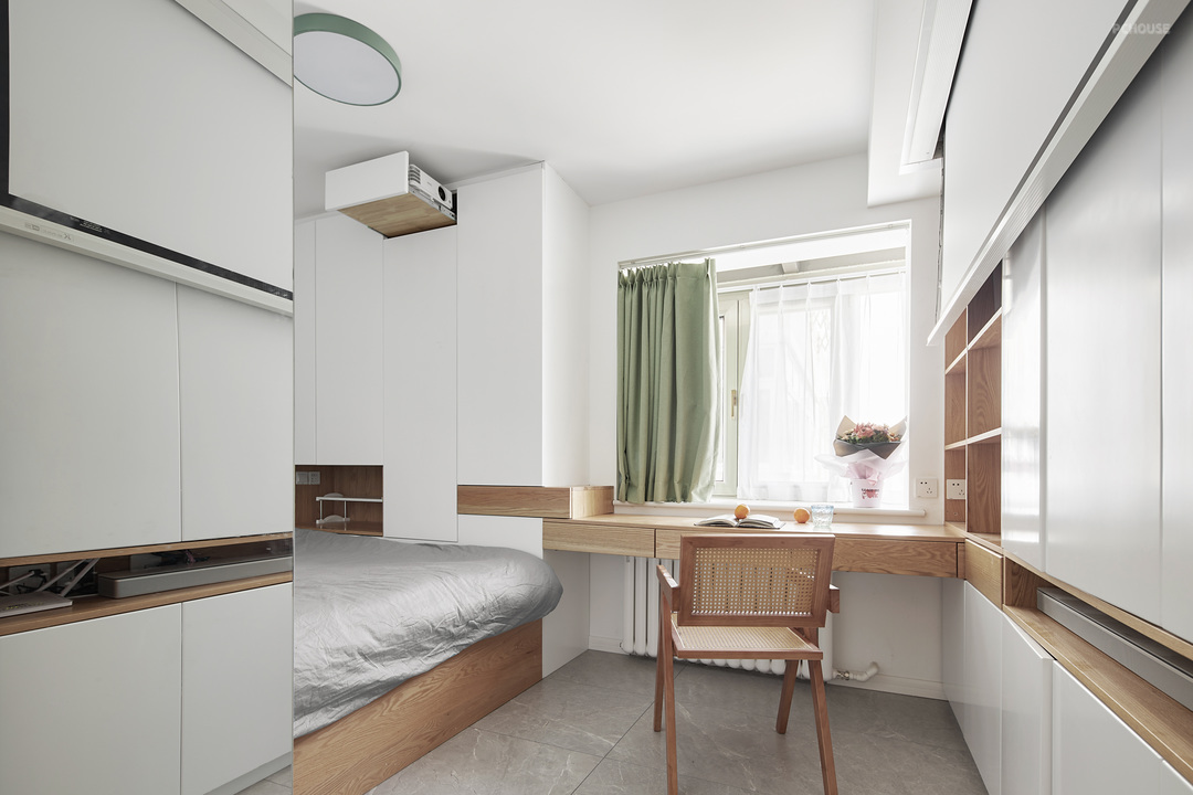 睡眠区两侧分别做了到顶的储物柜,可以收纳起来的投影机更加灵活,平时推进柜体,视觉上不占用空间,柜体书桌相互的咬合和材质的变化与统一让空间融为一体,物体与物体间不再孤立,相互联系,丰富视觉感受增加空间层次