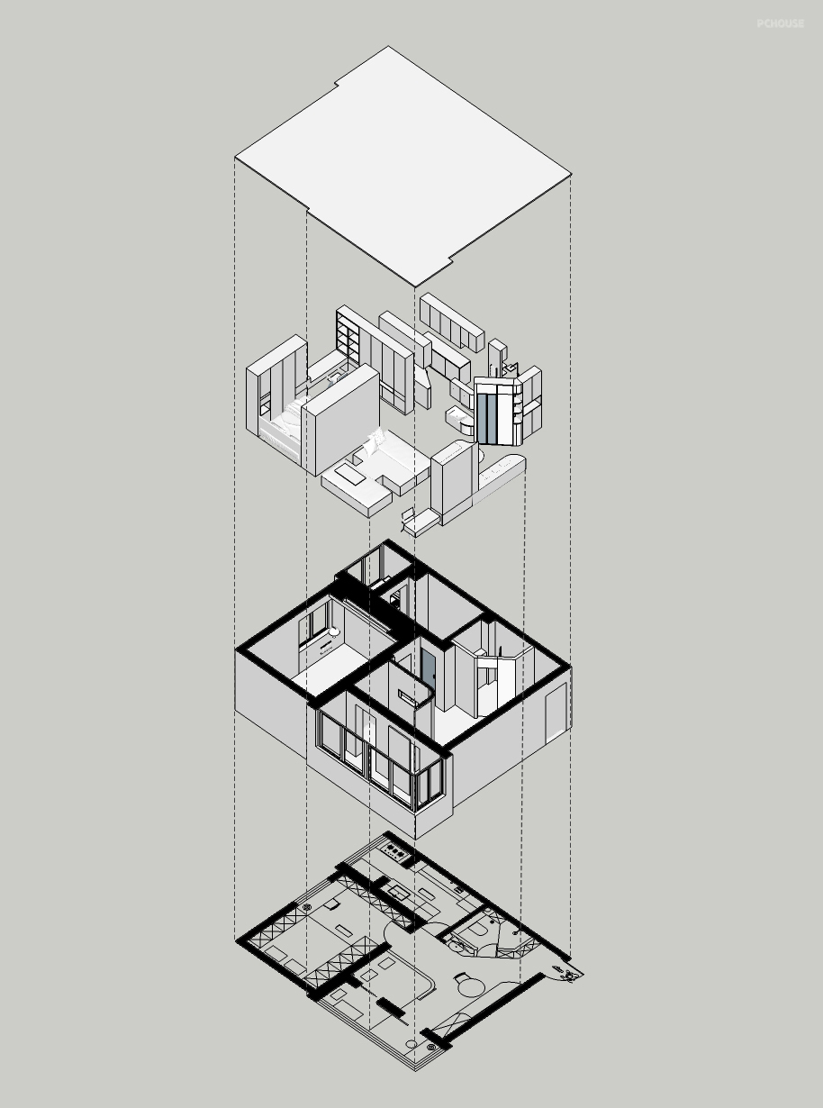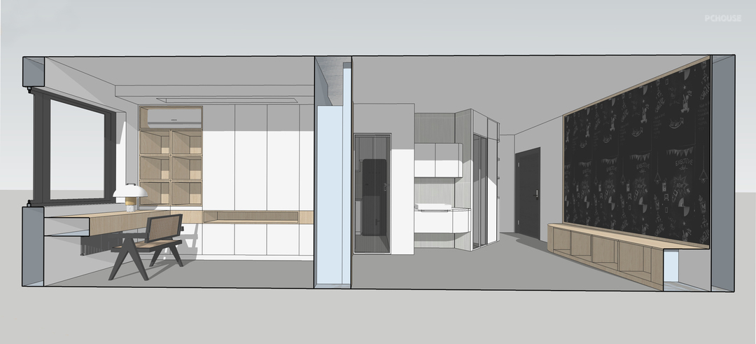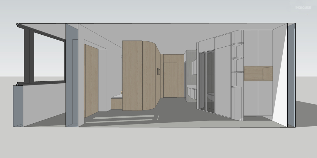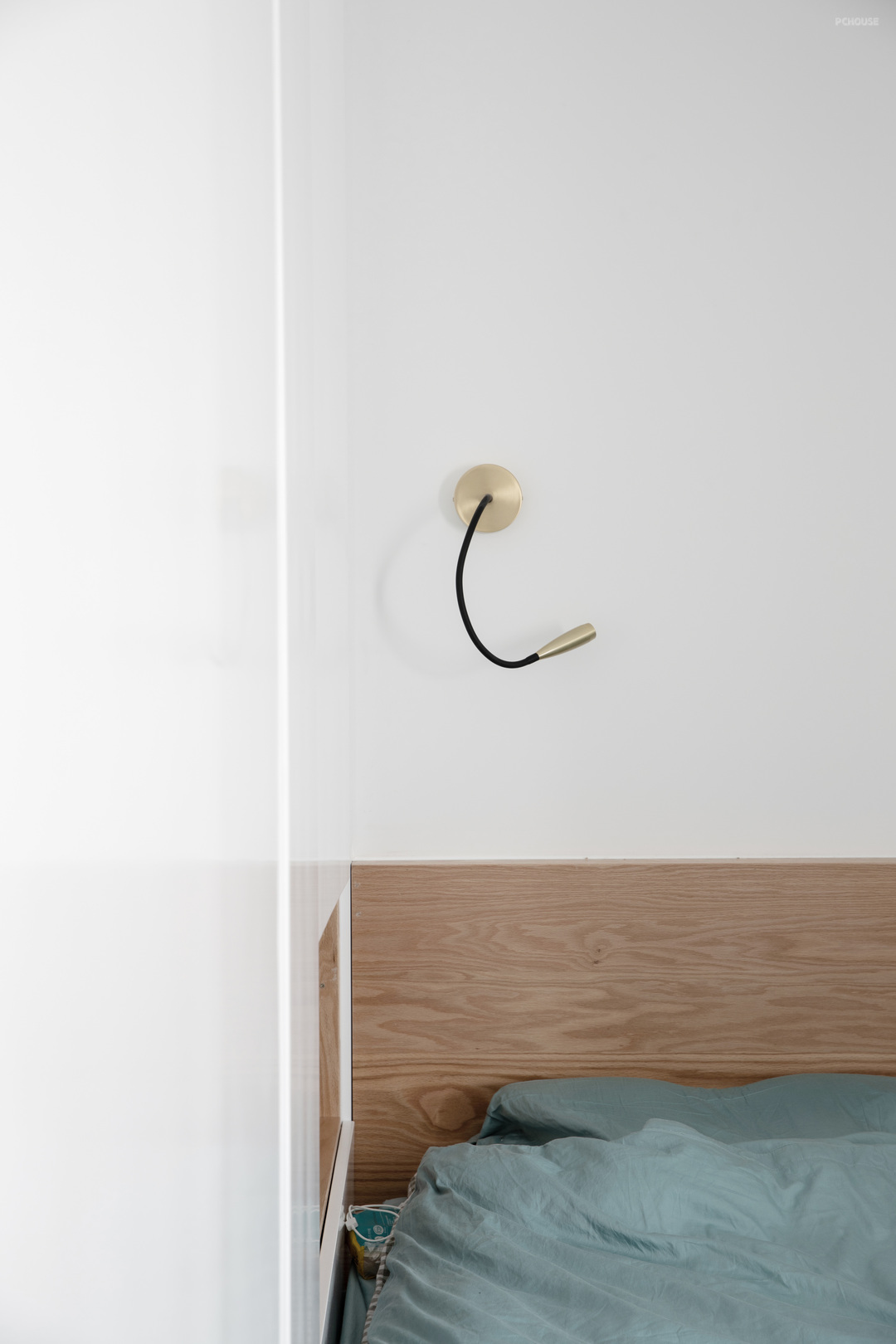 次卧利用“盒子的设计手法”置入空间,连接阳台扩大睡眠空间,形成空间内的空间,阳台与次卧客厅间共有两道门,闭合以后可以形成独立的“第三睡眠空间”打开以后又可以拓展次卧的空间,可以灵活自由切换,次卧通过木饰面材质的统一,在空间中形成独特的体量感