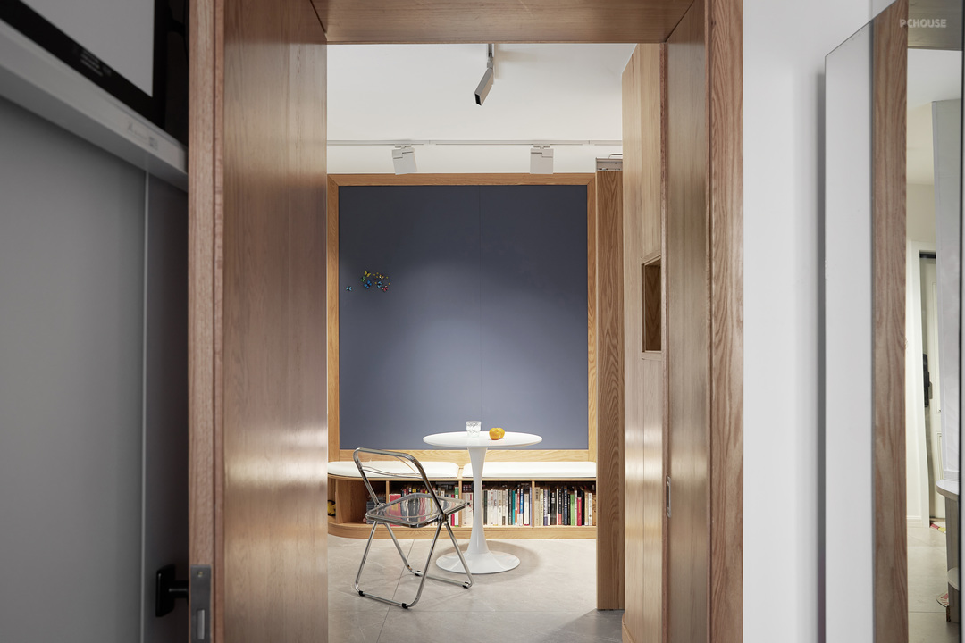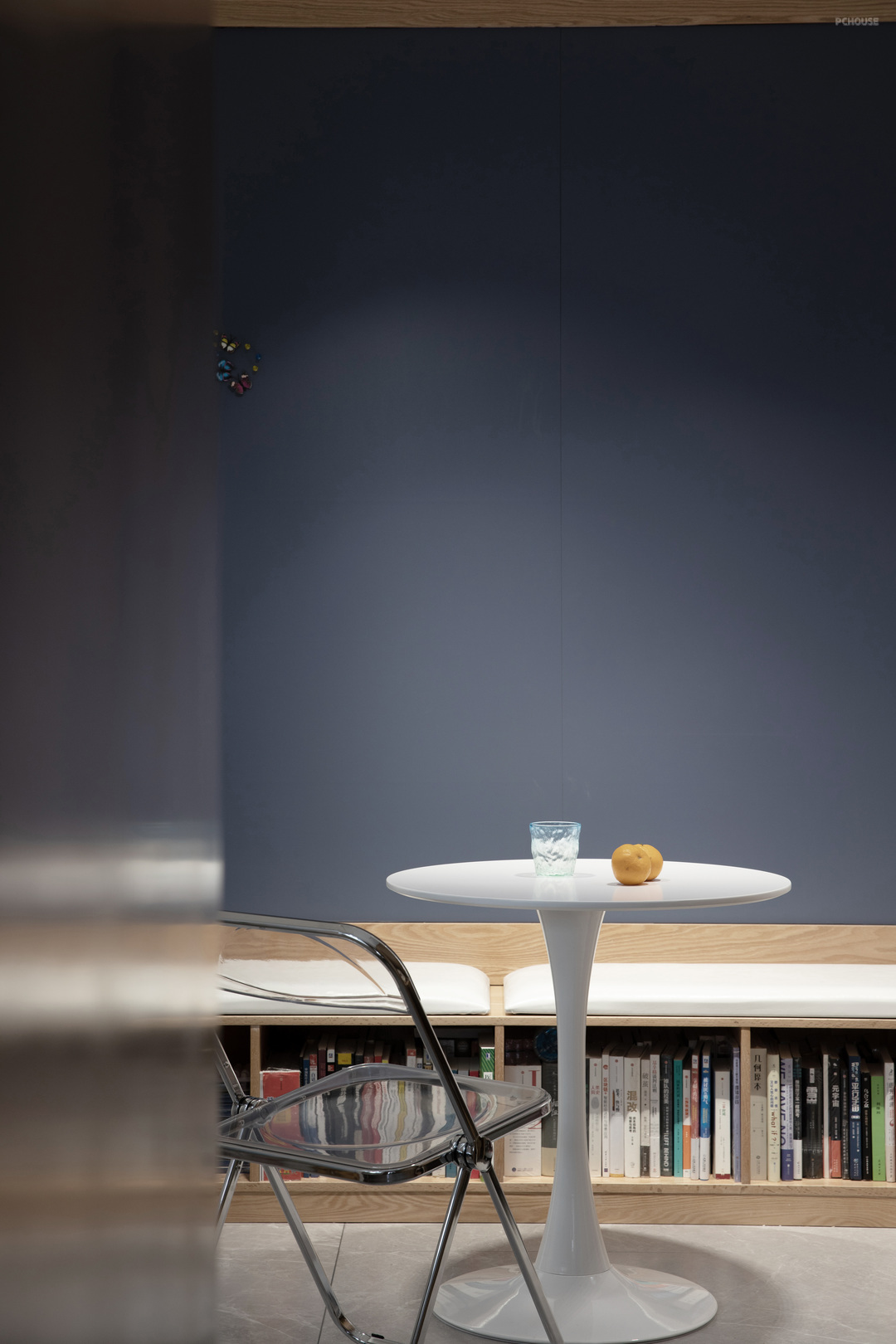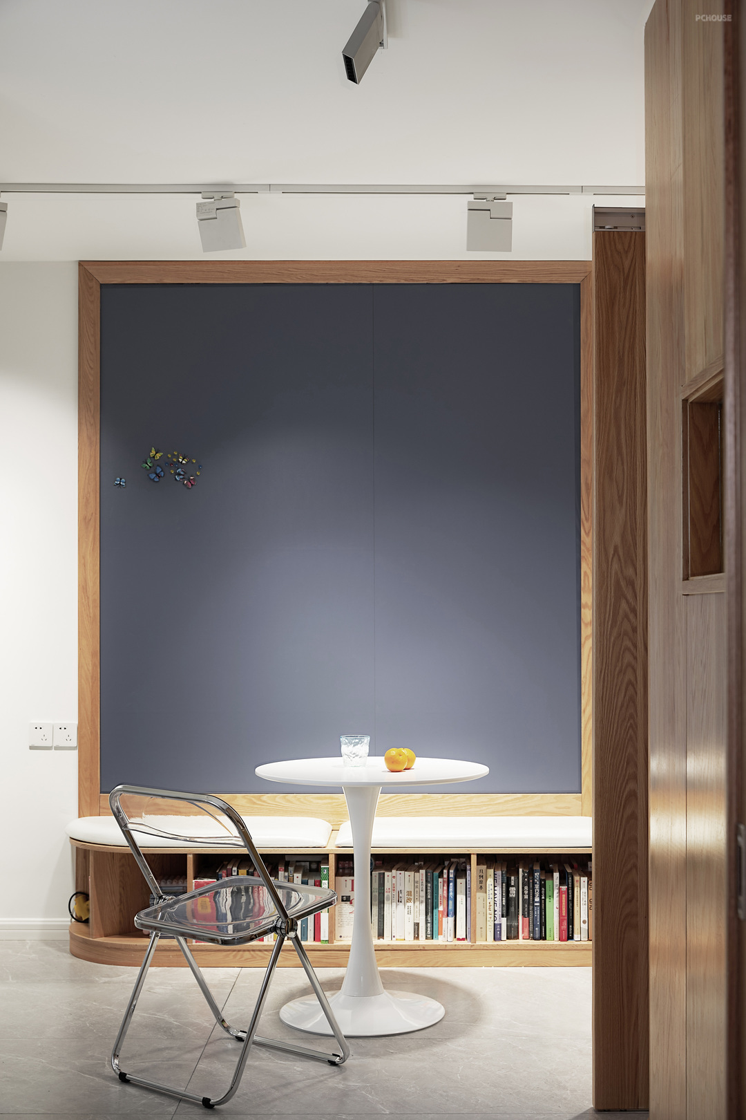前期主要是两口人居住,很少做饭,圆形餐桌可以满足日常简单用餐,同时不占用空间,圆桌没有阳角的影响保证动线的流畅,黑板墙给小朋友提供了创作空间,卡座下方做敞开书柜,收藏的书籍可以随时拿来阅读!