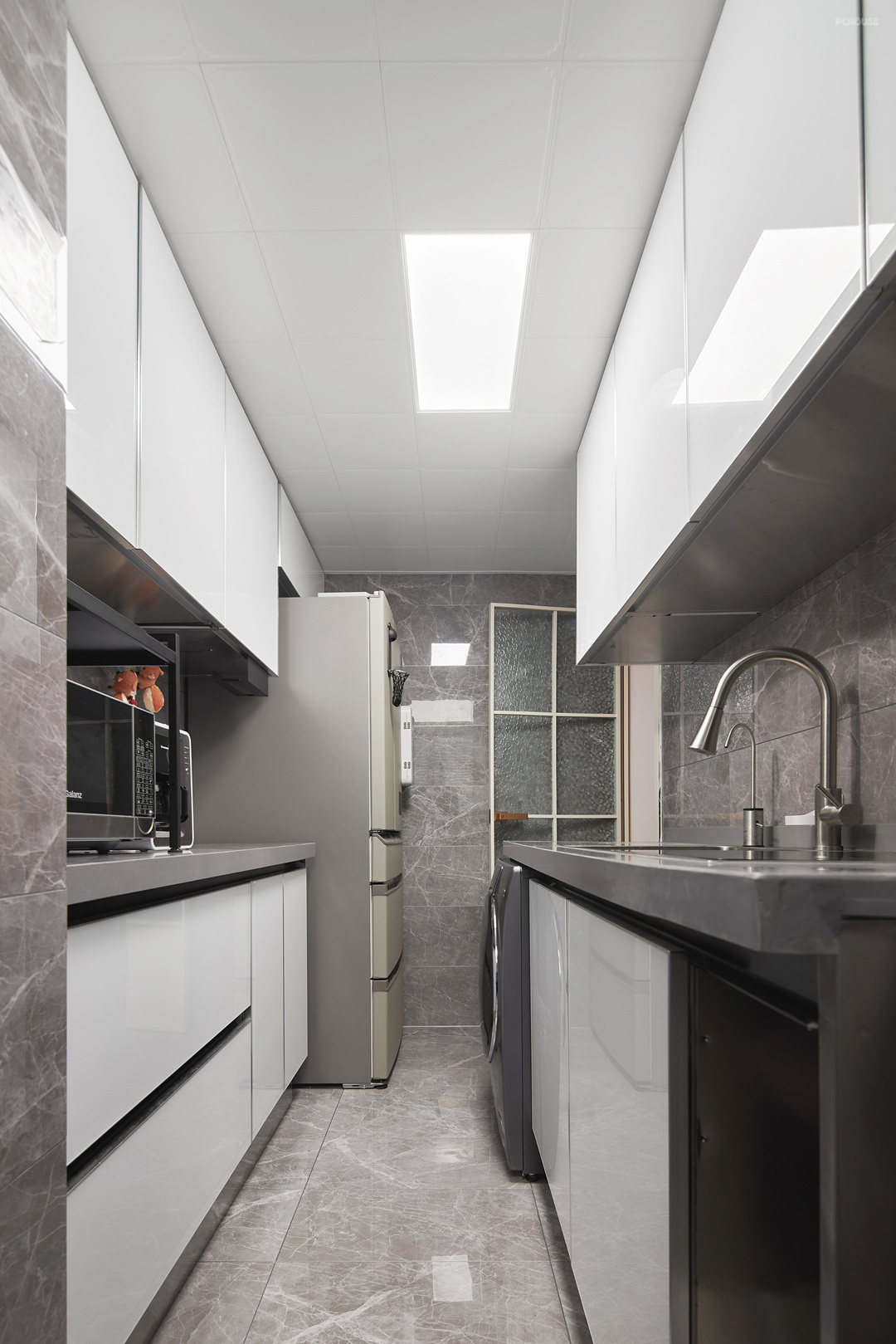 橱柜整体材质以不锈钢打造,应要求厨房整体色调更加男性化,灶台外移到阳台以后,留出了更多的操作空间和储物空间