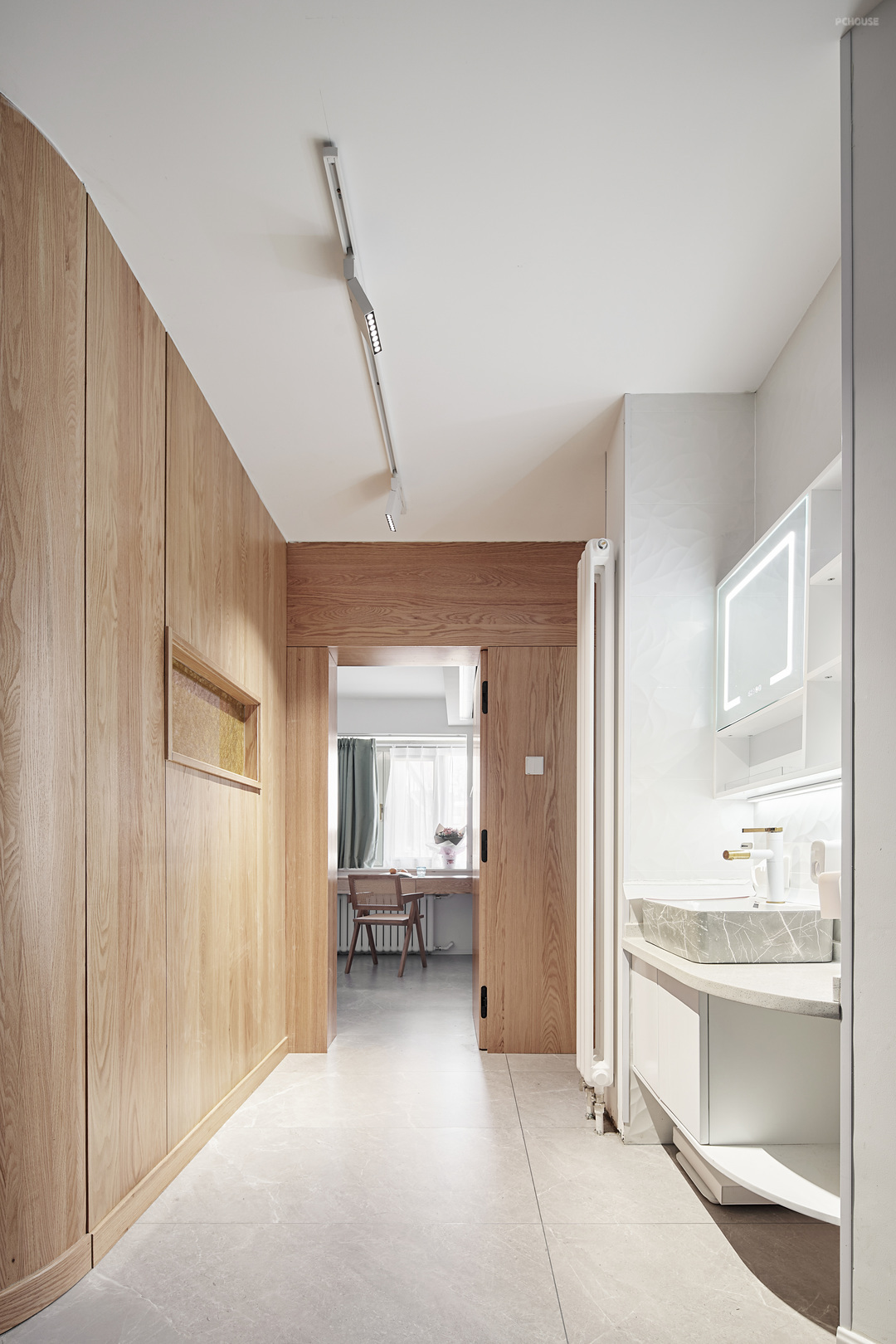 1.第二个睡眠区利用“盒子的设计手法”置入空间,连接阳台扩大睡眠空间,形成空间内的空间,阳台与次卧客厅间共有两道门,闭合以后可以形成独立的“第三睡眠空间”打开以后又可以拓展次卧的空间,可以灵活自由切换,通过木饰面材质的统一,次卧在空间中形成独特的体量感 2.卫生间去除原来的阳角做斜切,优化空间动线,随着墙体的形状做玄关柜储物,洗手池外置做“干湿分离”