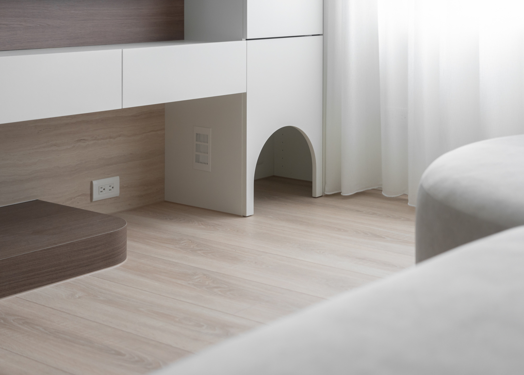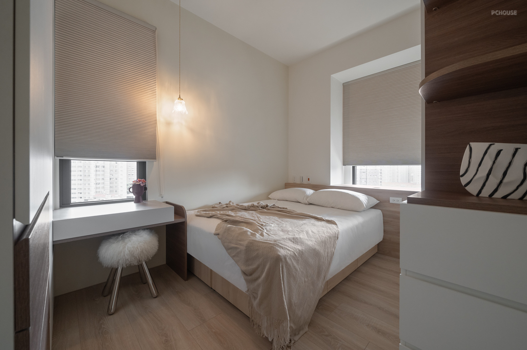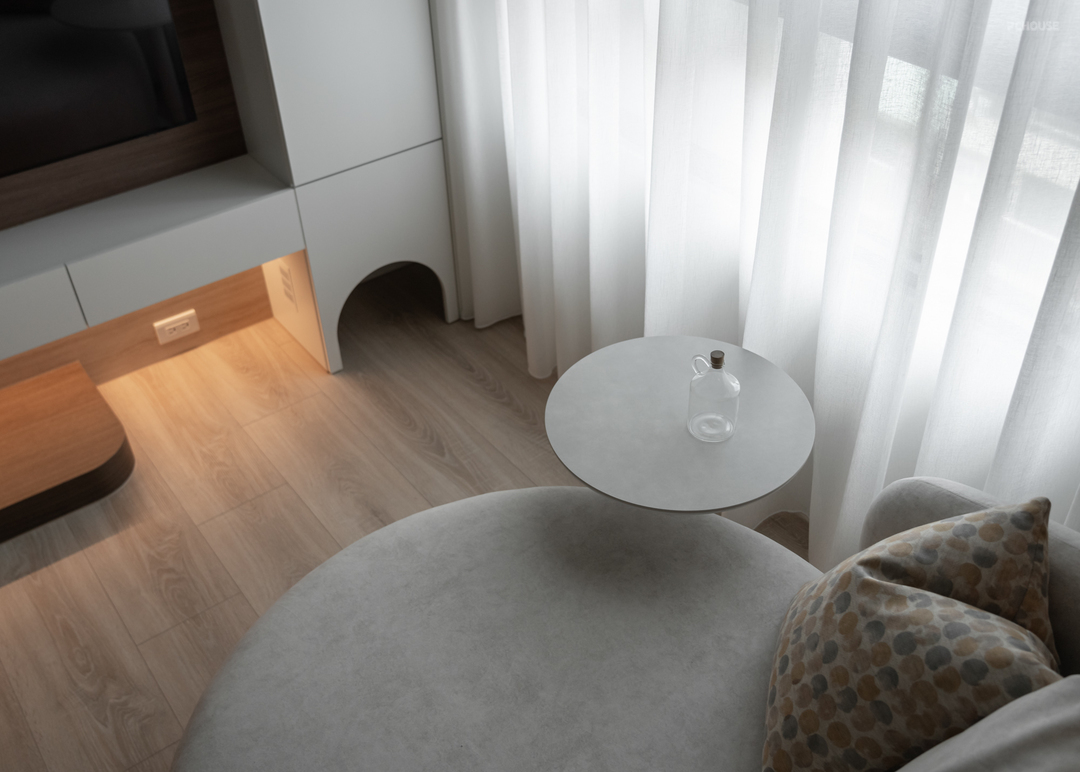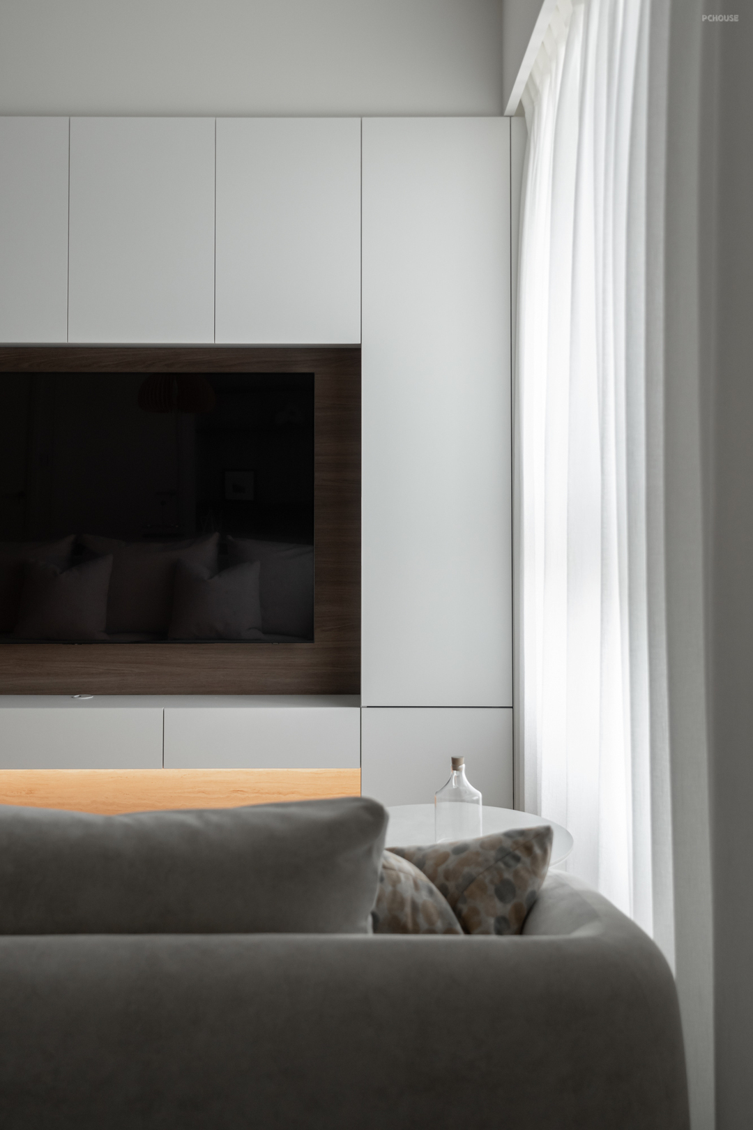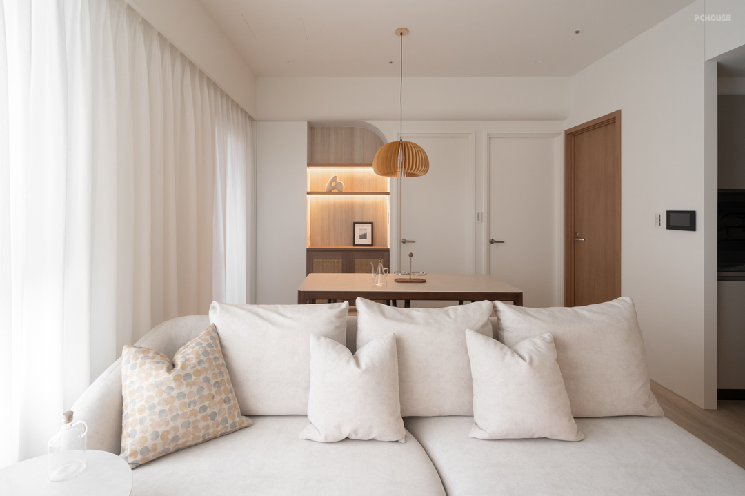 垂地的纱帘则化解了原始窗型的侷限,透过延伸的连续性,营造大窗的视觉效果,同时柔化光影,使氛围更显纯净。
