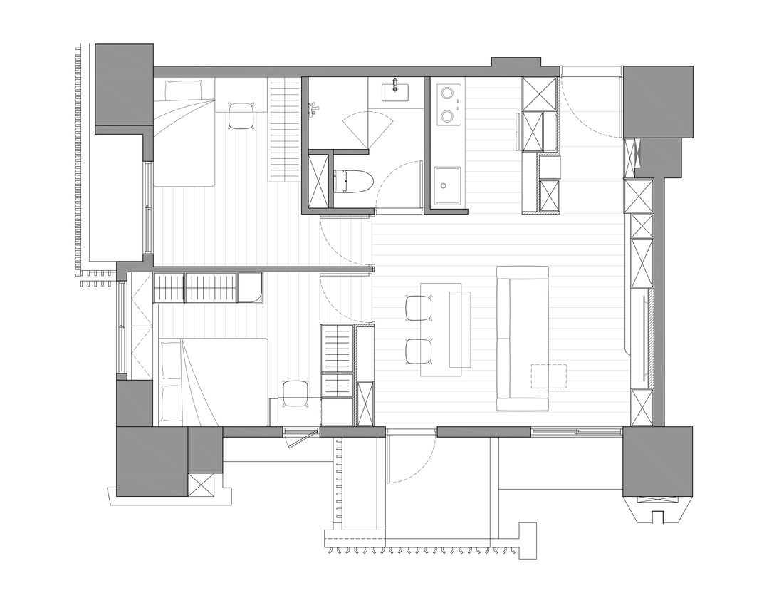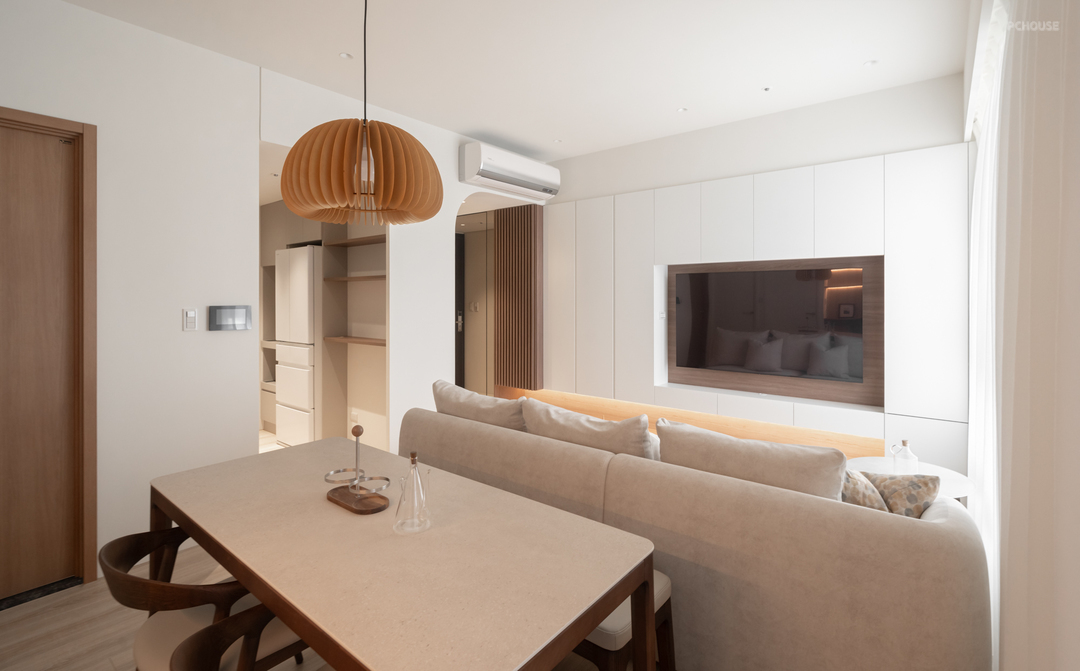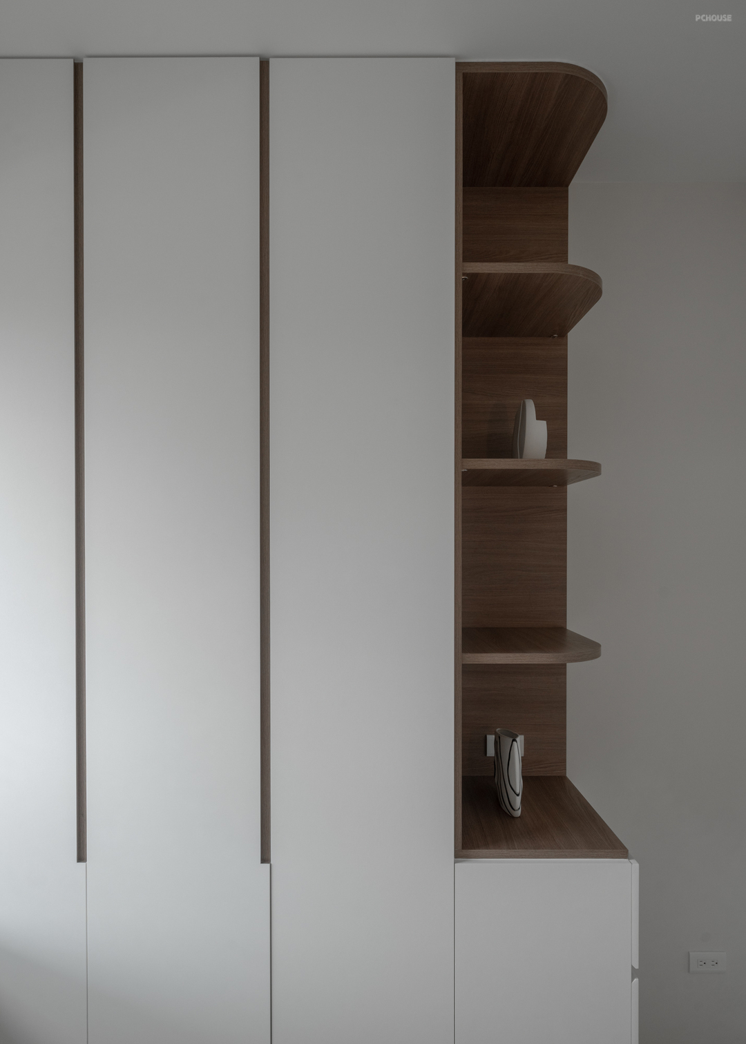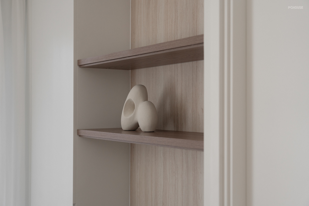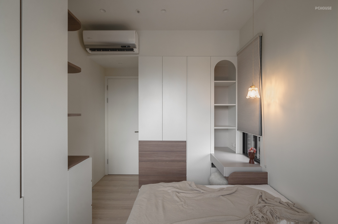 垂地的纱帘则化解了原始窗型的侷限,透过延伸的连续性,营造大窗的视觉效果,同时柔化光影,使氛围更显纯净。