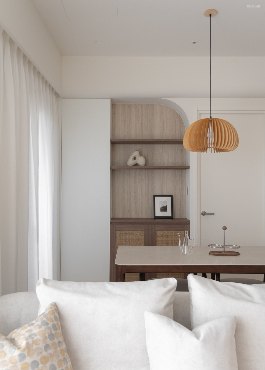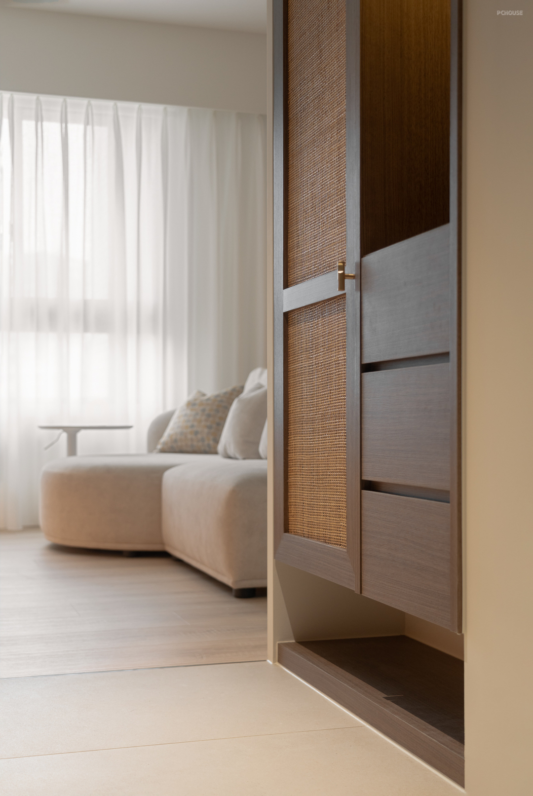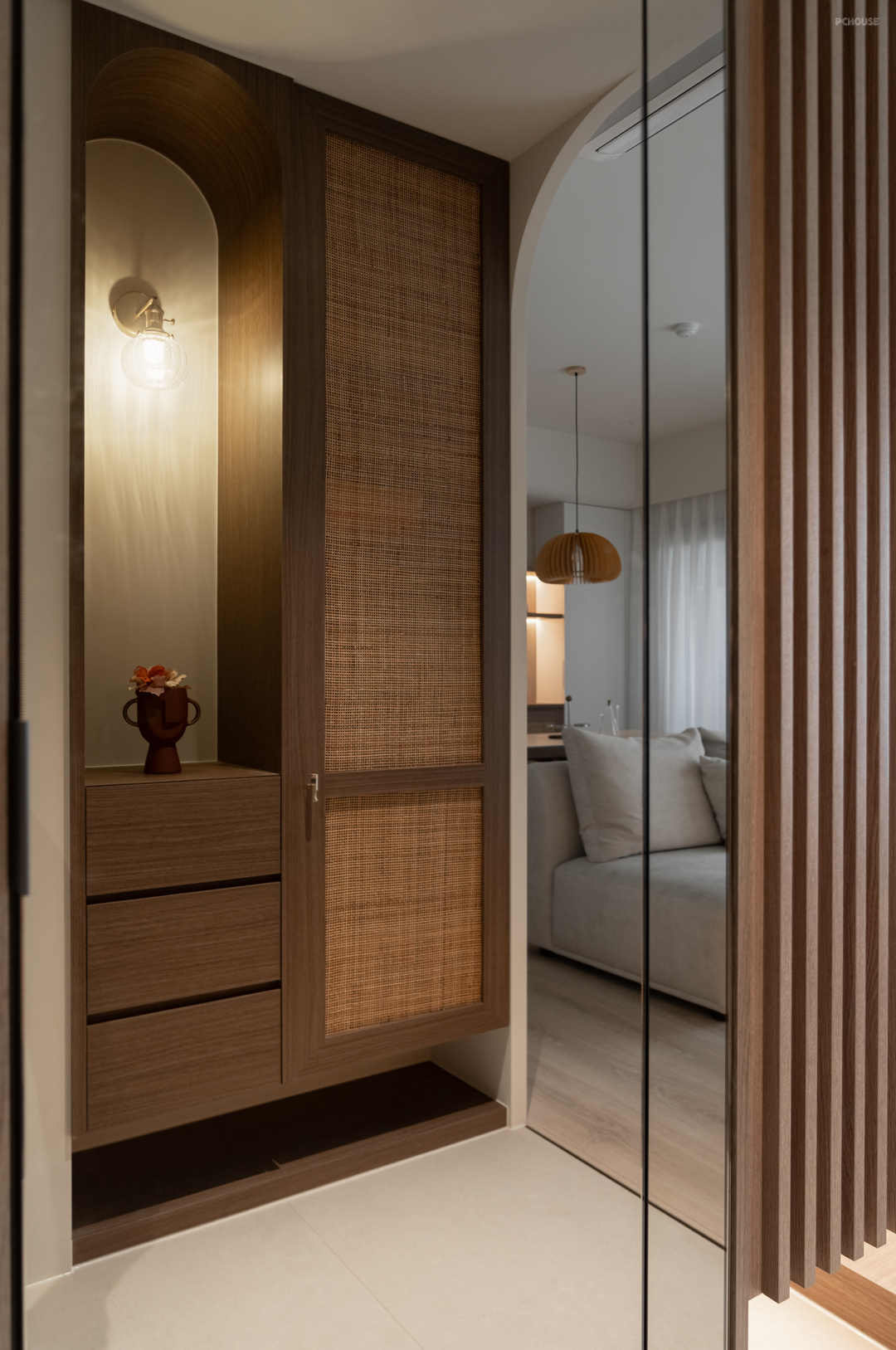 入室的玄關,木質與藤編交織出溫潤的氣息,拱形語彙在此拉開序幕。