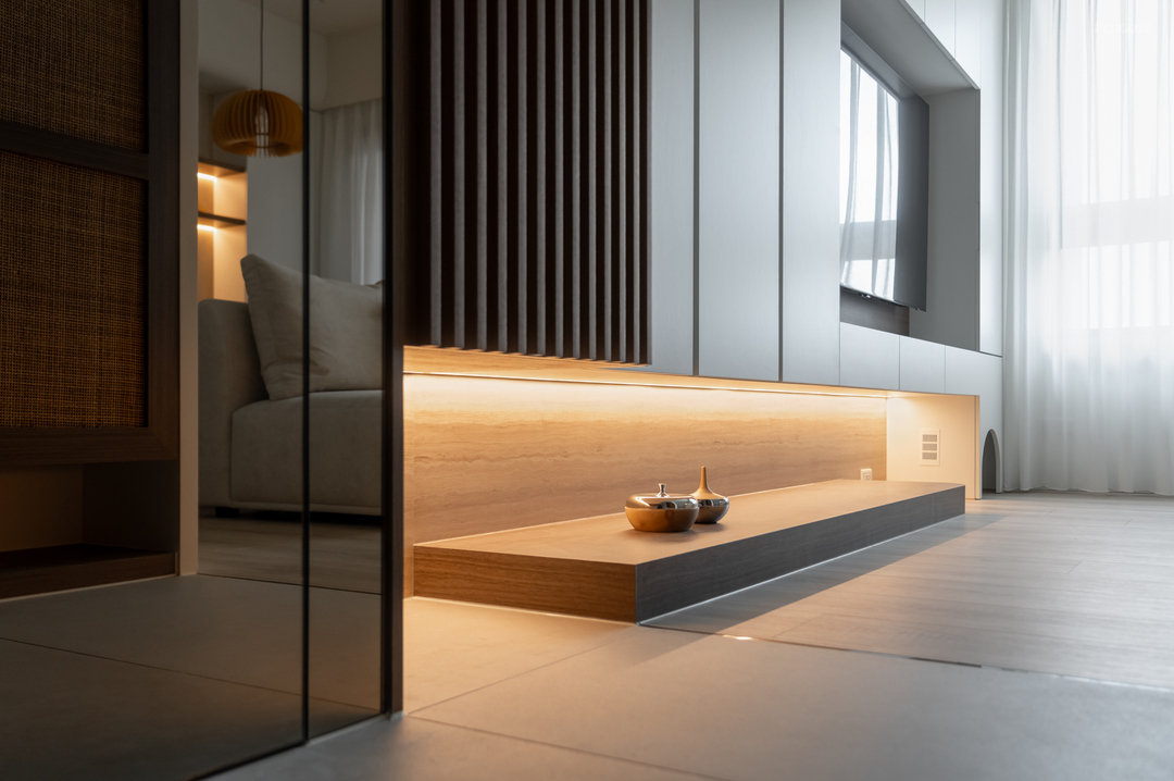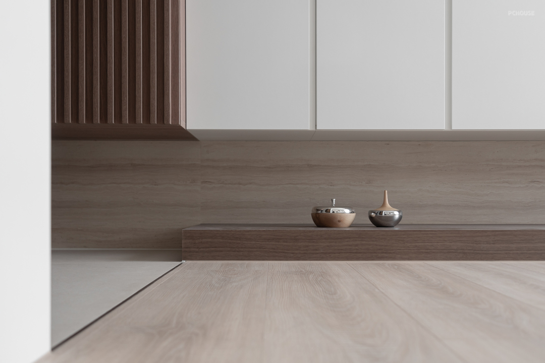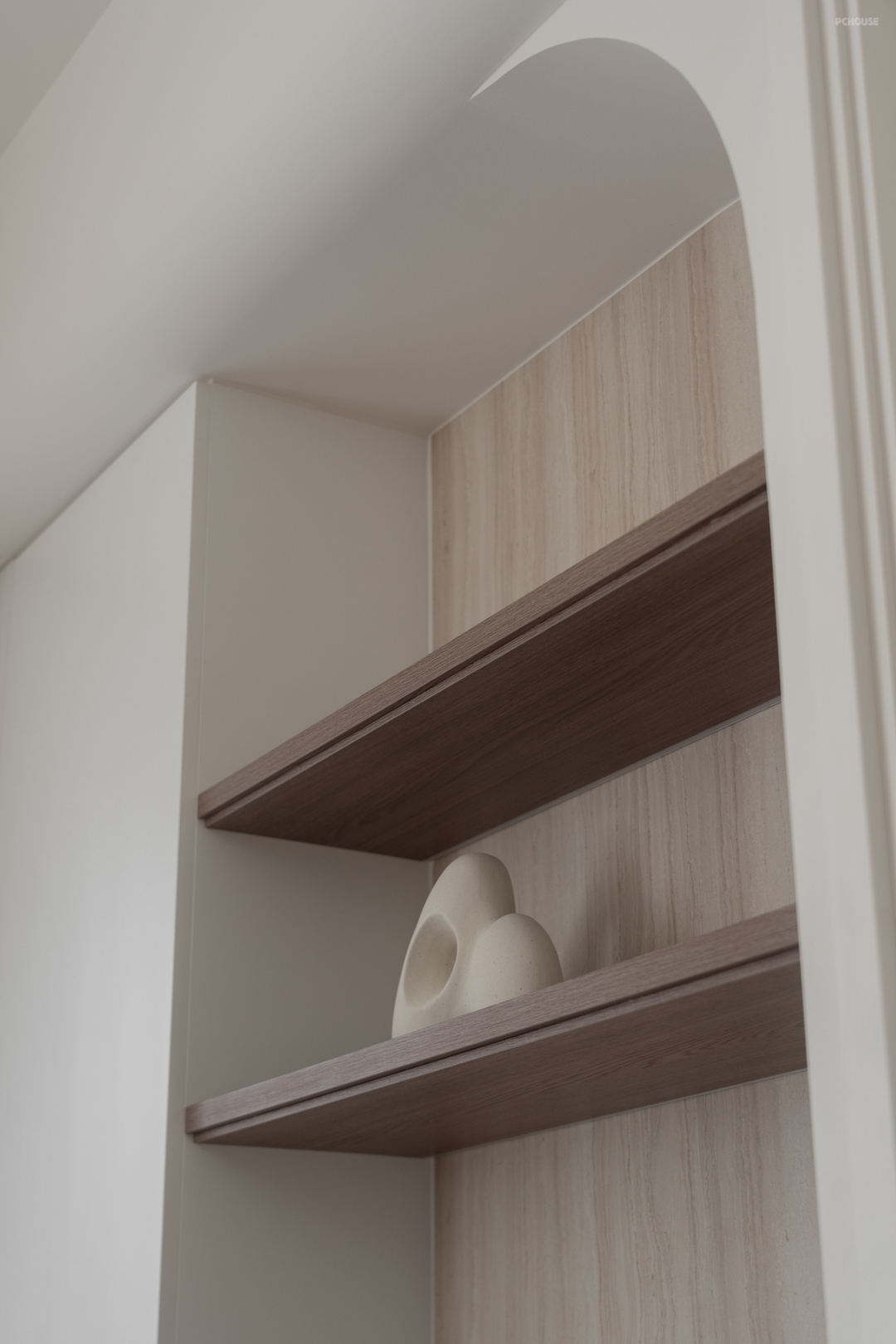 入室的玄關,木質與藤編交織出溫潤的氣息,拱形語彙在此拉開序幕。