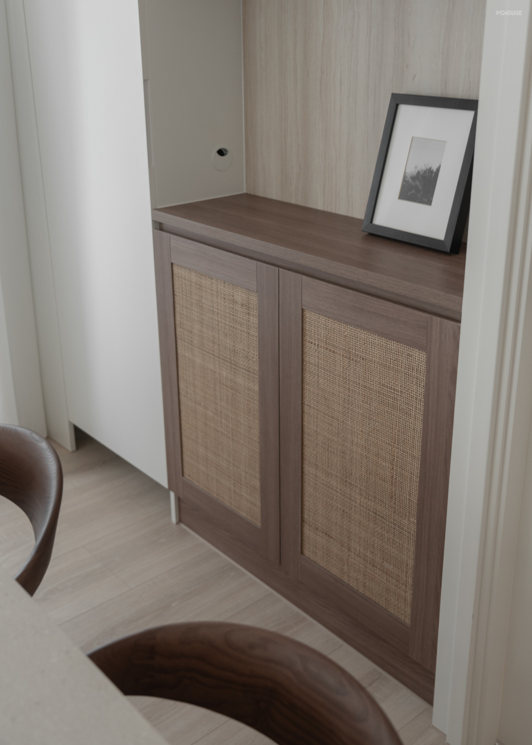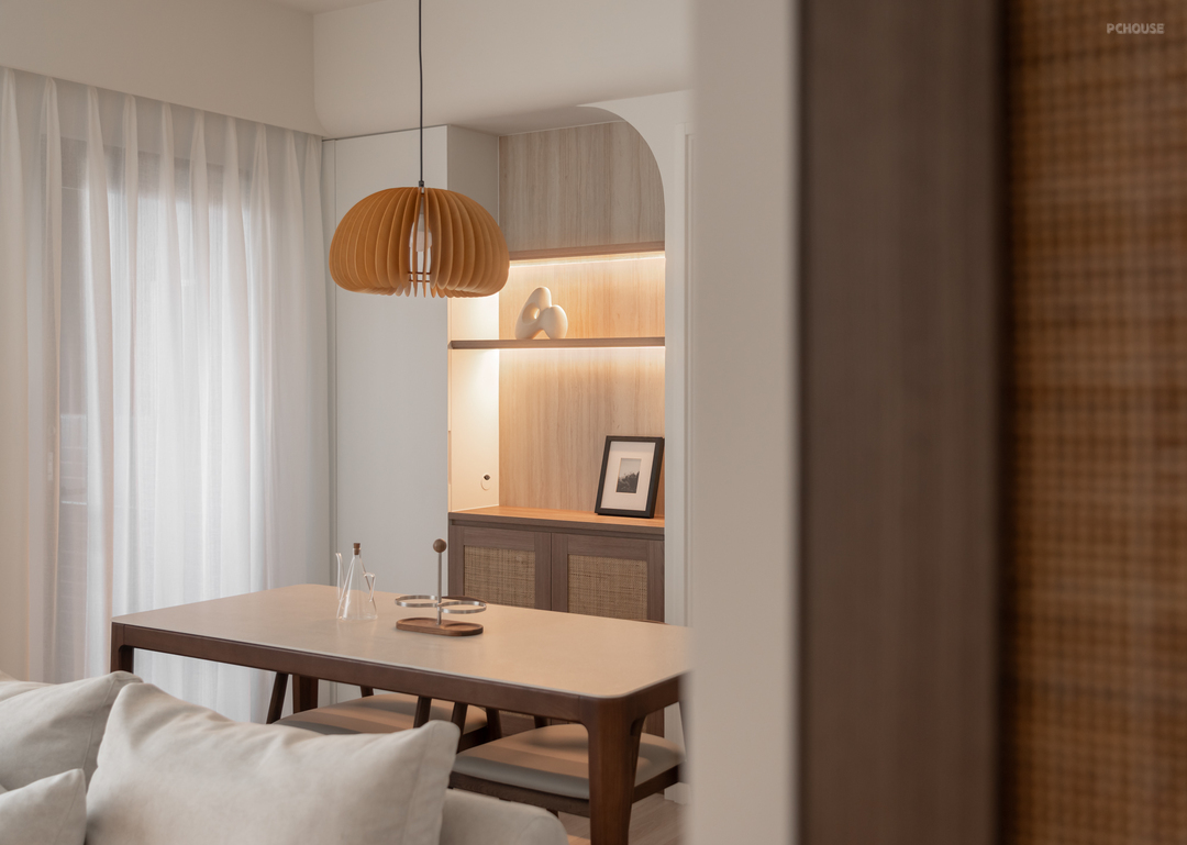 餐厅延续木质调与藤编语汇,背墙结合开放层架与间接照明,既是收纳背景,也是日常里的氛围衬托。