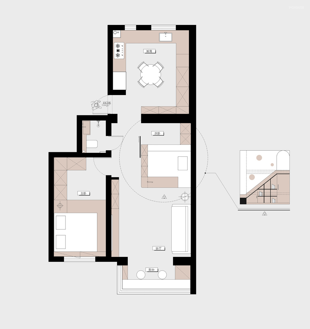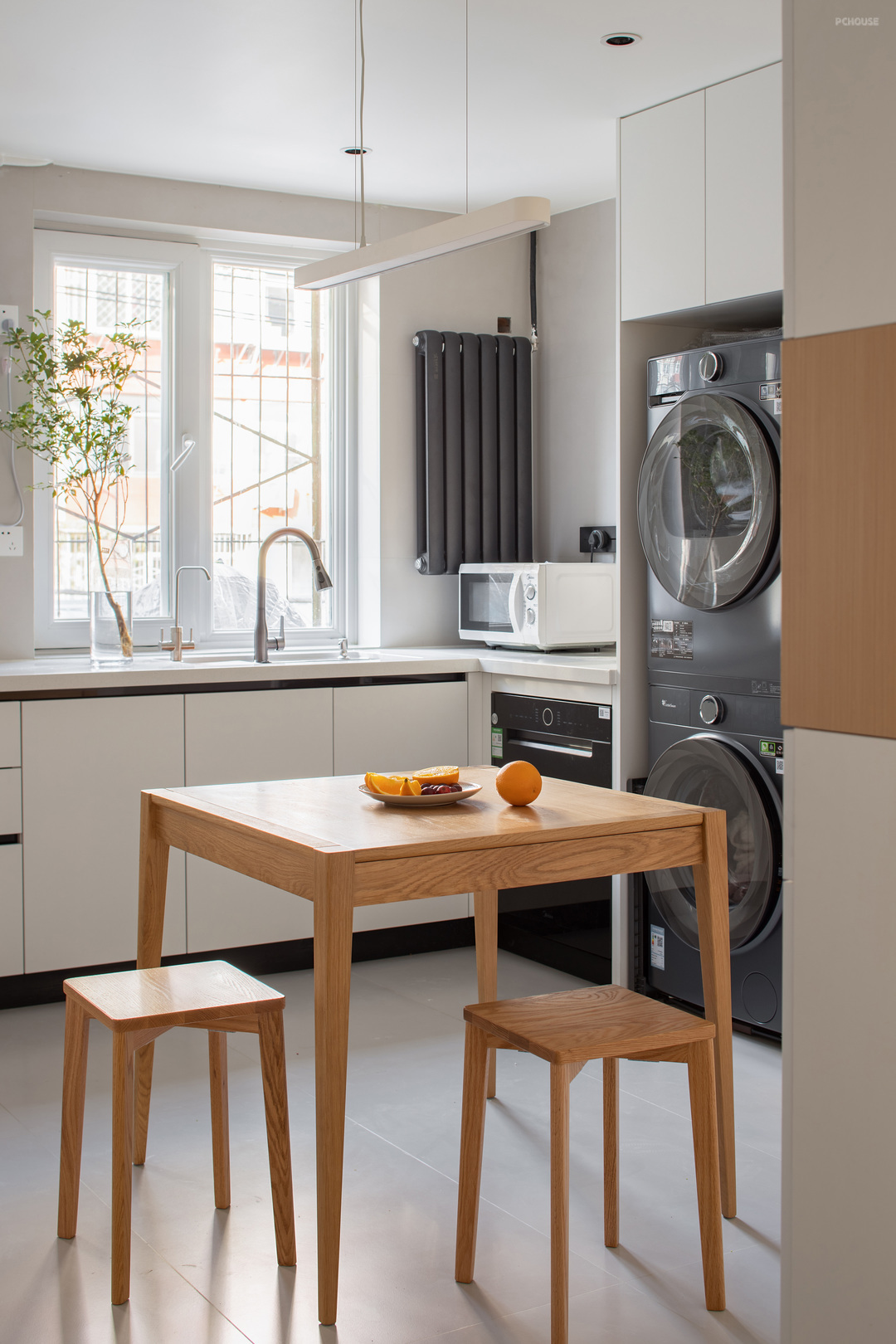 3:出于这两方面的考虑,直接把功能区做了调换,次卧通过盒体的形式挪到了客厅,餐桌移到了厨房,很好的解决了上边提到的设计问题!