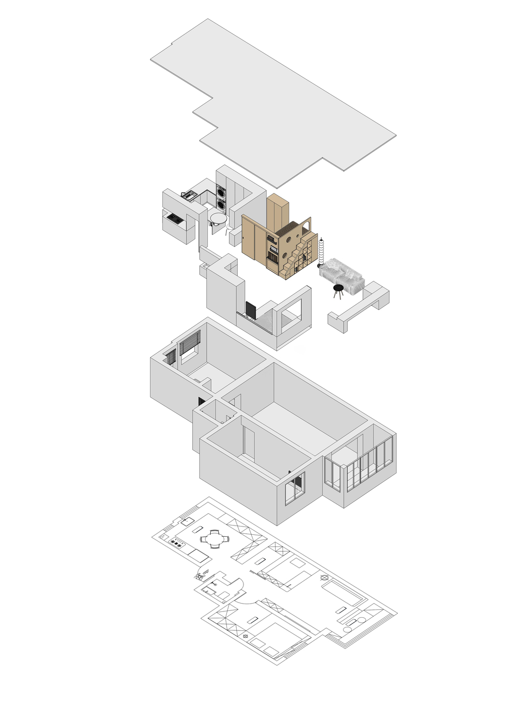 5:客厅放置多功能盒子作为外婆与小朋友的居住空间,将趣味和功能融为一体