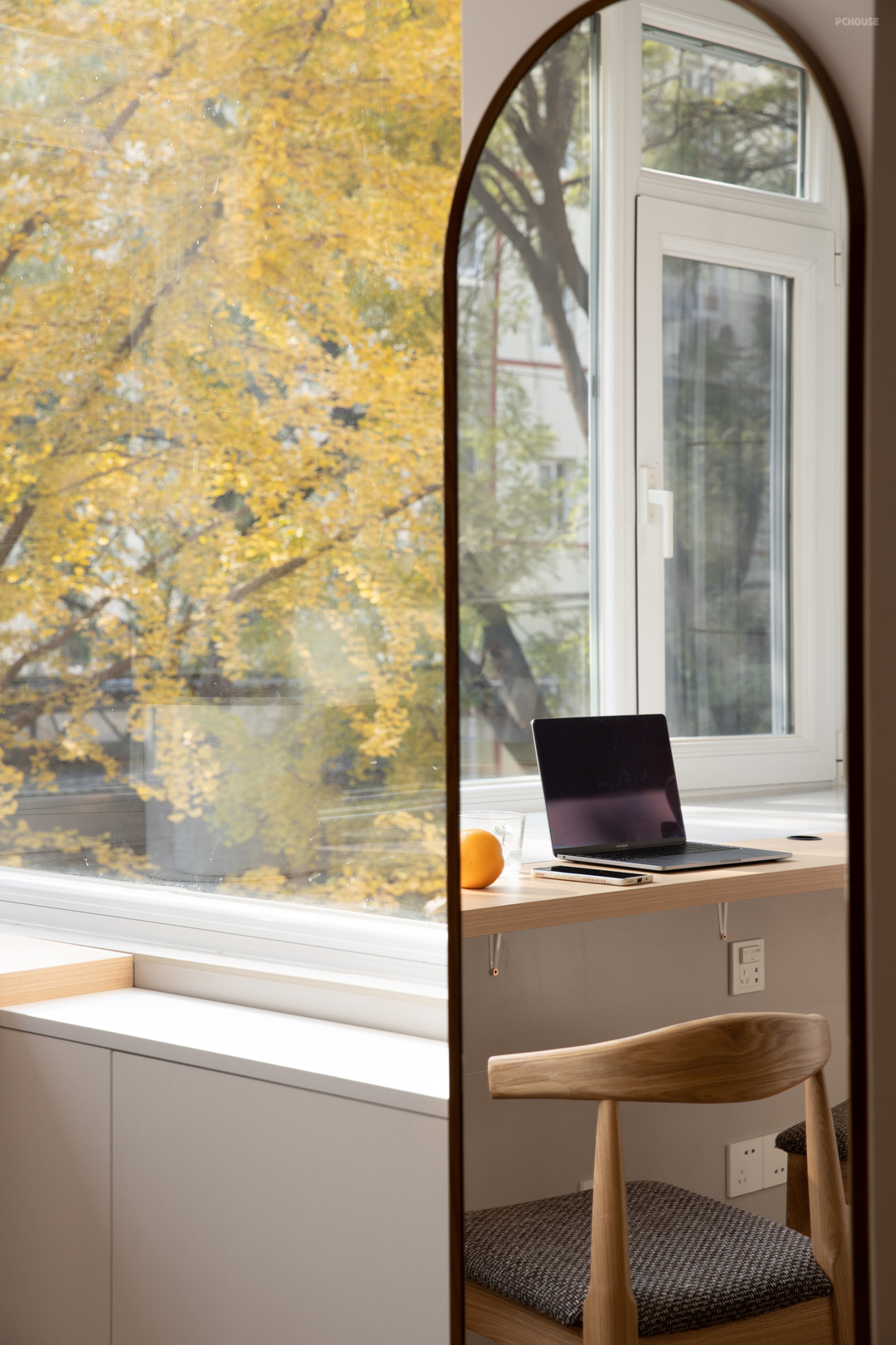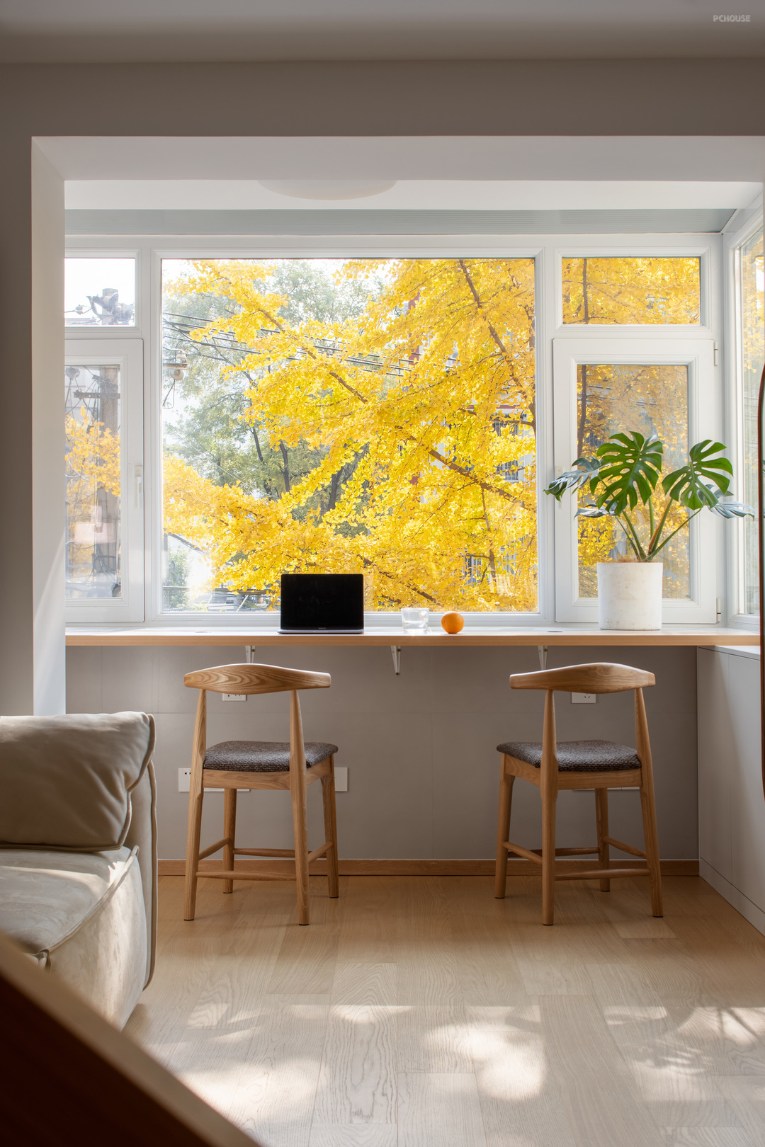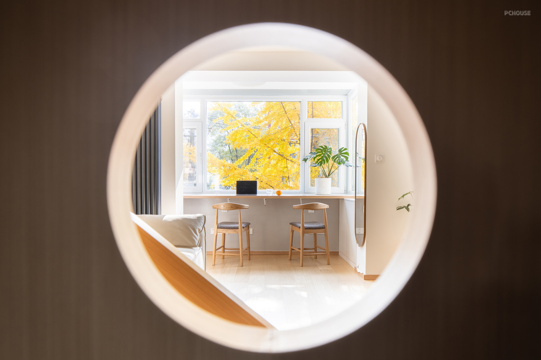 2:立面正对阳台窗户,圆形孔洞相当于画框,可以很好的将秋景“引”入室内