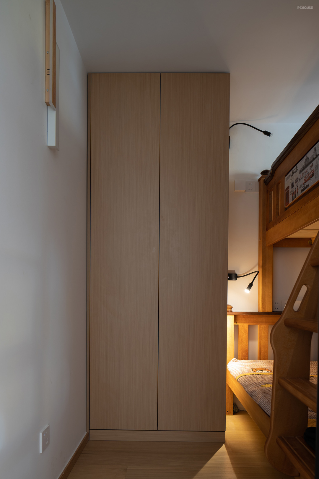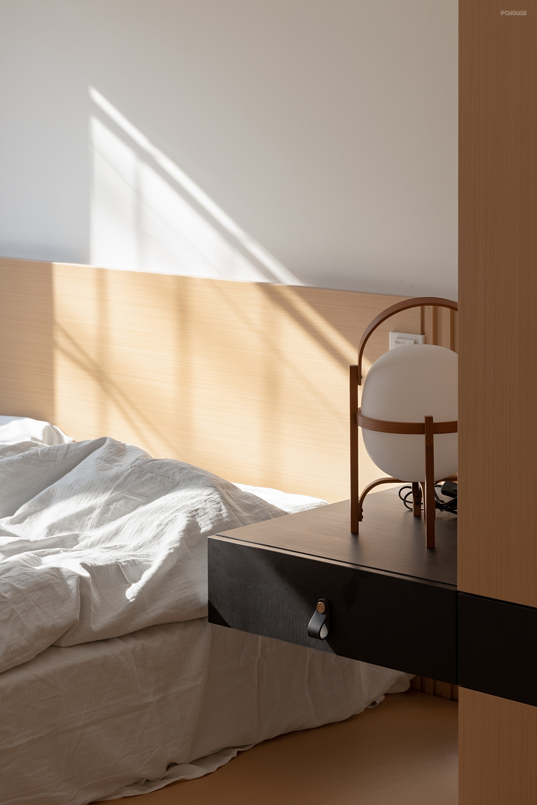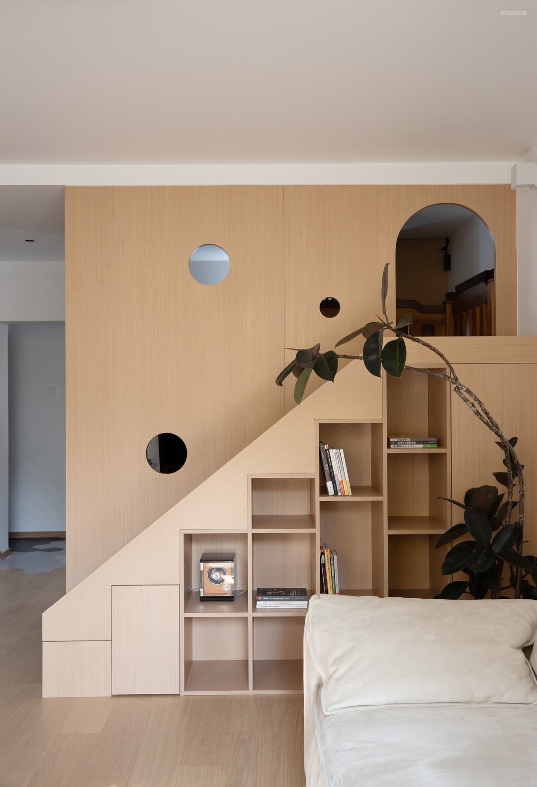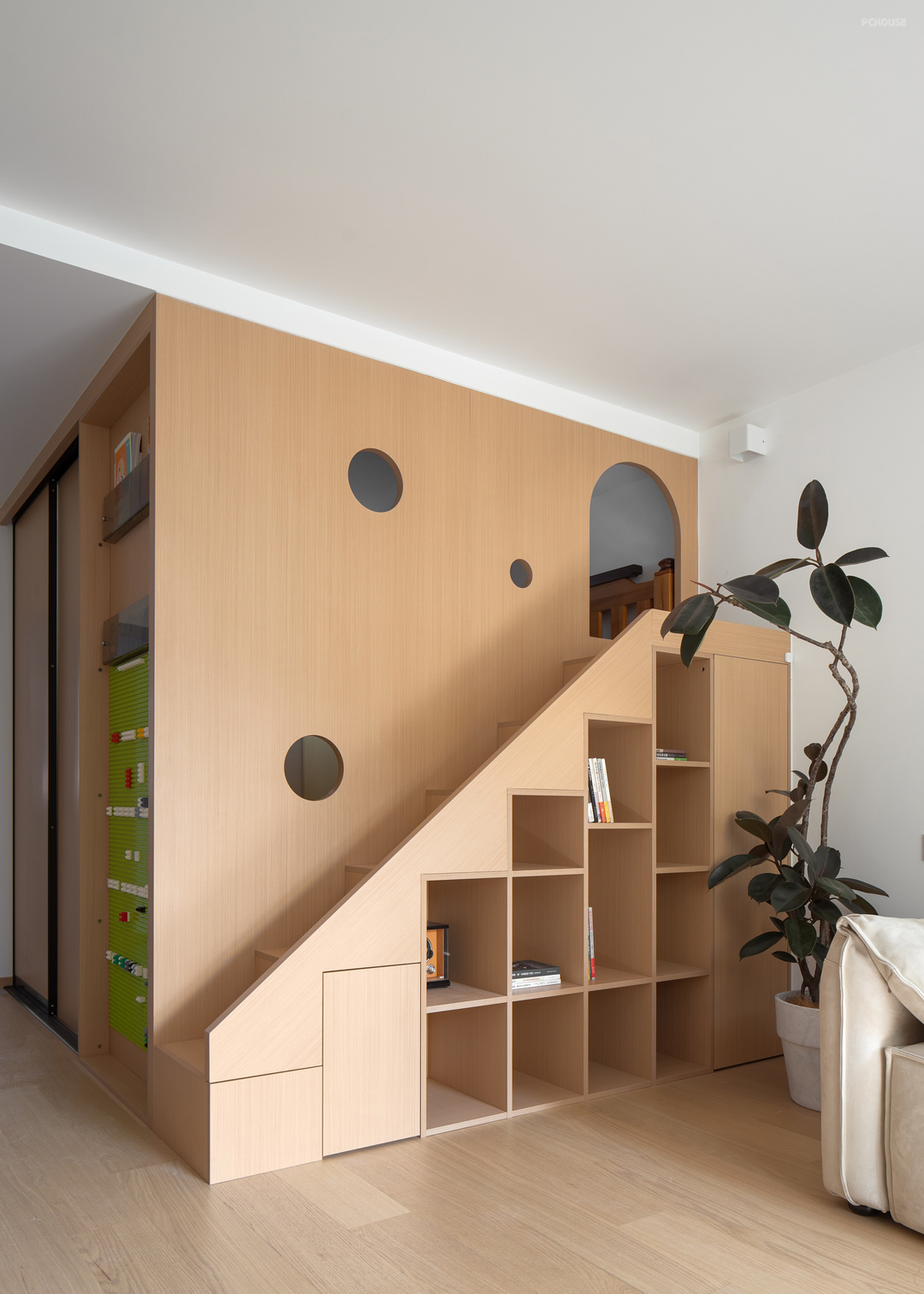 客厅放置的多功能盒子作为老人与小朋友的睡眠空间,孔洞不仅可以将光线引入室内,还增加了空气的流通,小朋友阅读的区域和楼梯结合到一起,充分利用空间,楼梯连接了次卧与客厅,为整个空间增添了一些童趣,小朋友可以自由的在两个空间里穿梭玩耍!床头灯方便阅读起夜。