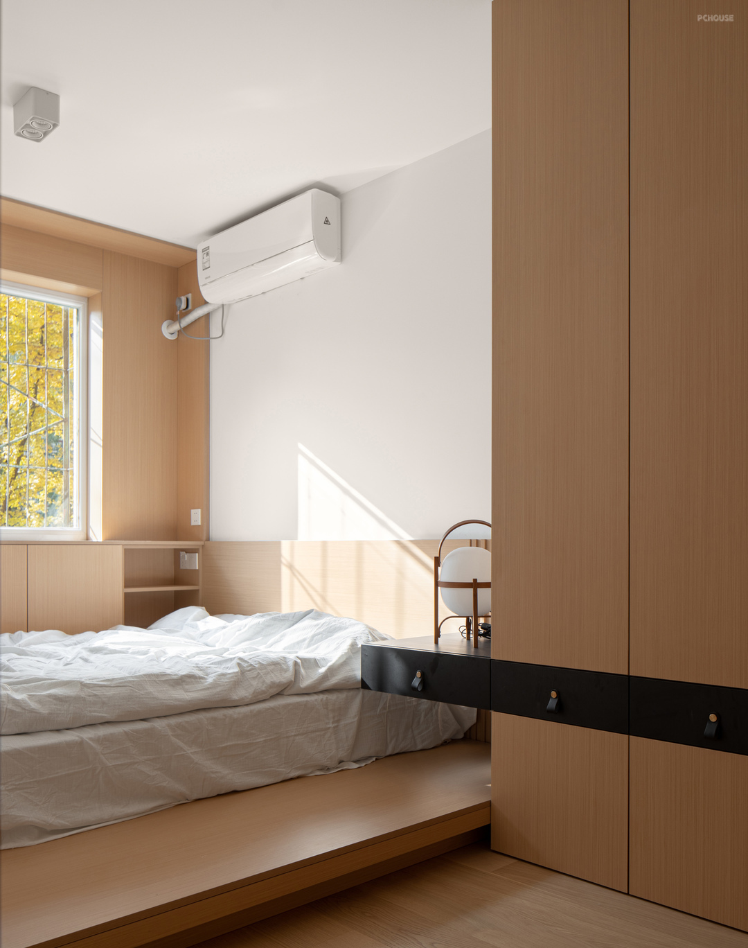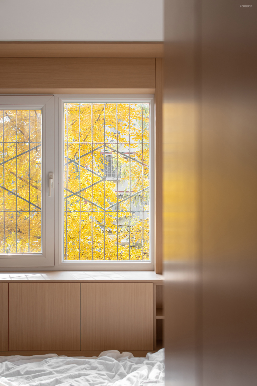 图1:主卧室窗户用木饰面进行墙顶地的统一包裹从而达到“框景”的效果,可以将窗外的秋景更好的引入室内。