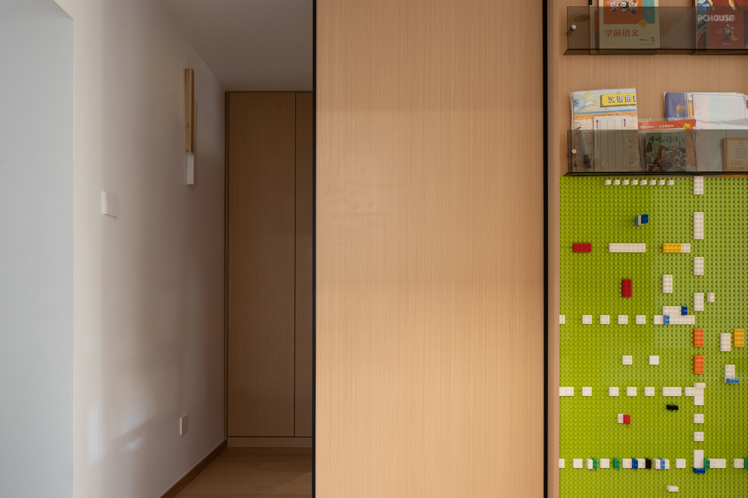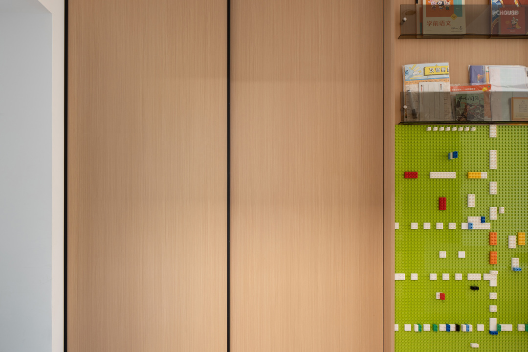 次卧推拉门一侧还内嵌了书架和乐高拼图