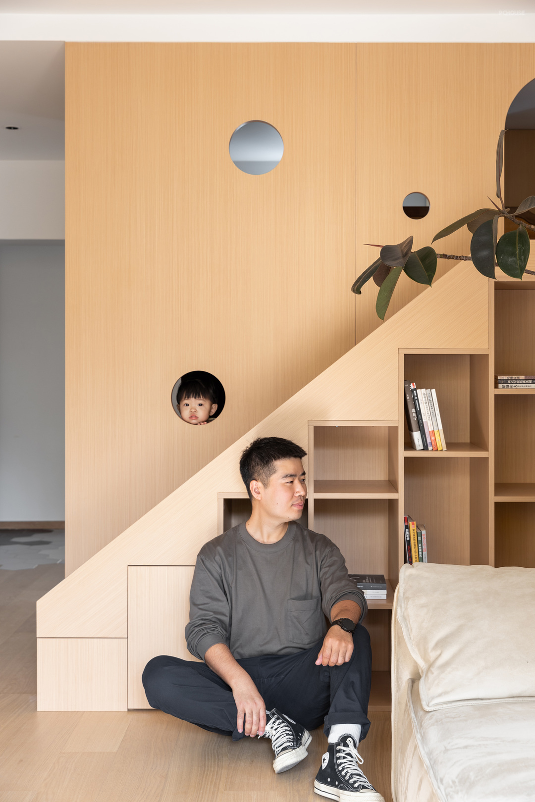 刚睡醒的小朋友真的是太配合了,在摄影师按下快门的同时恰好探出头来观察外边的情况,被摄影师捕捉到了这有趣的瞬间! 设计师与小朋友合影