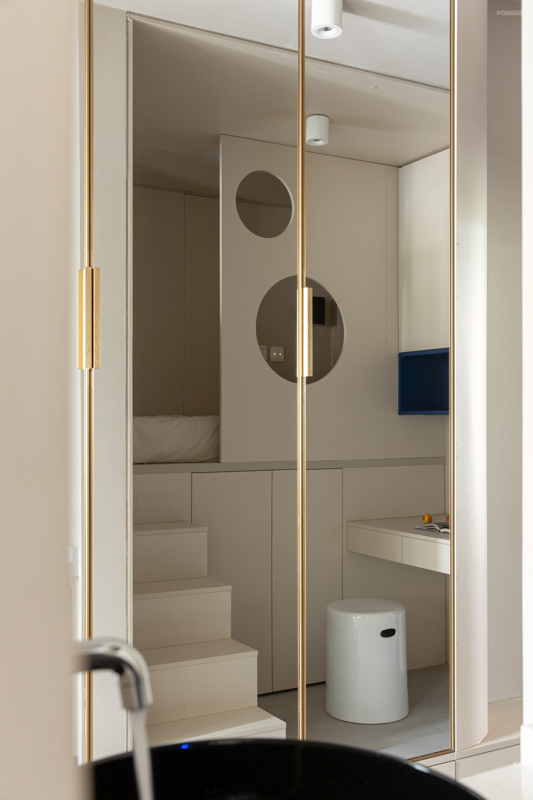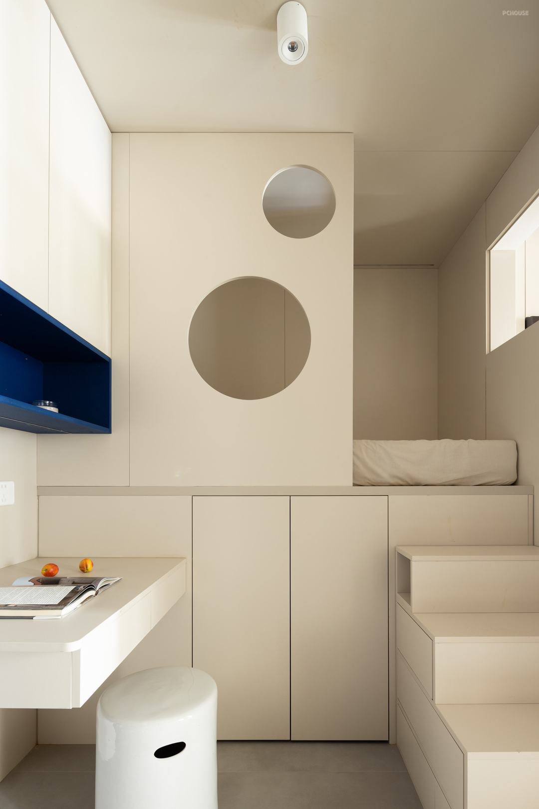 儿童睡眠区同样抬高,下做储物,增加储物楼梯方便上下床,面向北边窗户一侧留了采光窗,光线可以很好的到达睡眠区,睡眠区的圆形洞口可以更好的通风,睡在里边不觉的闷,也方便和外边的环境、人产生互动,儿童睡眠区也可以理解为一个完整的“盒体”,在里边切割出所需要的功能空间