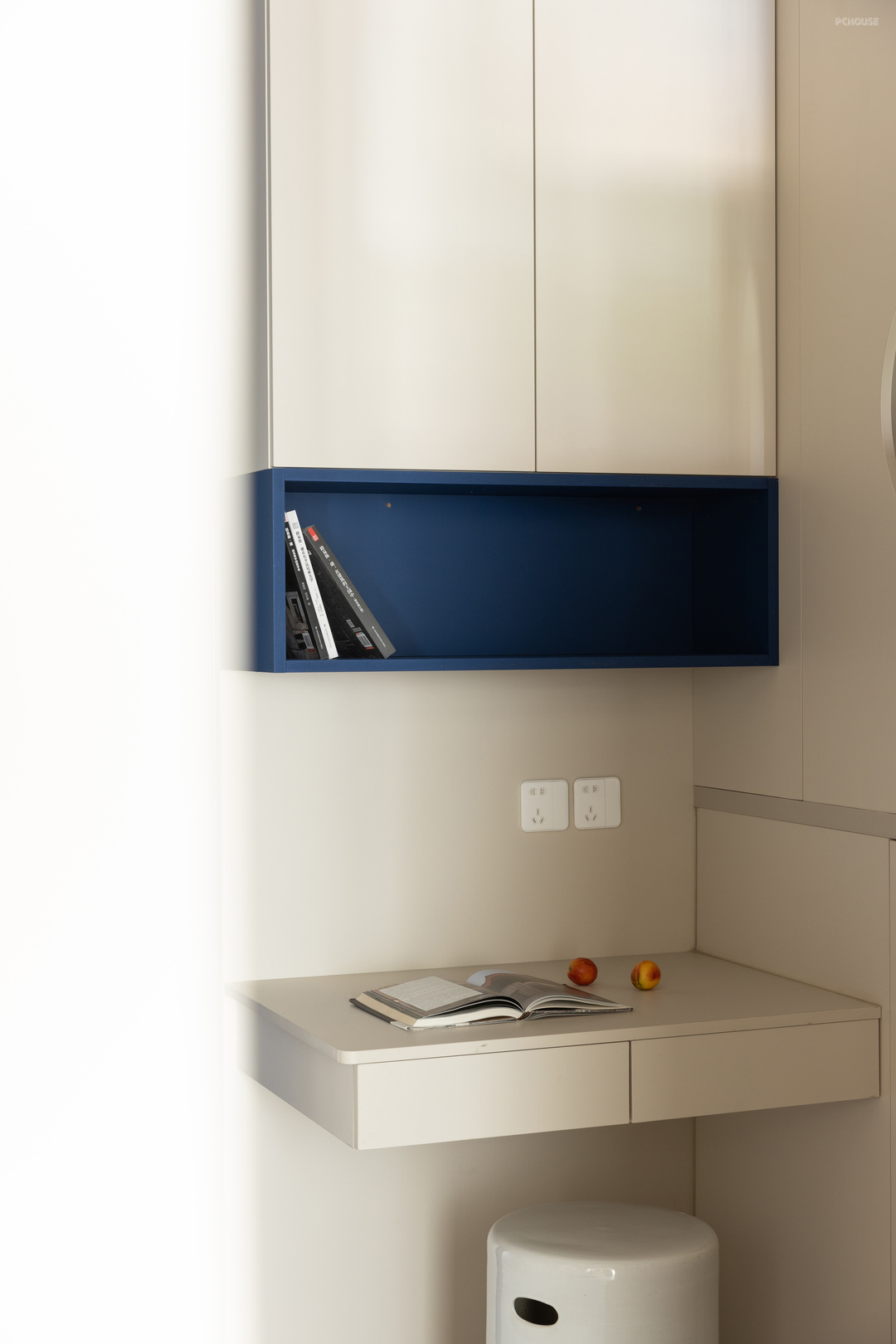 儿童睡眠区旁边就是学习桌,满足平时小朋友的学习、阅读,吊柜和抽屉用来收纳学习用品和书籍,吊柜较低部分做开放格,可以放平时经常阅读的书籍,方便小朋友拿取