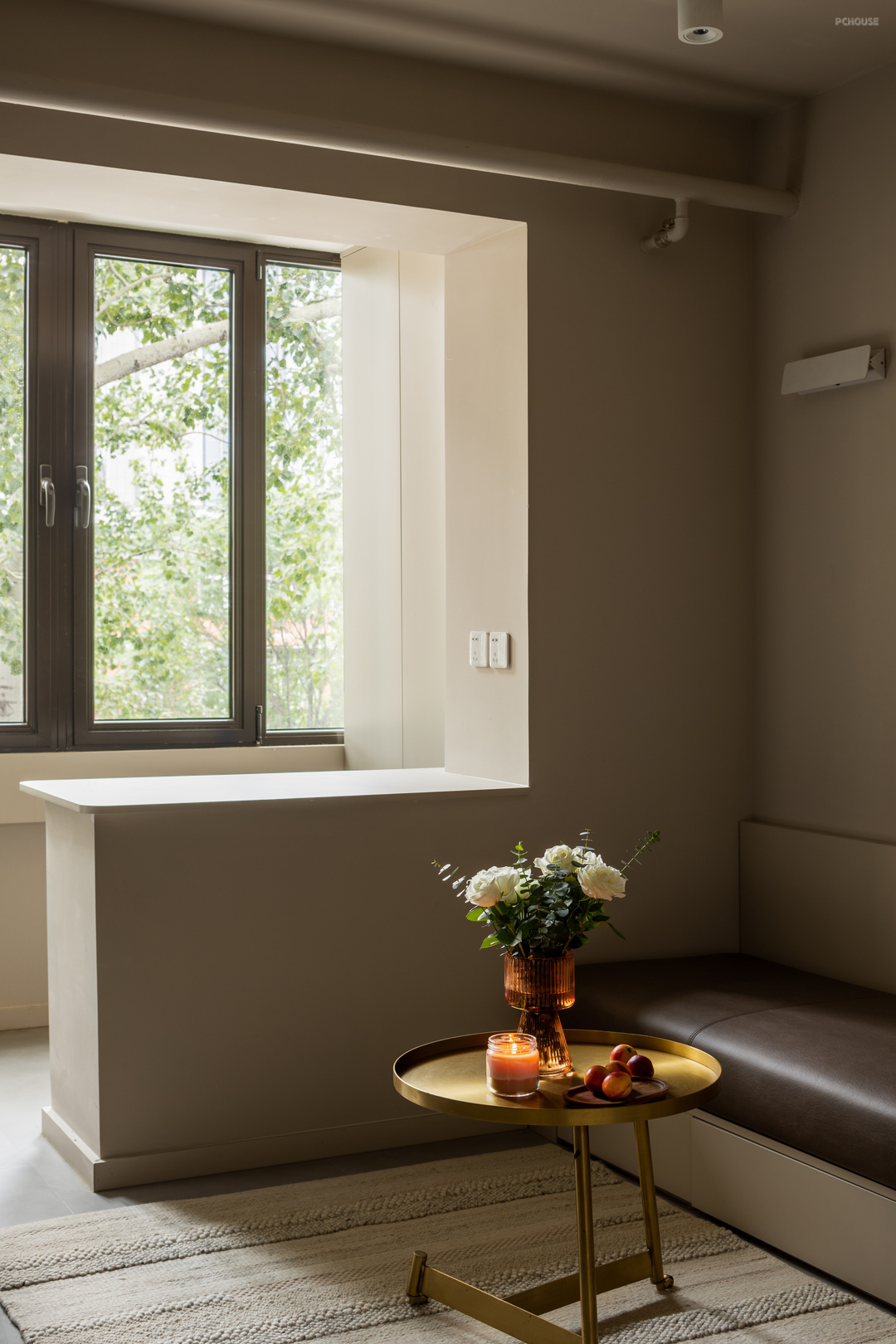 统一墙面的整体色调,卡座上方的壁灯跟墙面也是同色系,黄铜茶几丰富了空间材质层次,周末点一香薰,享受与家人在一起的幸福时光!