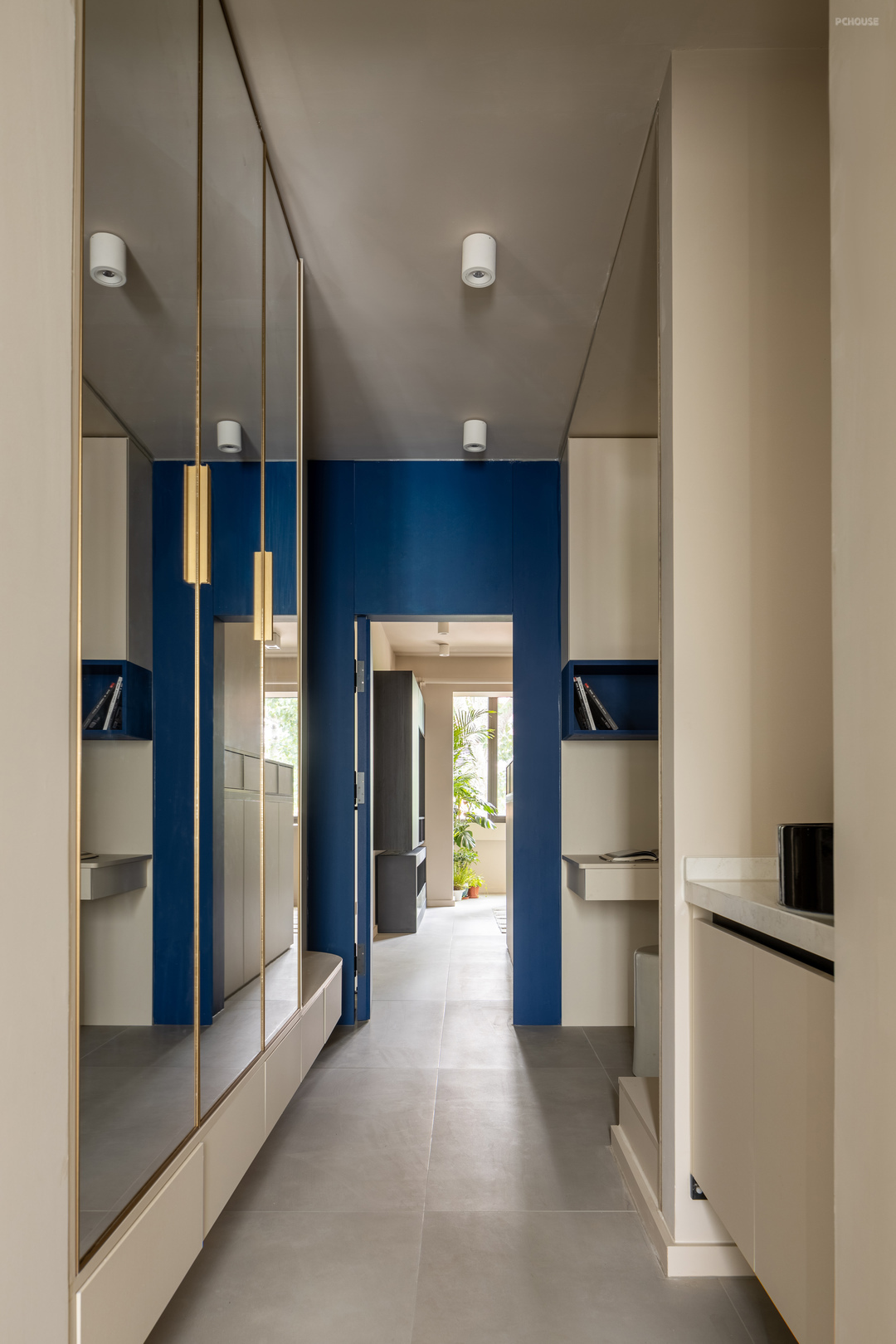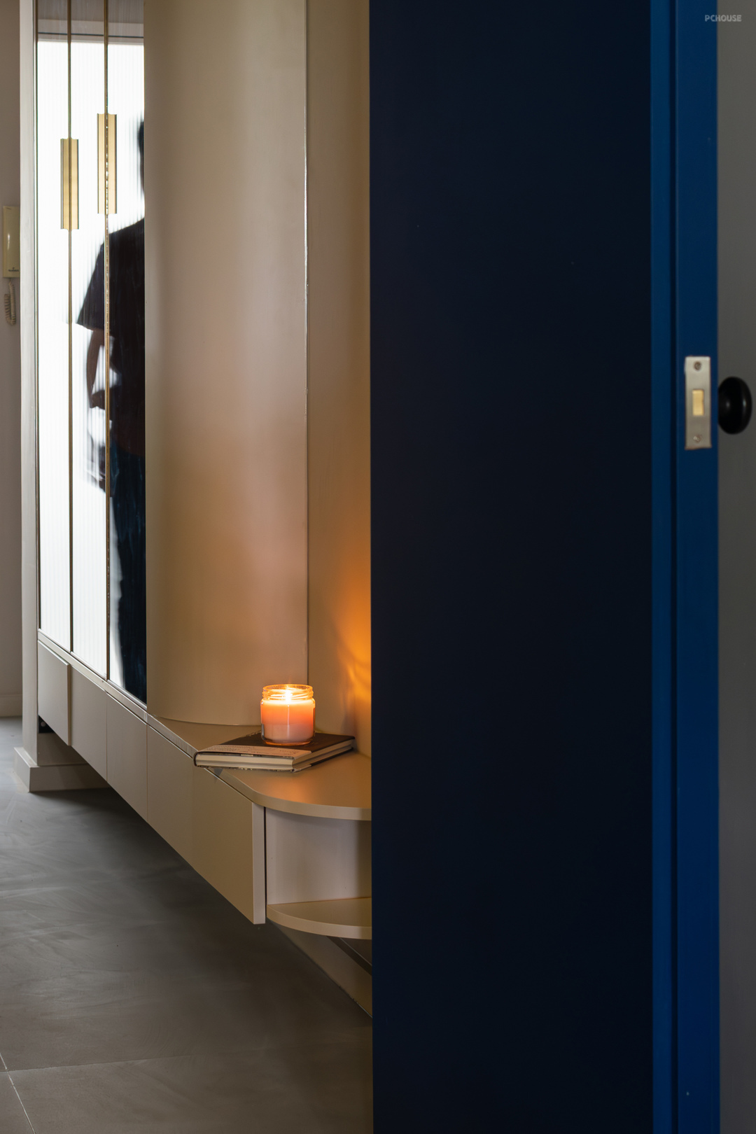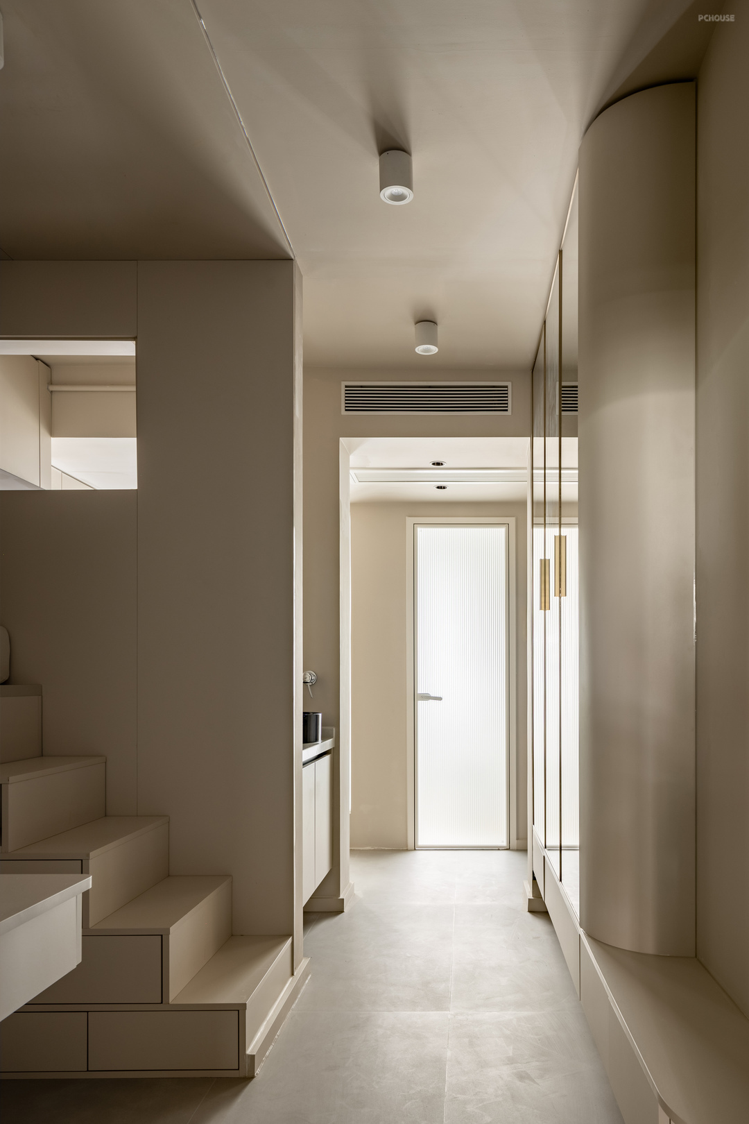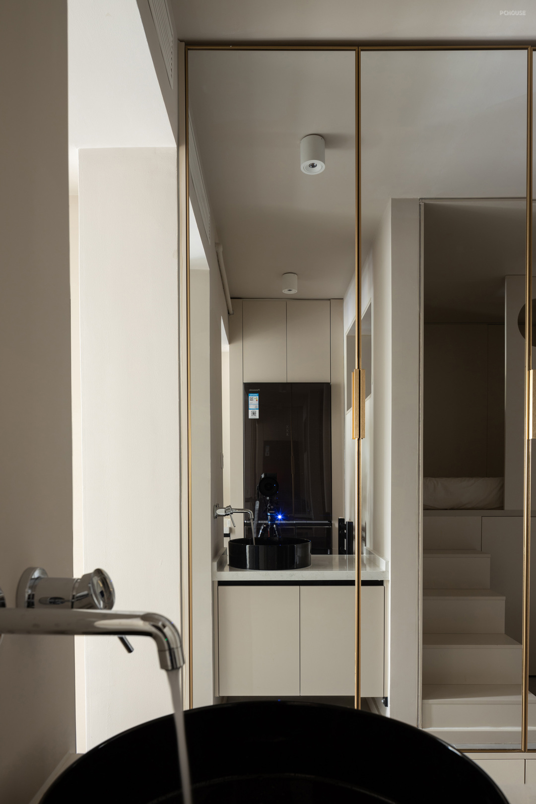 入户门左手边是玄关柜,悬空20公分方便放鞋换鞋,下做感应灯带,为晚上起夜去卫生间提供照明,柜体门板内嵌镜子,镜像空间扩大视觉感受,大面积的镜子也方便了日常出行整理仪容,当穿衣镜来使用