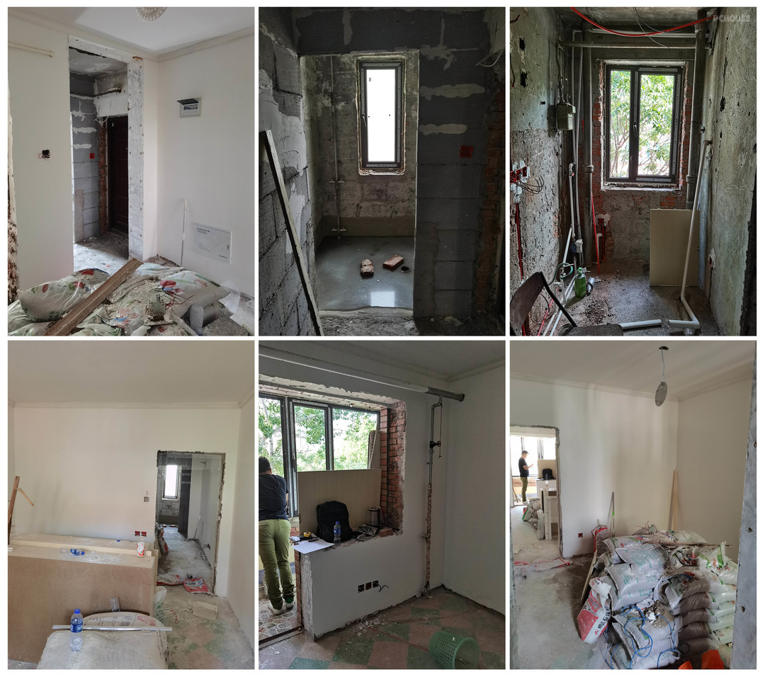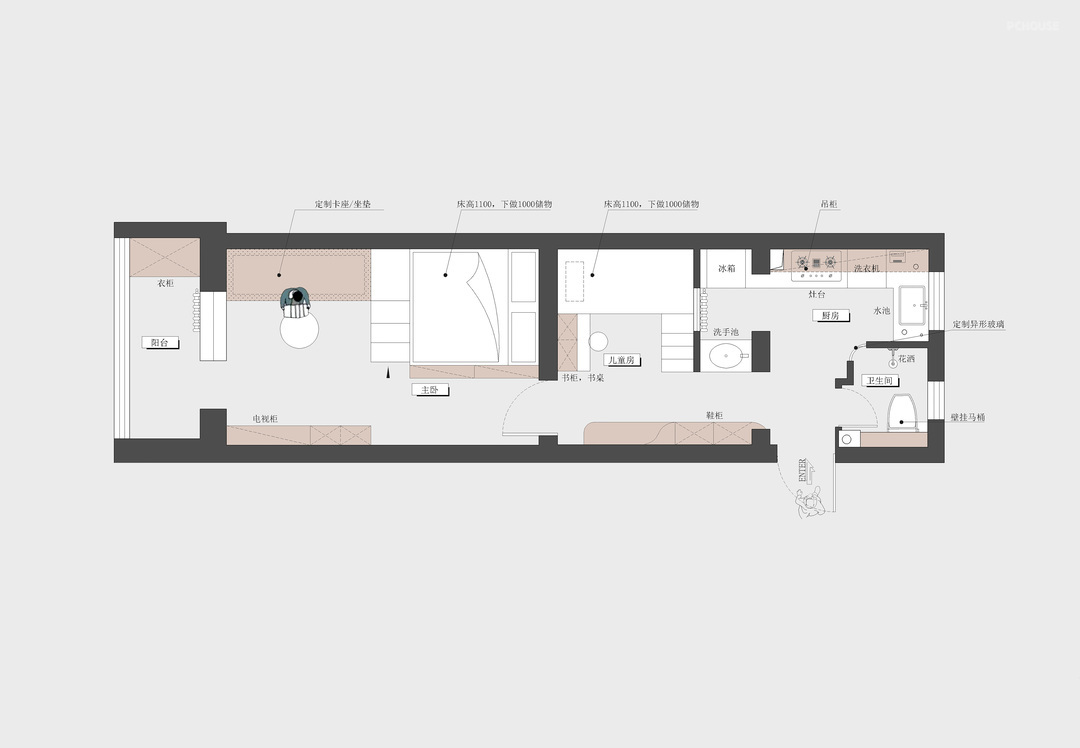 3:砌墙把儿童房和洗手池厨房隔开,留出通风采光窗,内嵌完整盒体,抬高睡眠区,下做储物,充分利用空间