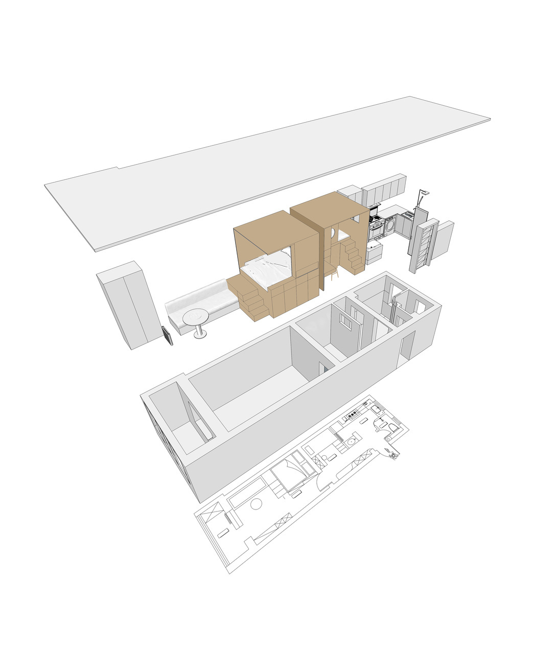 4:主卧室本着纵向利用空间,同样利用盒体内嵌,抬高睡眠区,利用抬高部分做储物,增加储物楼梯可以轻松上下床
