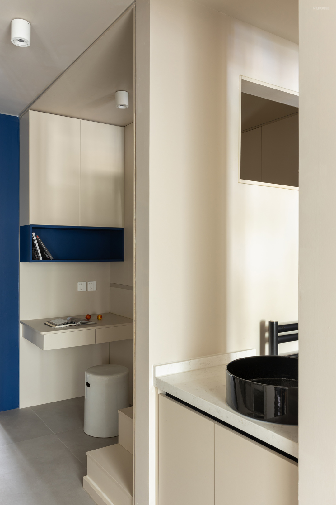 通过三步楼梯可以轻松的上下床,楼梯一侧也做储物,楼梯是一个整体,可以移动,不影响床下储物,蓝色元素延续到了楼梯踏步,与隐形门颜色相呼应