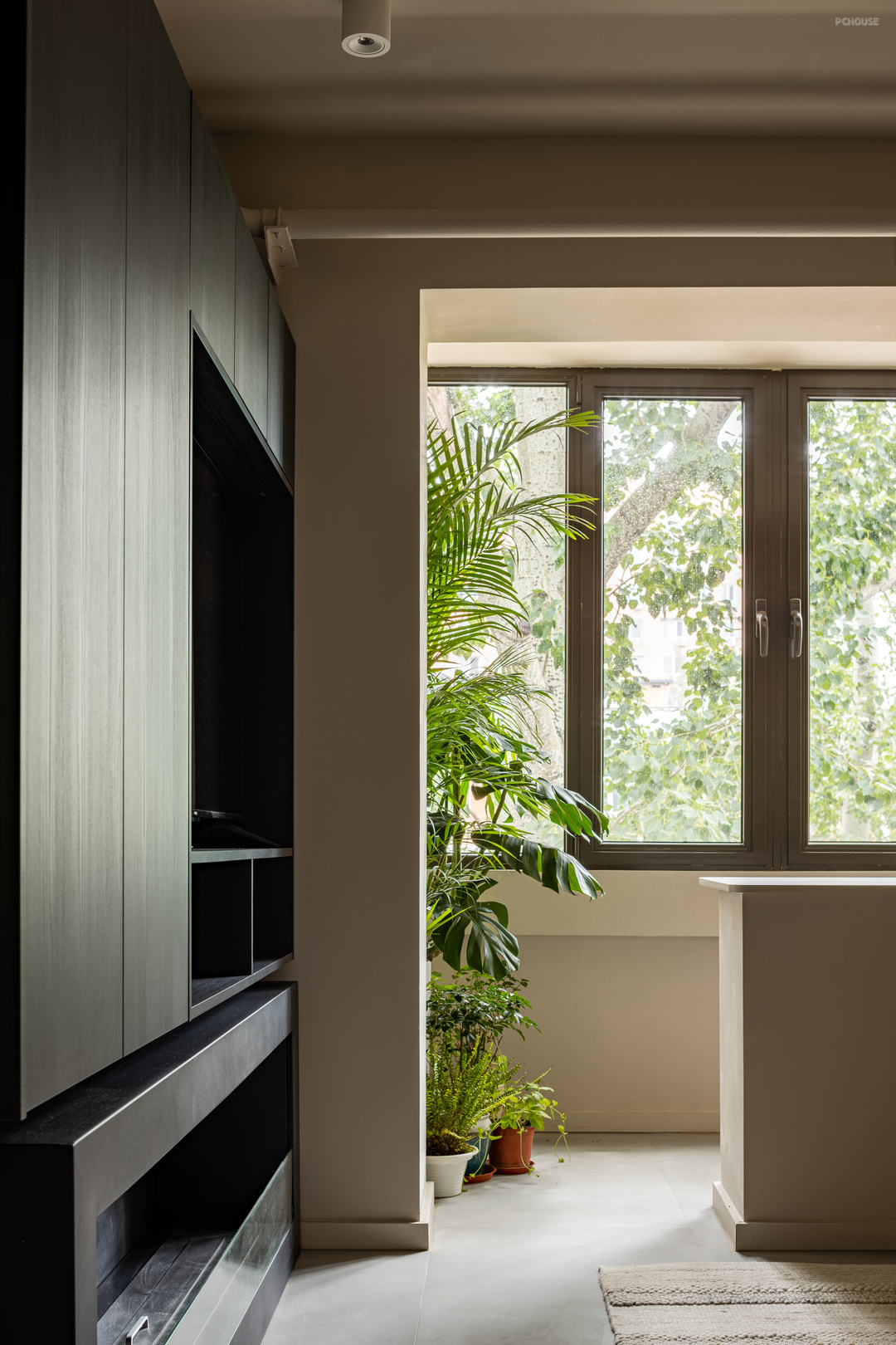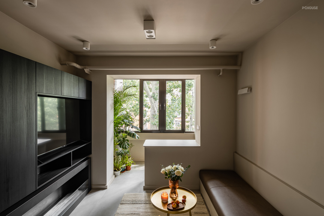 小客厅突兀的管道刷了与墙面同样的颜色,起到弱化管道的视觉效果,卡座是定制,坐垫下方同样可以用来储物,阳台绿植的加入,为空间注入了生命力,电视柜不仅可以用来储物,深色也让空间更加沉稳,电视柜下方是委托人比较喜欢的壁炉,可以想象冬天外边漫天大雪,屋内点上壁炉温暖如春的惬意生活!