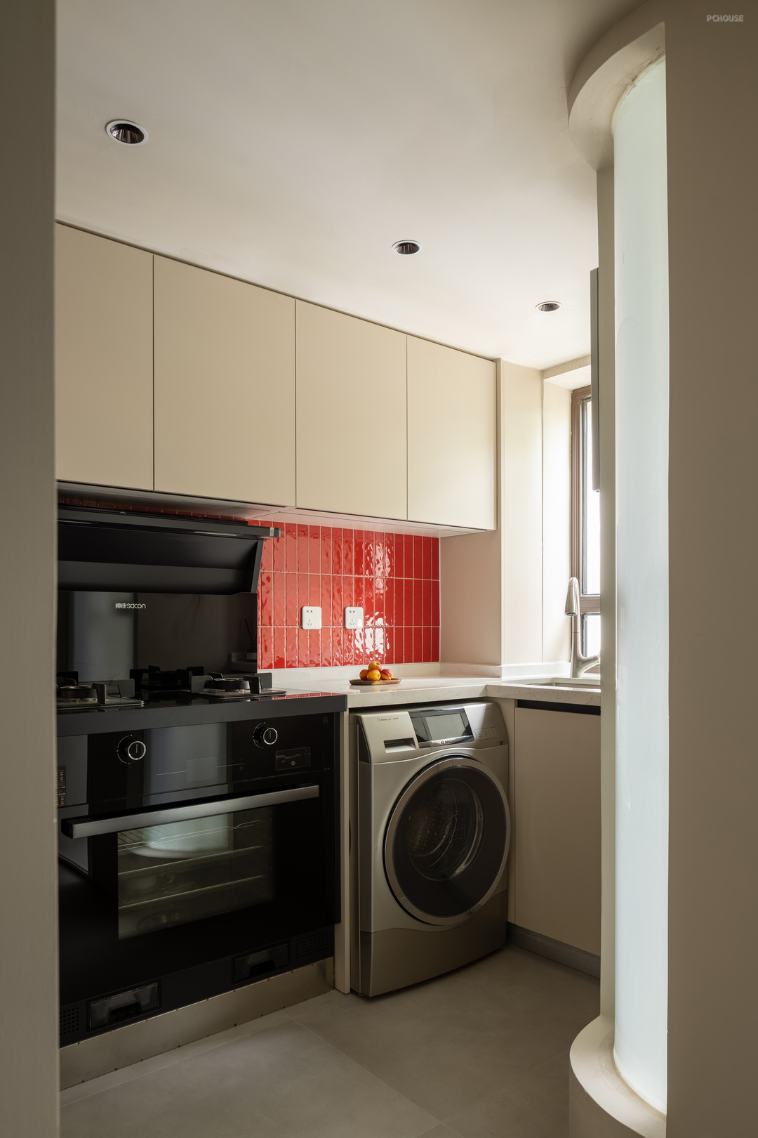 厨房可以说是“麻雀虽小,五脏俱全”,集成灶的使用可以省出吊柜空间用来储物,是小面积厨房的不二选择,内嵌的滚筒洗衣机方便日常洗衣,水池下方做了前置、净水,冰箱内嵌的上方吊柜也可以用来储物,厨房的瓷砖借鉴了红蓝椅里边的红色元素,个性十足!