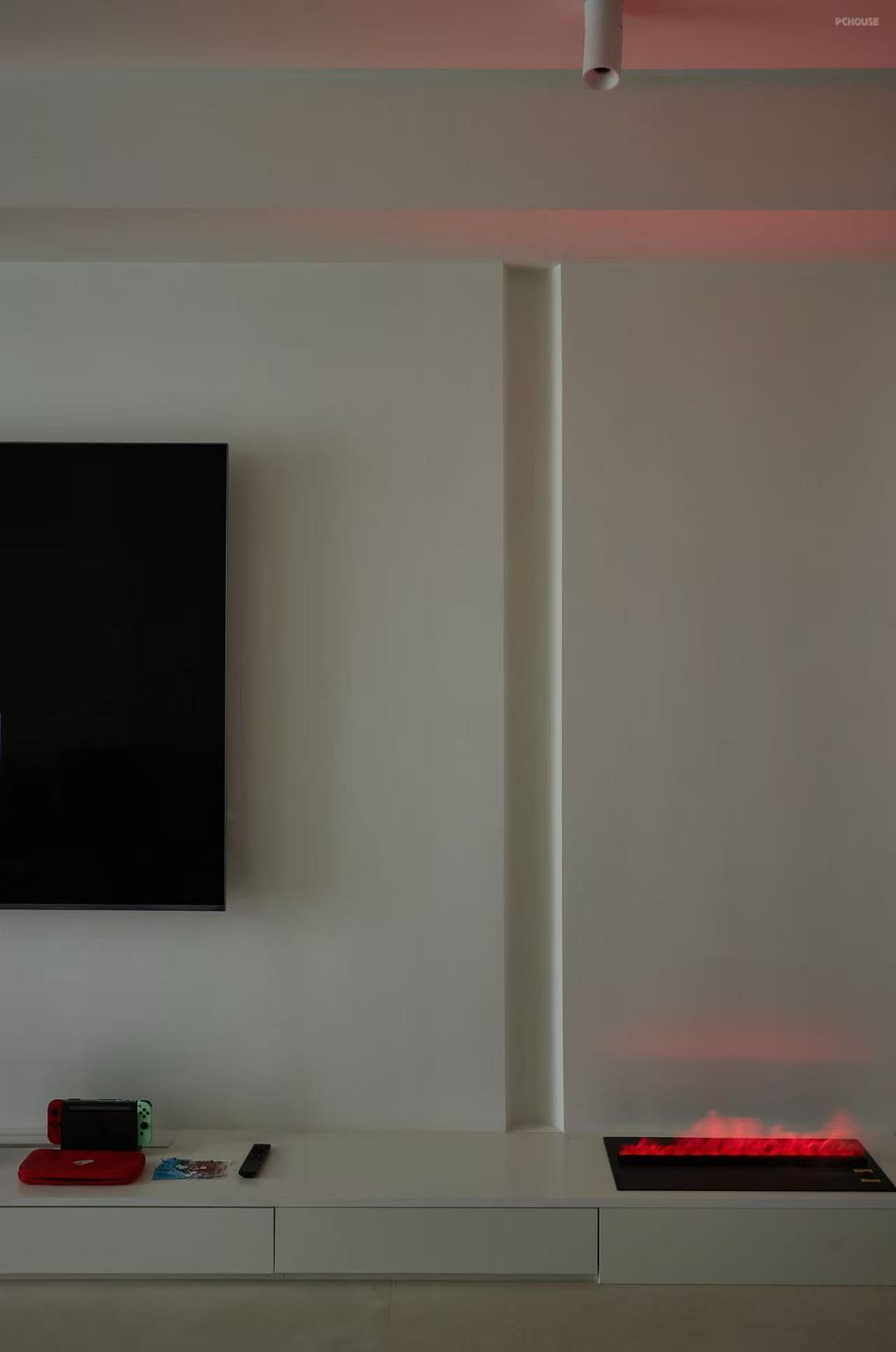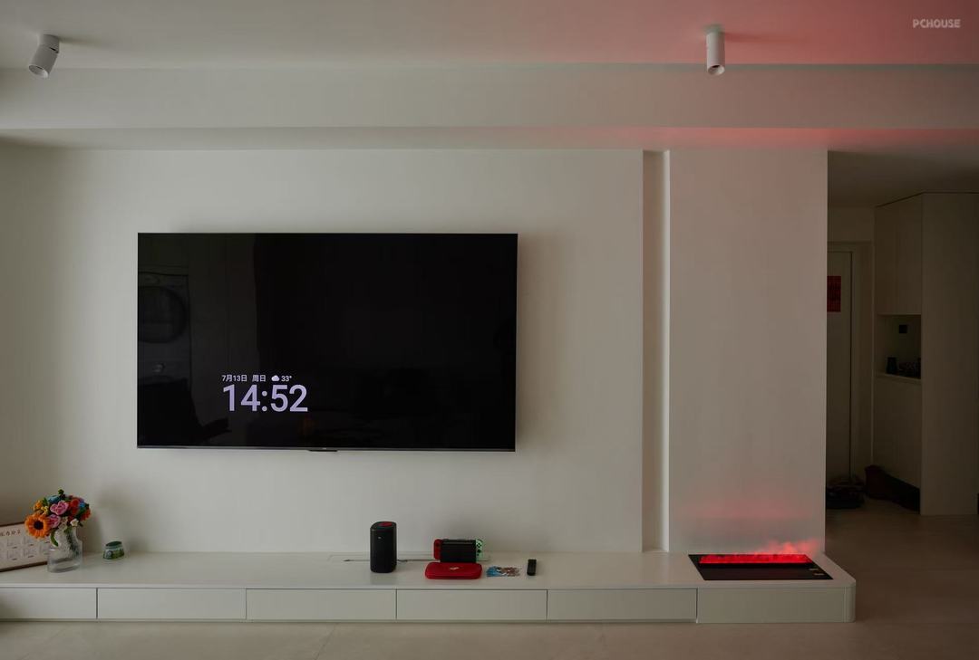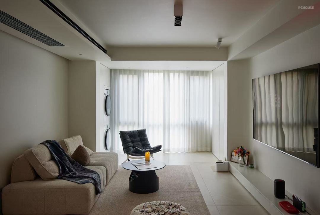 客厅作为独立空间,摒弃了传统的整墙电视柜设计,转而采用极窄的黑色地面矮柜,视觉上轻盈悬浮,与整体白色的墙顶柜系统形成鲜明对比。柜体与墙面、顶面无缝衔接,勾勒出干净利落的极简轮廓,大幅提升空间开阔感。