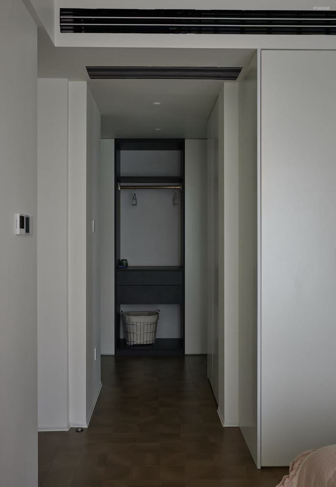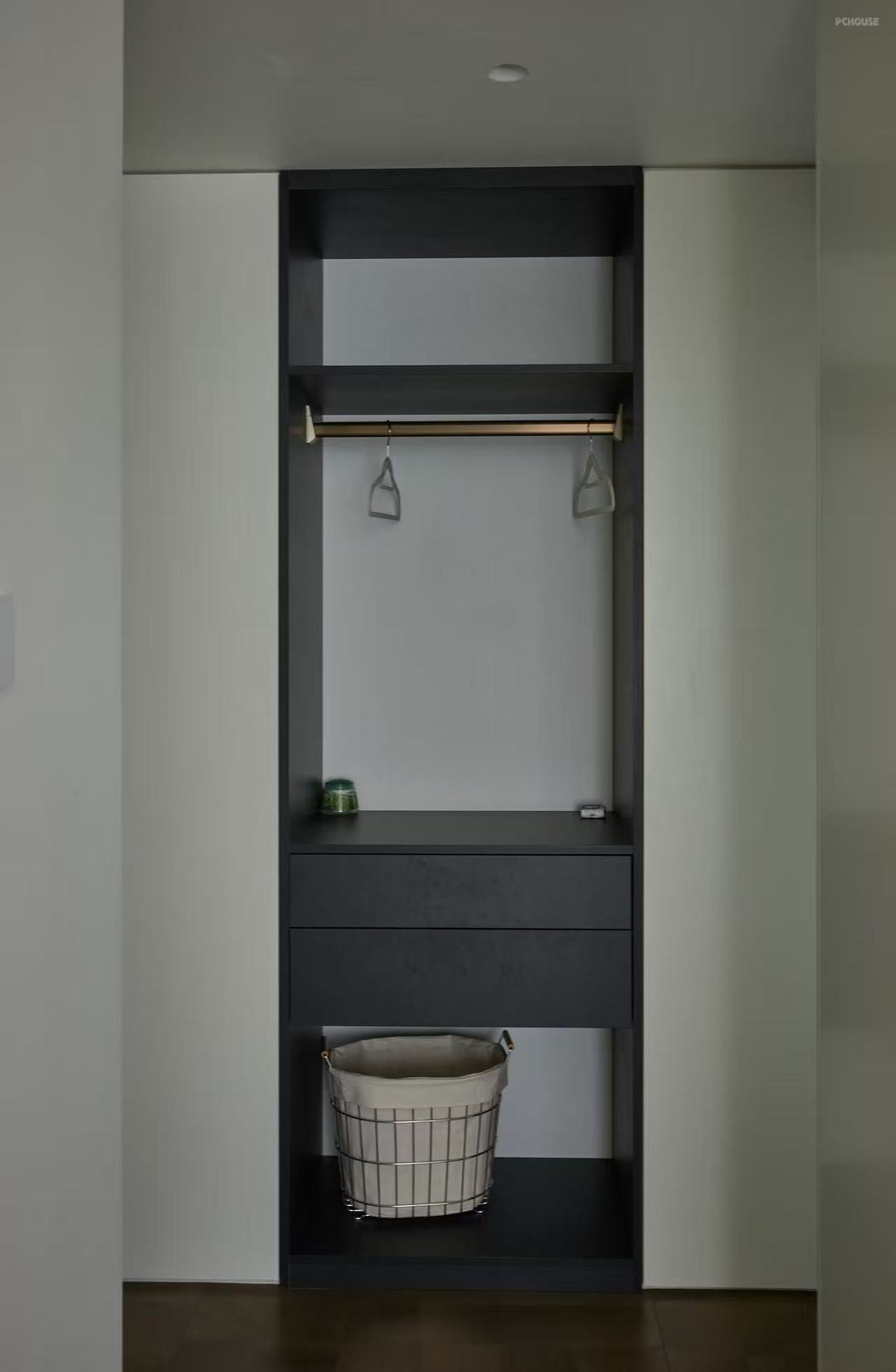 衣帽间延续极简语汇,以开放柜与封闭柜组合满足多元收纳需求。黑色开放格便于悬挂秋冬外套等临时衣物,白色柜门则隐藏日常储物,黑白对比鲜明利落,秩序井然。主卫与整体风格一脉相承,以灰调基底与简洁设备收拢日常琐碎,于私密空间中延续静谧而高效的生活姿态。