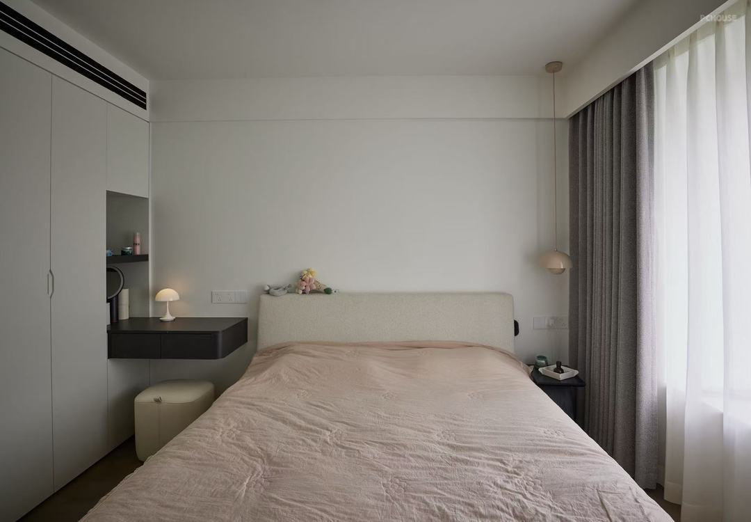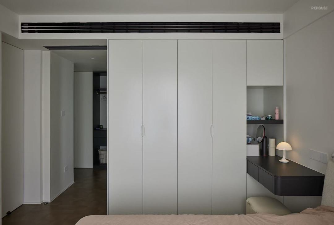 主卧以套房形式构建,理性划分为就寝区、衣帽间与主卫三个功能区,动线清晰且互不干扰。就寝区配置6尺宽大睡床,营造舒适安眠尺度。一侧定制通顶衣柜,巧妙将梳妆台以体块穿插形式嵌入柜体,并通过黑白色系分色处理,形成灵动而精致的视觉构图,兼具实用与美学功能。