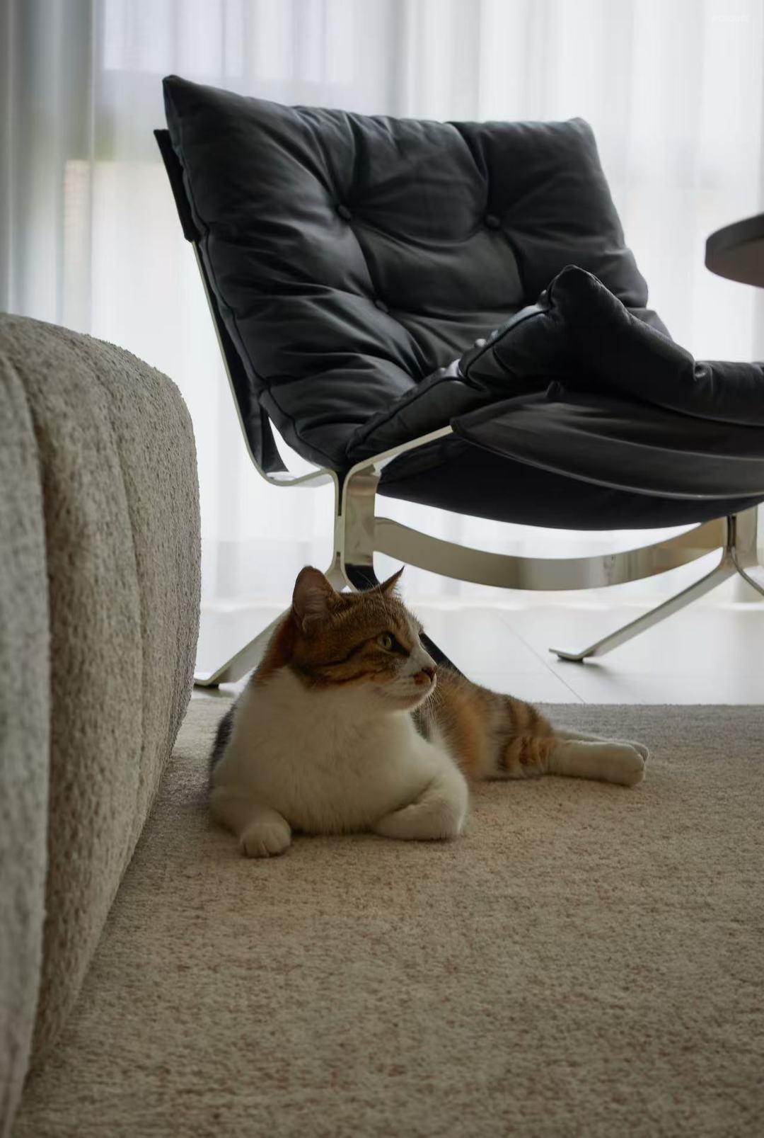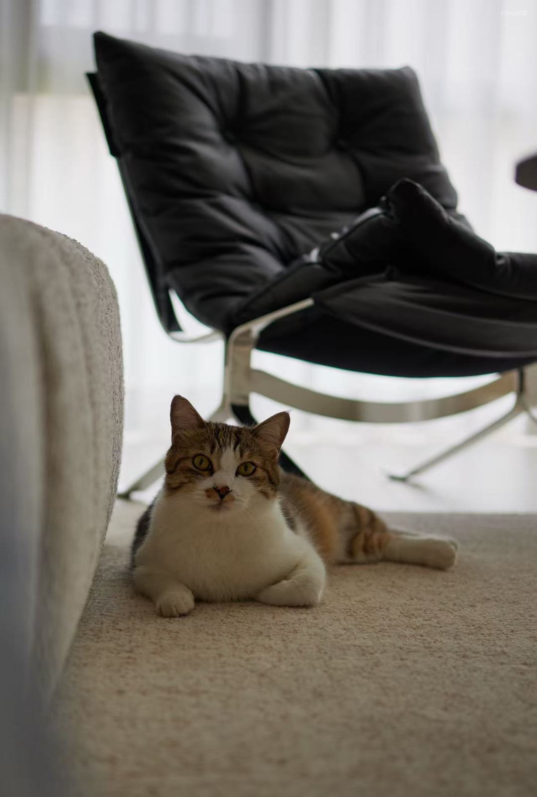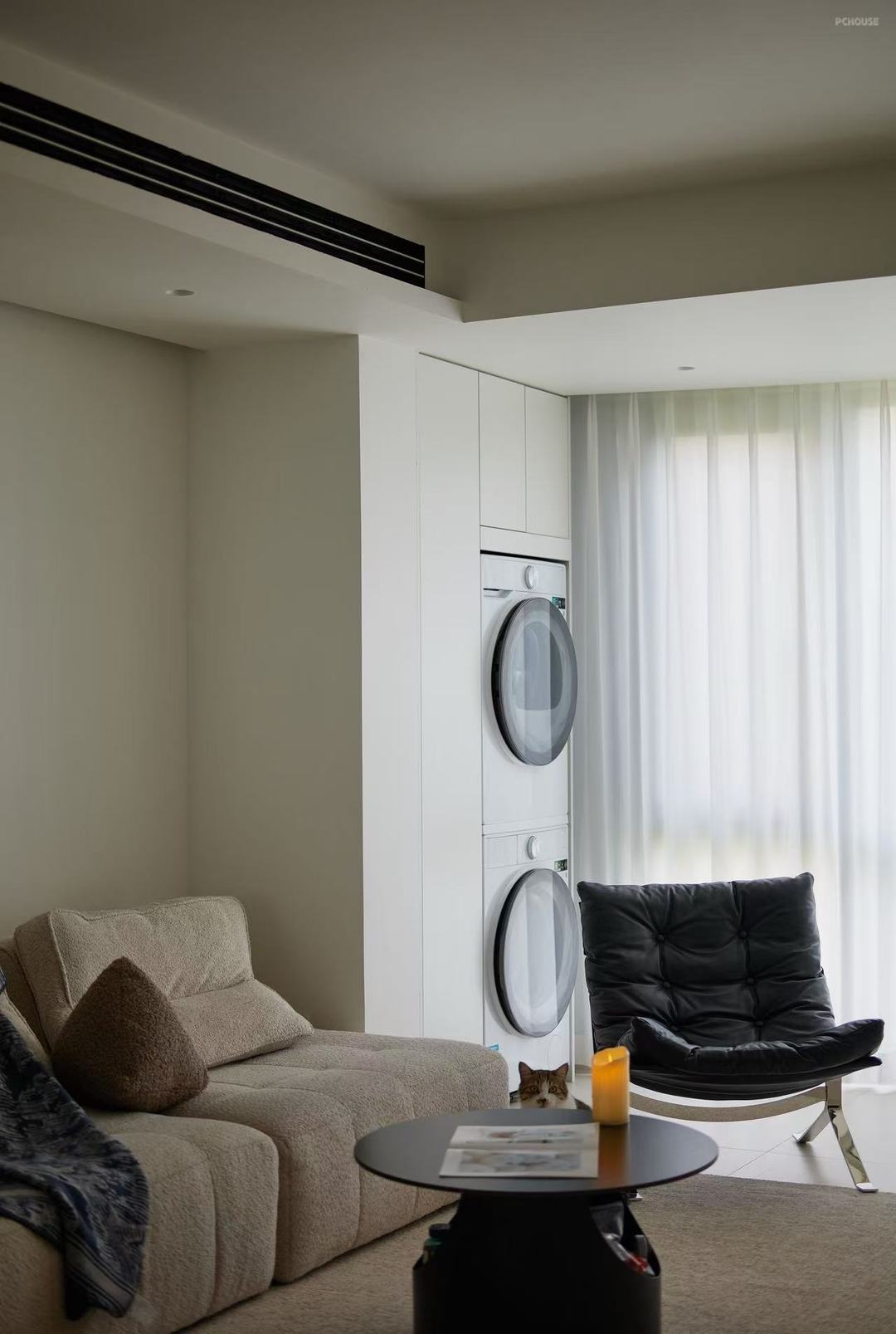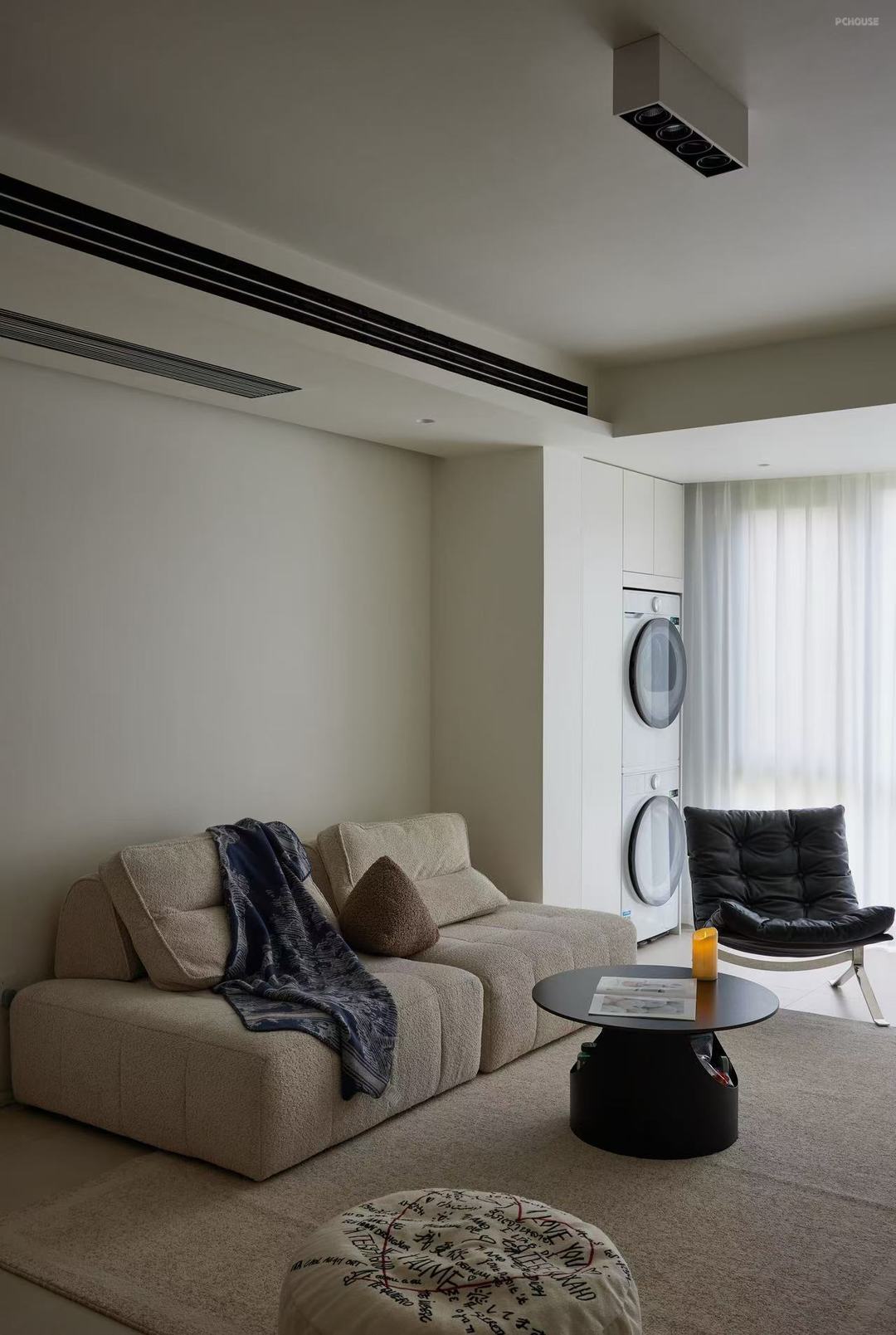 燕麦色沙发与同色系地毯柔化了黑白灰的冷冽基调,注入温暖与柔软的氛围。光线掠过统一的白色顶面与墙面,渲染出静谧而纯粹的场域精神。整个空间无需多余装饰,仅凭体块、色彩与材质的微妙互动,便成就了一个兼具理性结构与感性温度的现代居所。