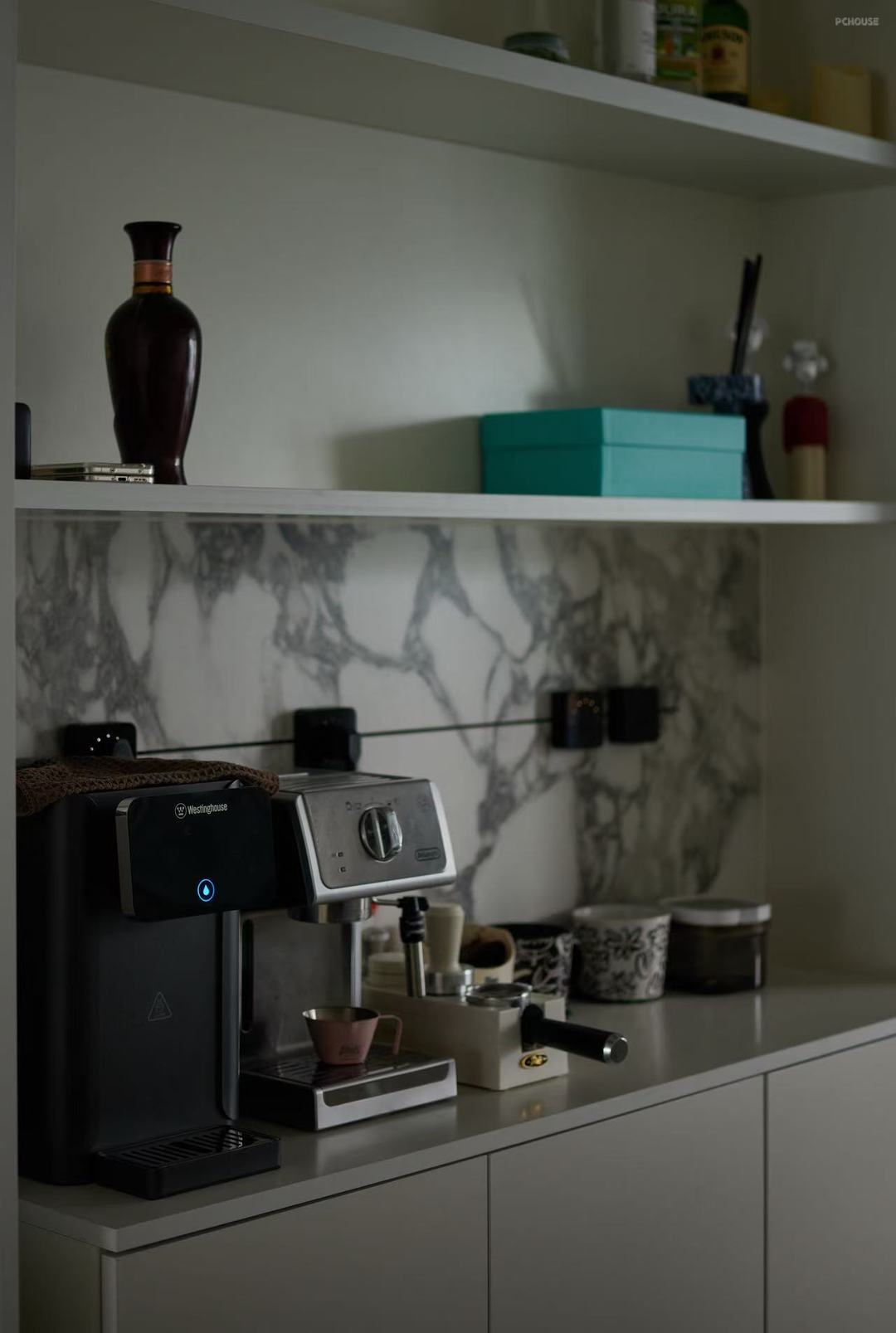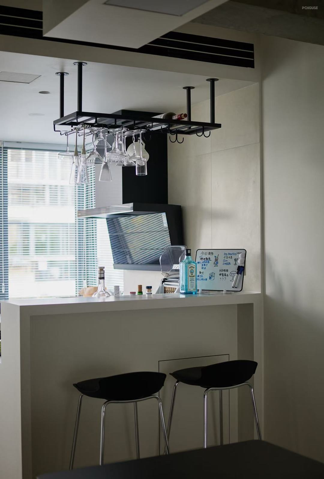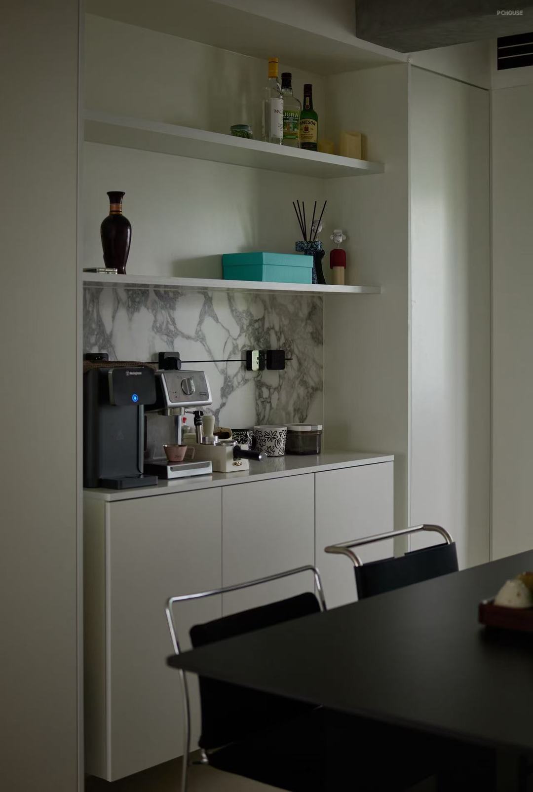 厨房与餐厅之间设置一座吧台,既作为功能隔断,也成为屋主小酌怡情、休闲社交的情感载体。顶部双梁之间嵌入了整面软膜天花灯模,光线柔和均匀,犹如自然光漫射,营造利落而大气的现代氛围。整体设计在理性架构中注入温度,于细节处彰显个性与生活方式。