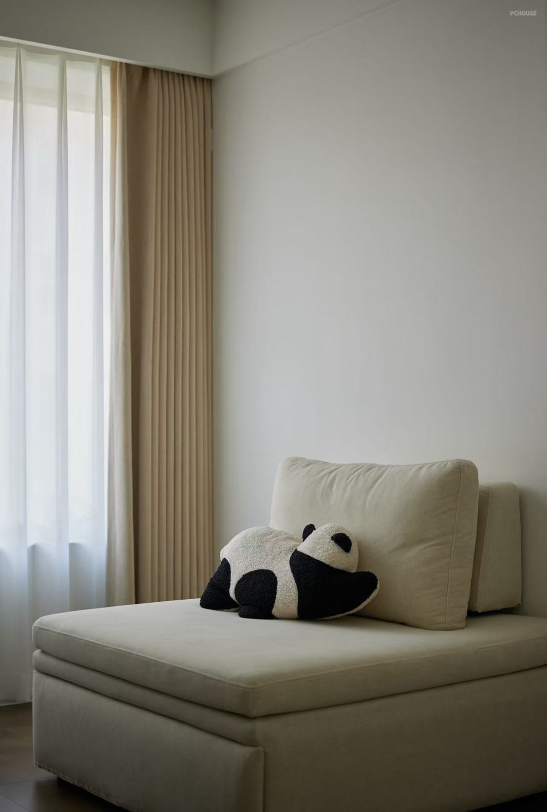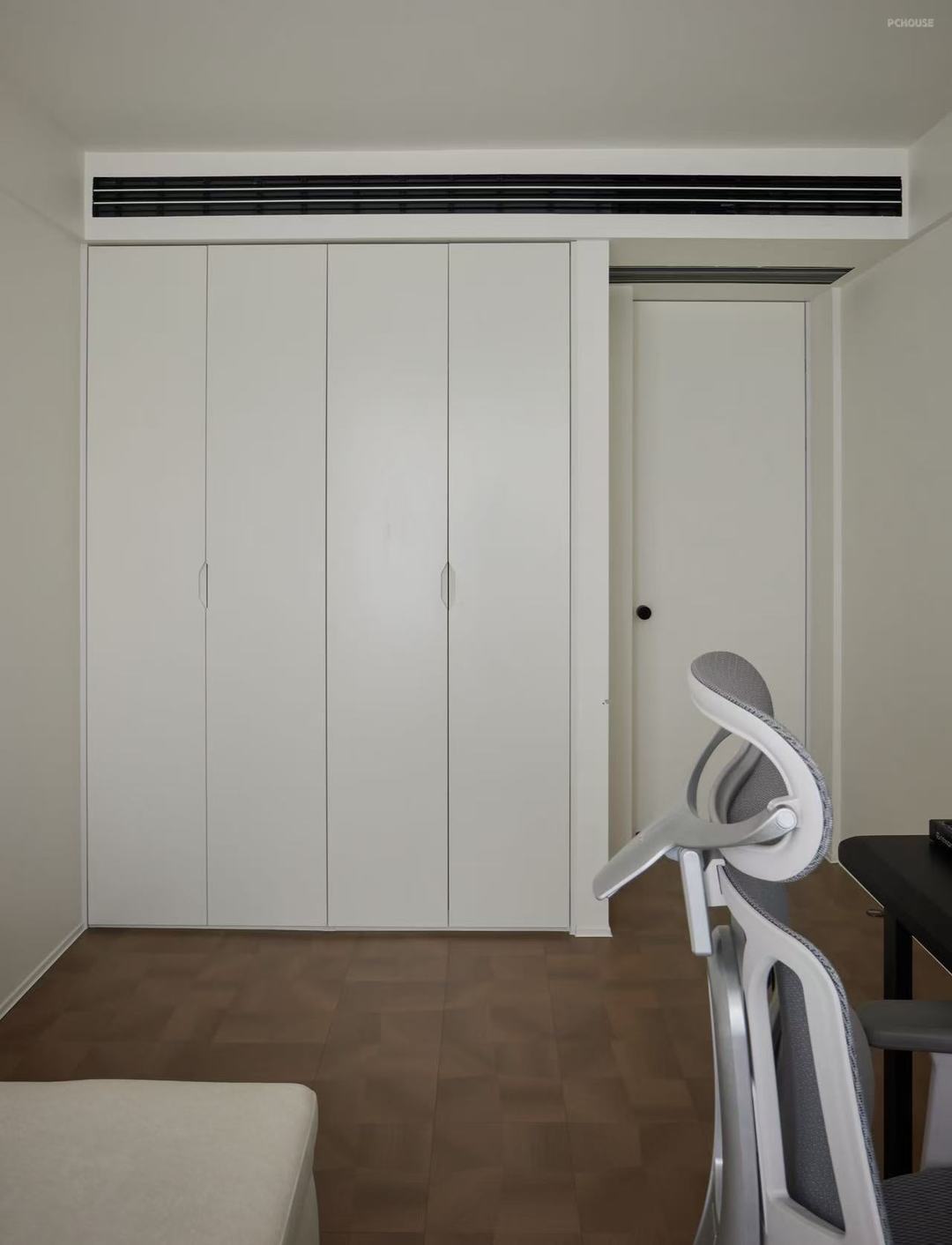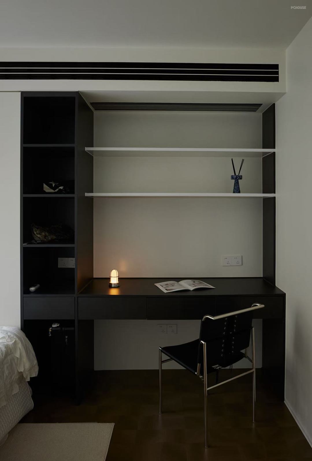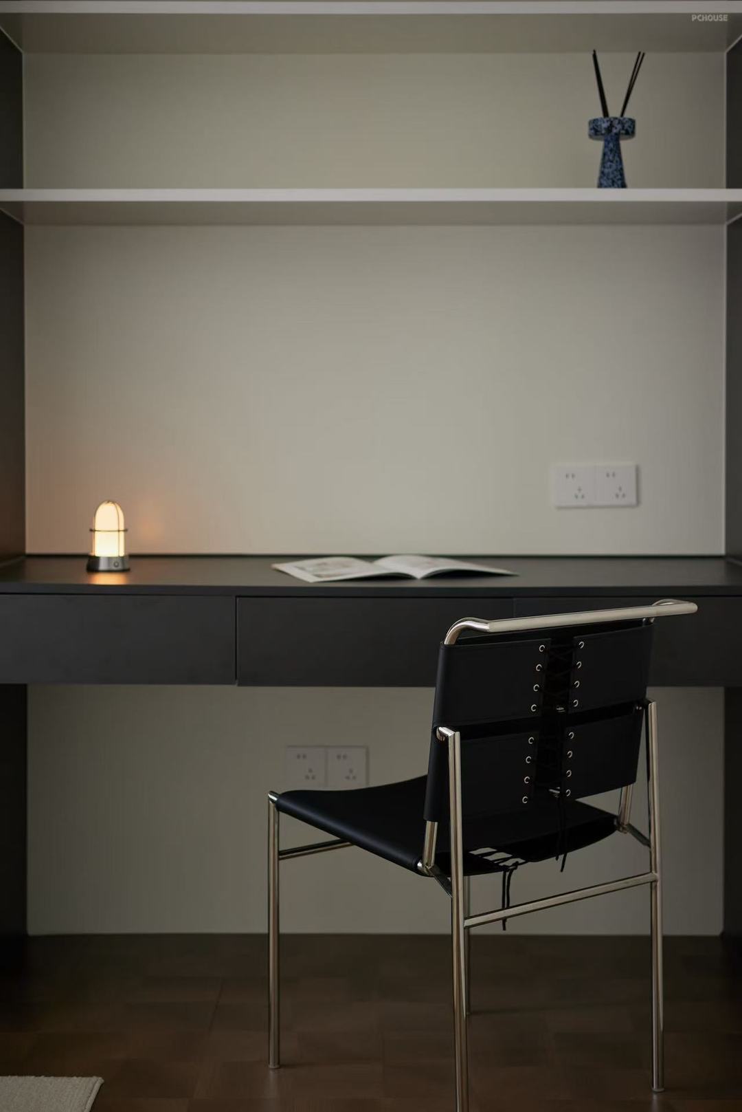 此处与其称为书房,更像是一处纯净而灵活的多功能角落。整体延续空间的冷调基调,配色干净利落。一张舒适的单人沙发临窗而立,构成阅读或发呆的静谧一隅;一旁设置简约的白色储物柜,满足书籍与杂物的收纳需求。空间虽小,却功能完备,在极简的秩序中保留着随时可被定义的自由。