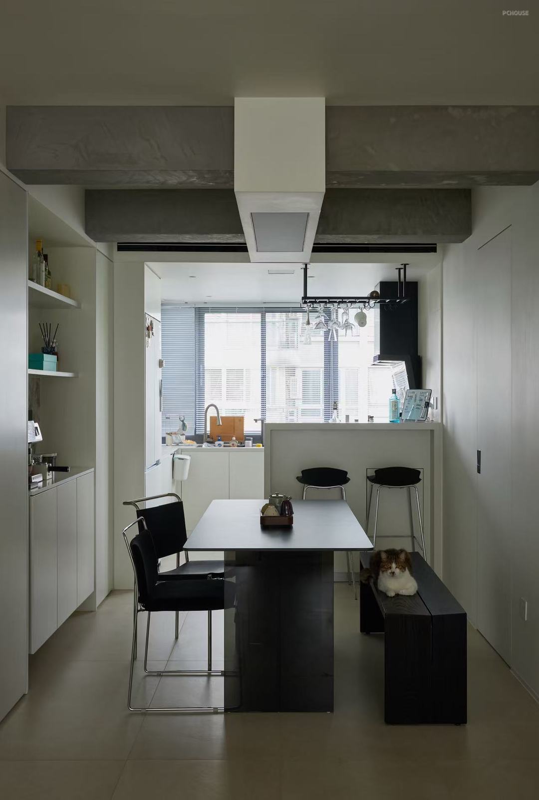 餐厅与厨房以开放式的布局打通,形成流畅自如的生活动线。顶面因原始结构梁位置偏斜,巧妙增设一道对称假梁,并通体涂刷微水泥艺术涂料,以粗砺的肌理与深灰色调强化空间的建构美感,使顶面层次错落有致、张力十足。