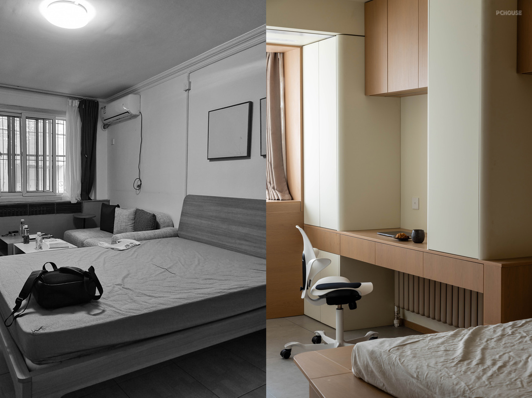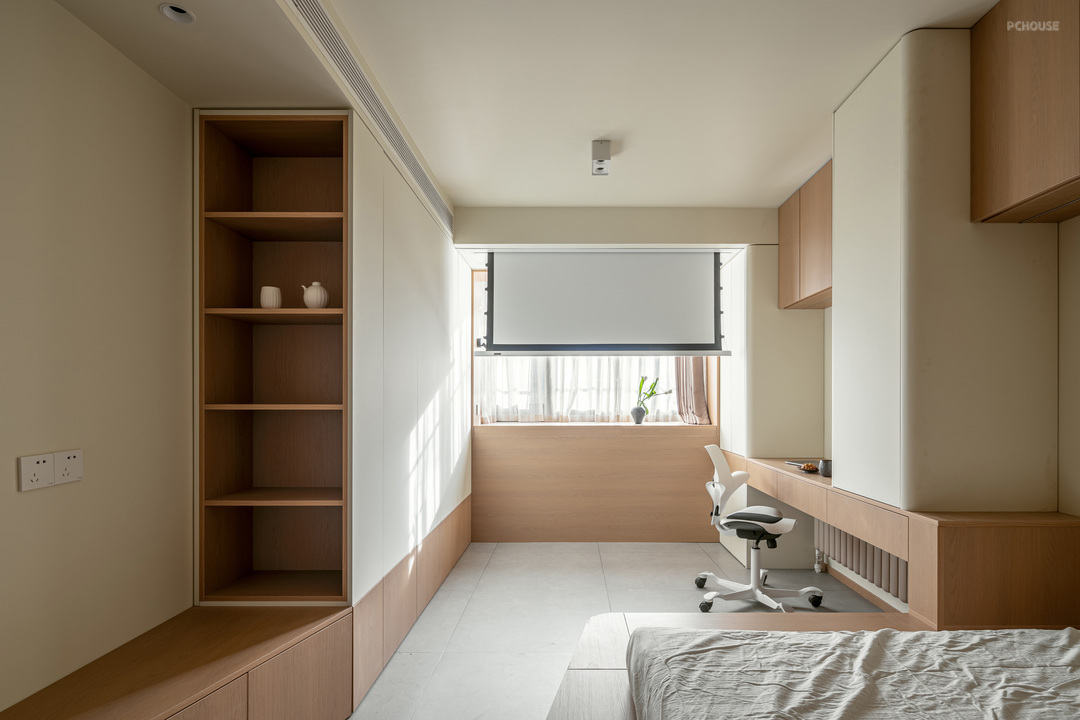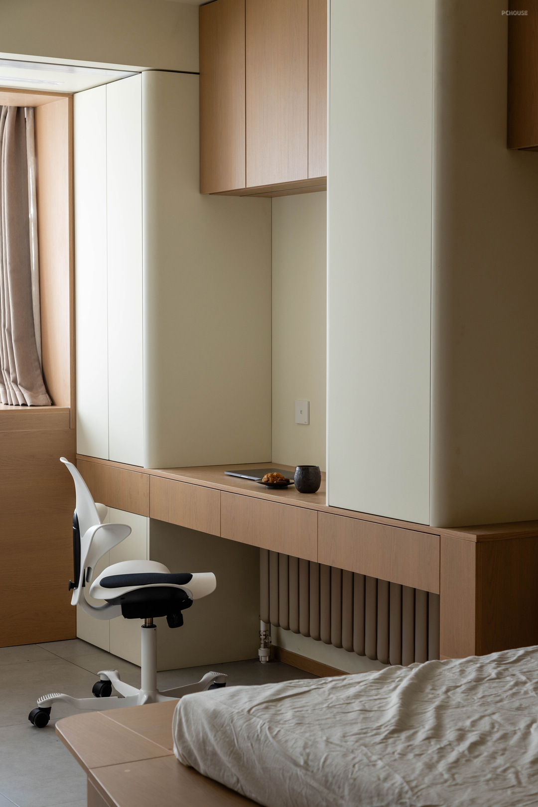 阳光通过麻质窗帘的过滤变得更加柔和,在床的对面增加投影幕布,完美的实现了躺床上追剧的美好愿望,我们想让空间更干净整洁,暖气放到了办公桌下方不显眼的地方