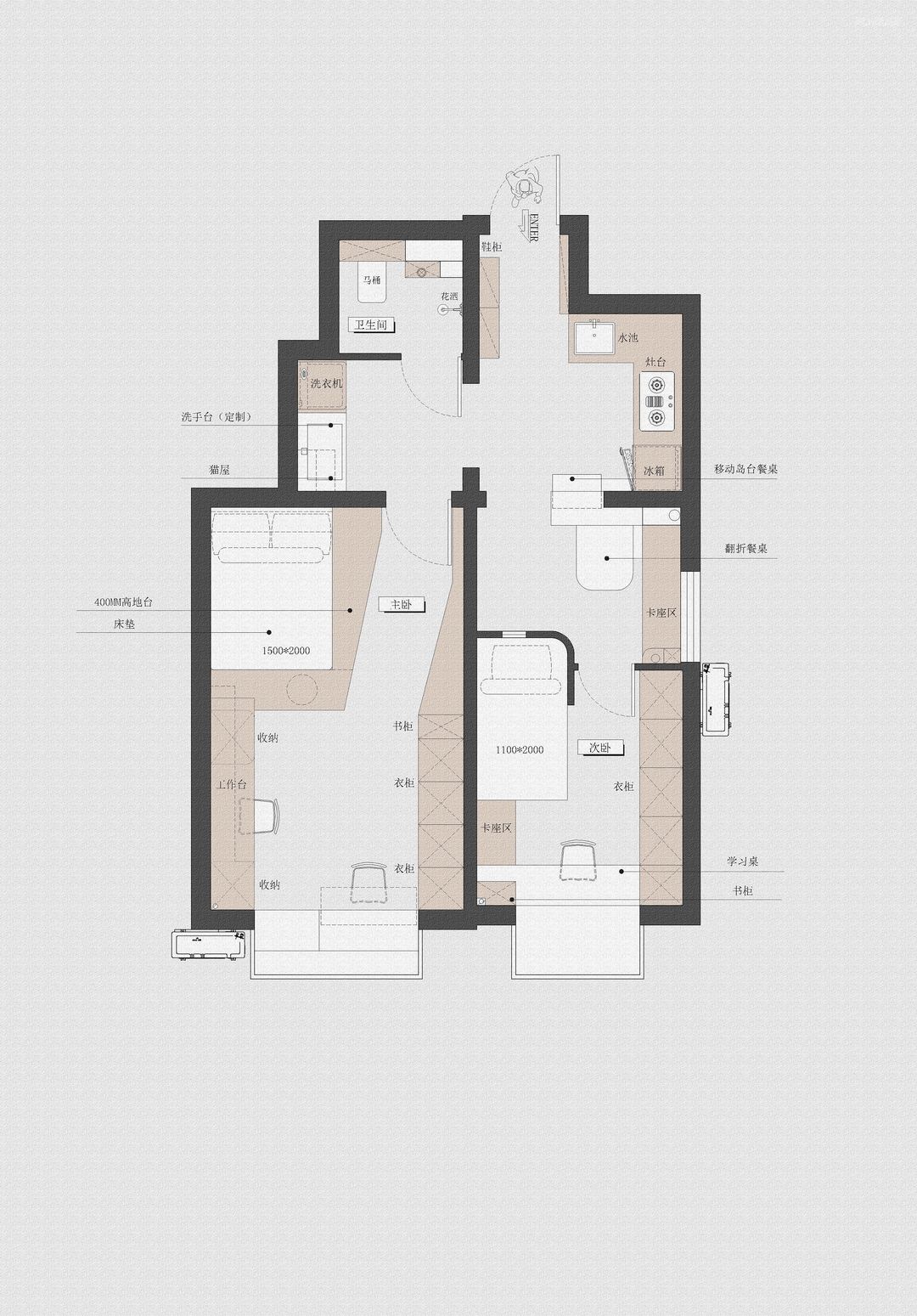1:进门玄关增加1.8米高玄关柜,柜门内嵌镜面,满足玄关的使用功能,进门左手边做隐形翻折换鞋凳,方便老人进出换鞋