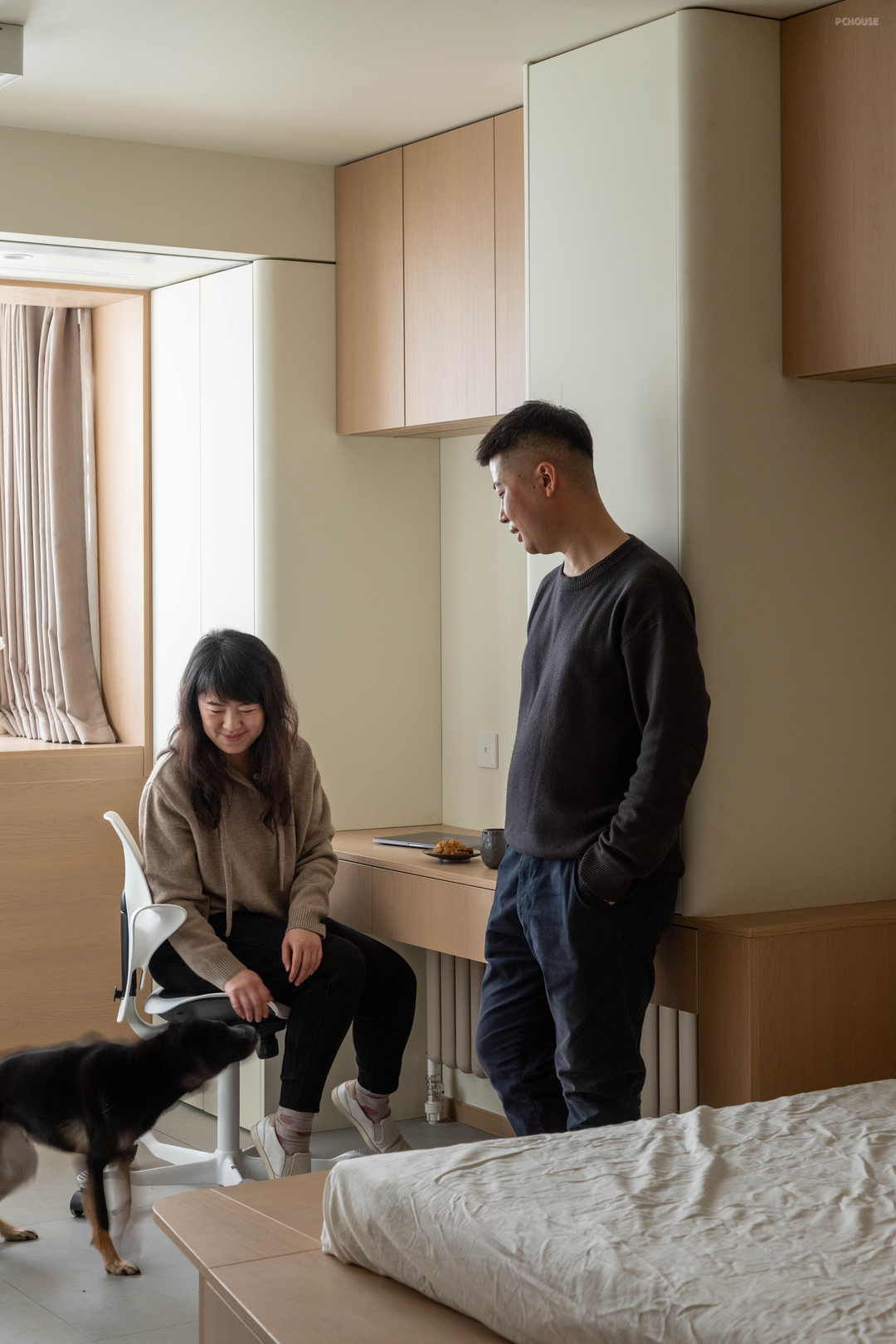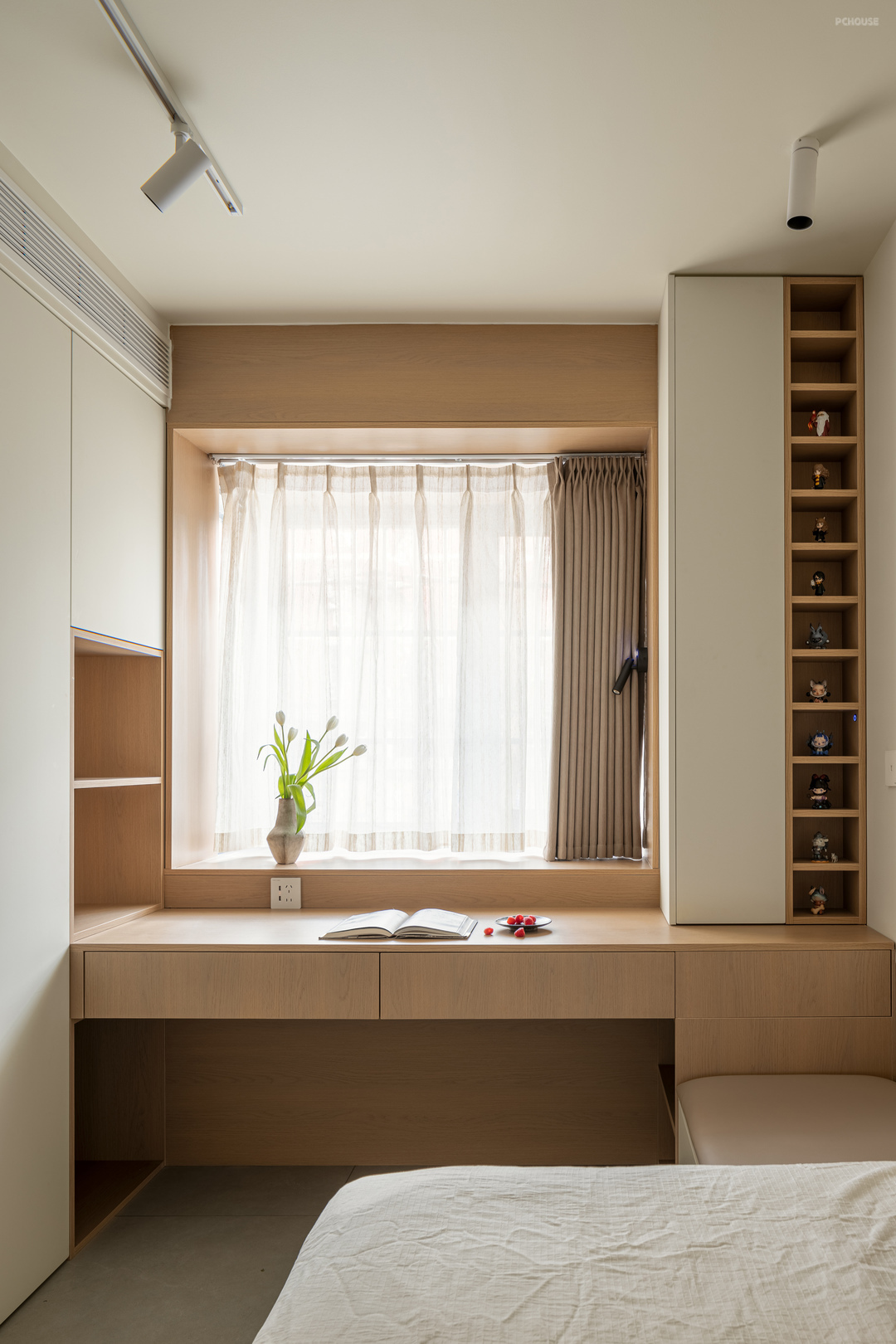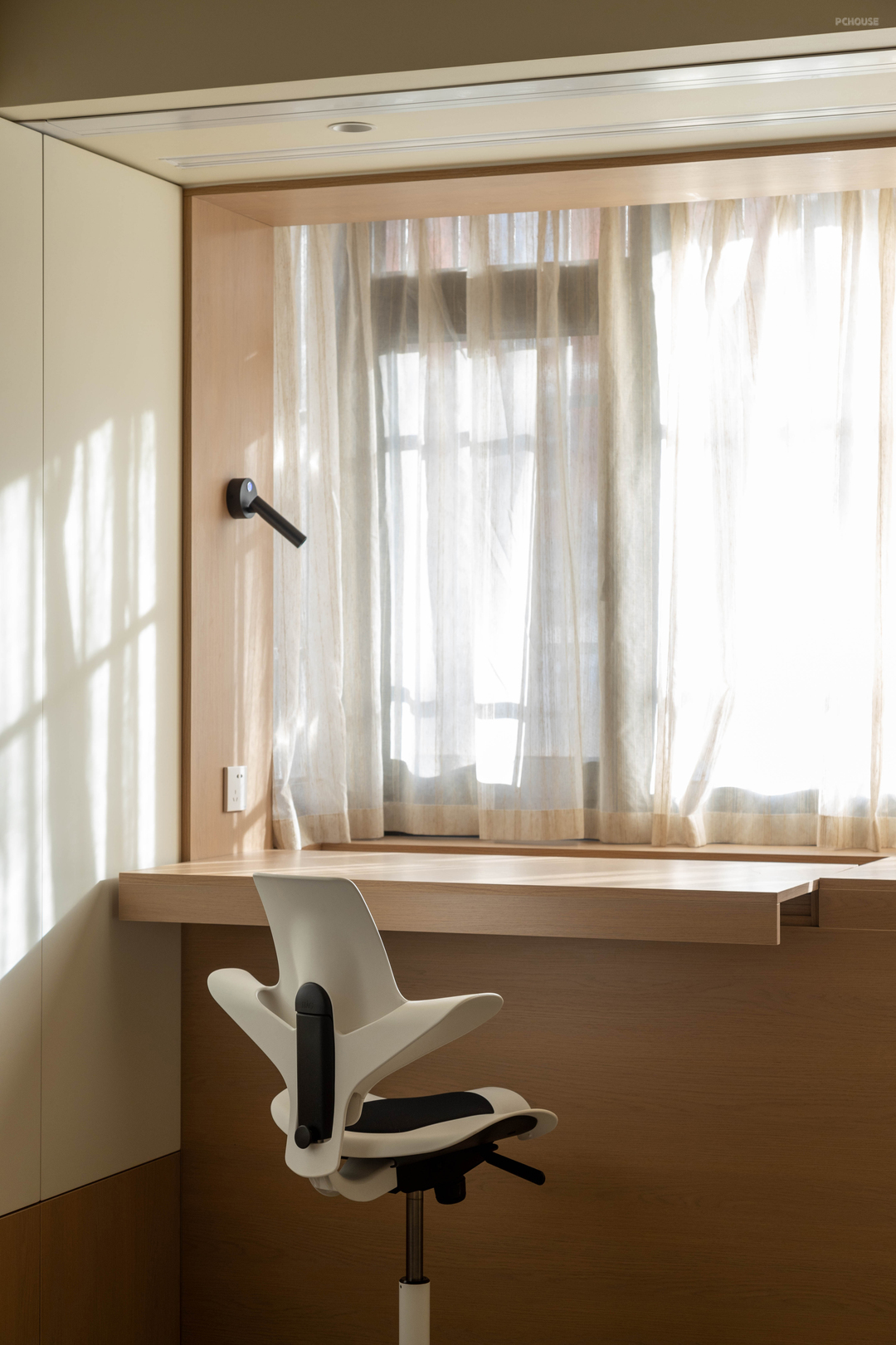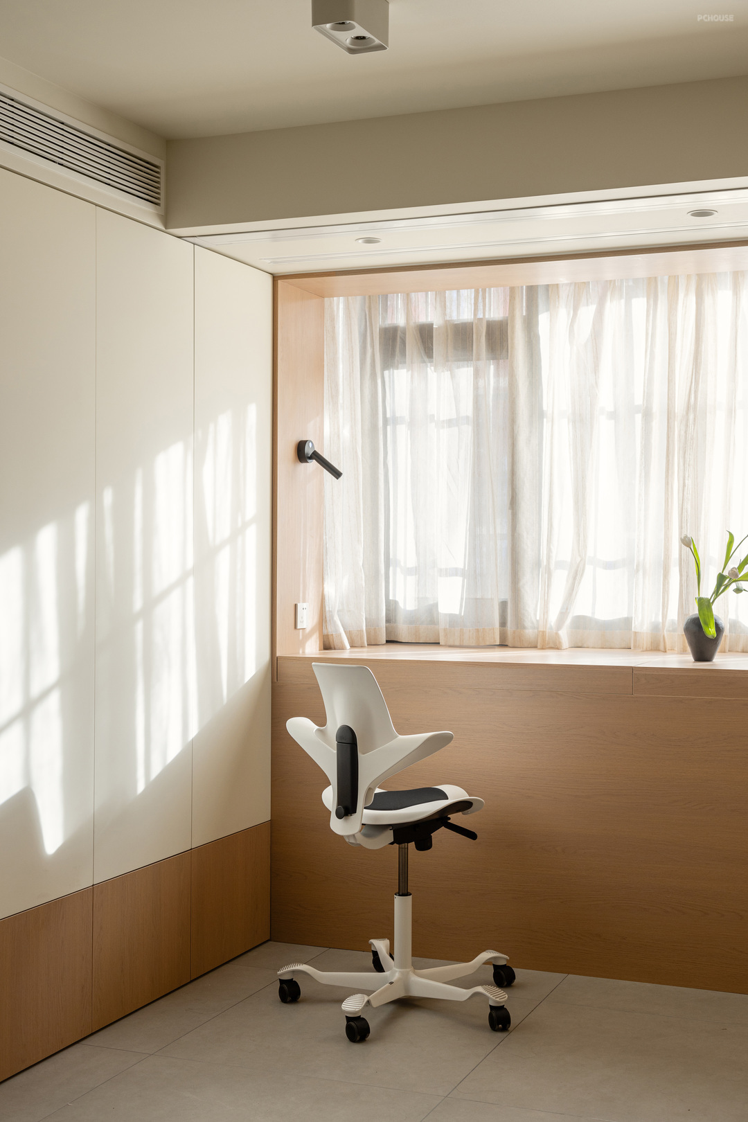 主卧的第二个办公阅读区,隐形的推拉桌面使用灵活还不占用空间,扩出去的窗台部分面积变大,采光很好,方便女主日常对陶艺的拍摄,骑马椅的颜值跟空间完美匹配,高度可以调节,喜欢的住友可以放心安利