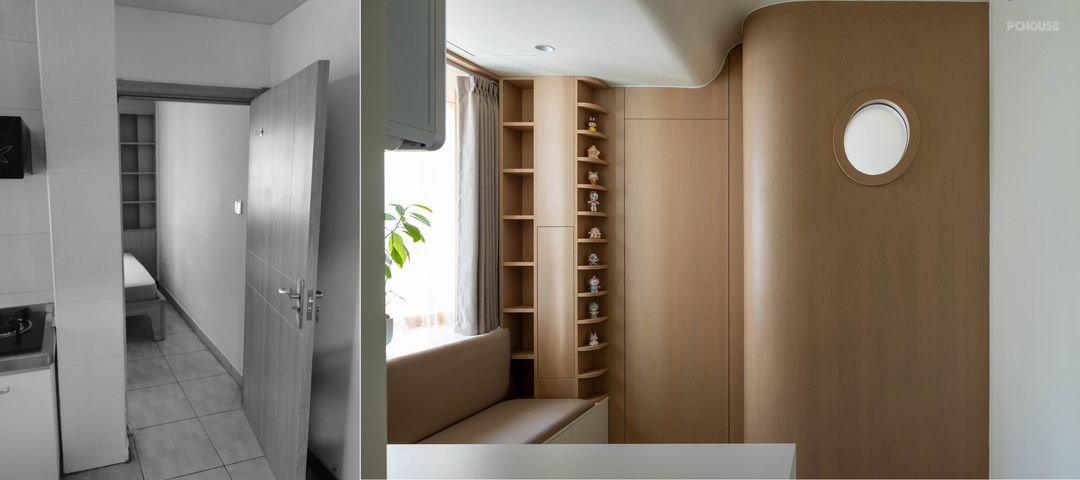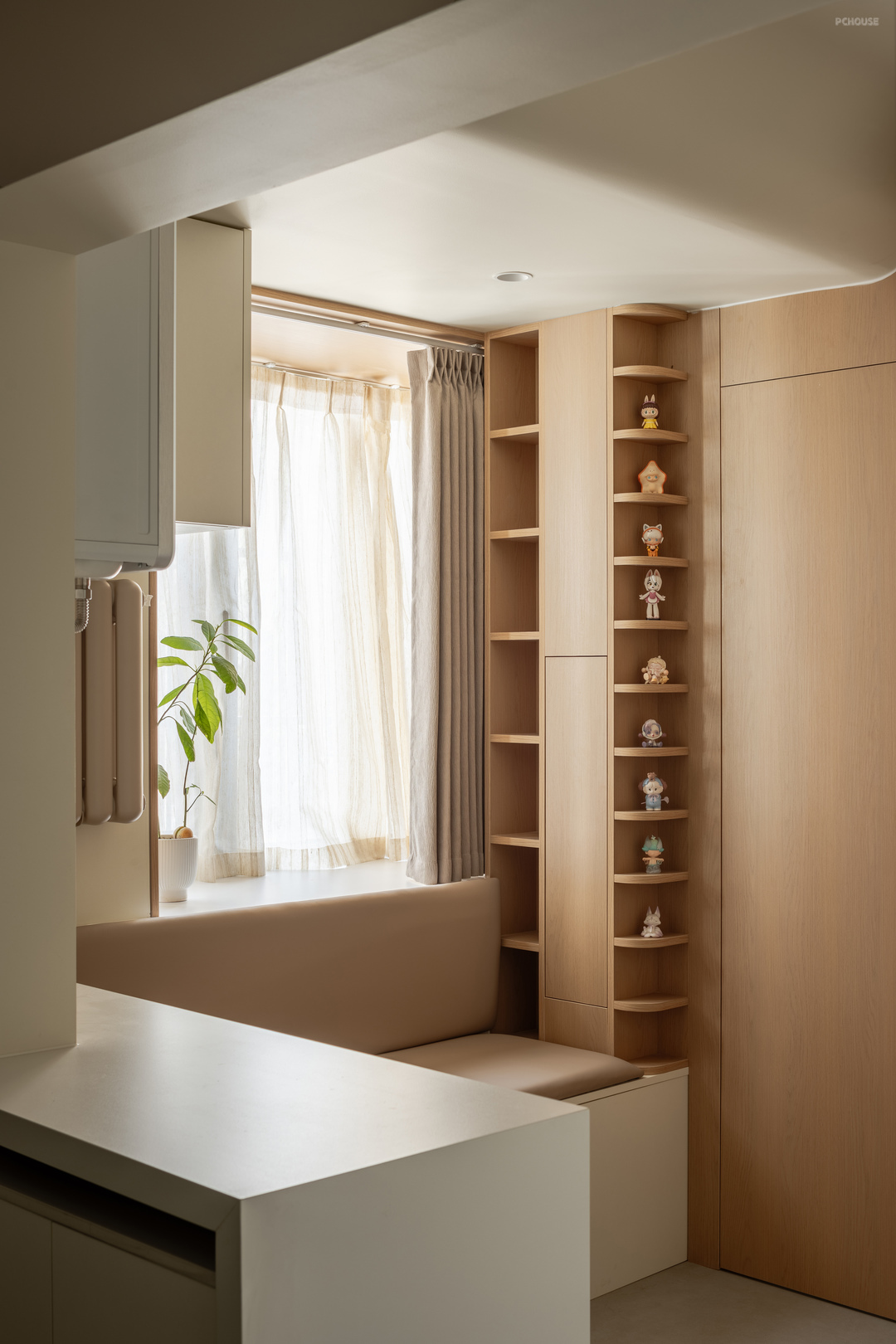 卡座上方的储物格部分原来是老的下水管道,这部分空间大件无法收纳,我们通过定制对其进行包管,同时把管道左右部分空间用来做开放展示格,正好可以收纳模型,不浪费一点犄角旮旯!