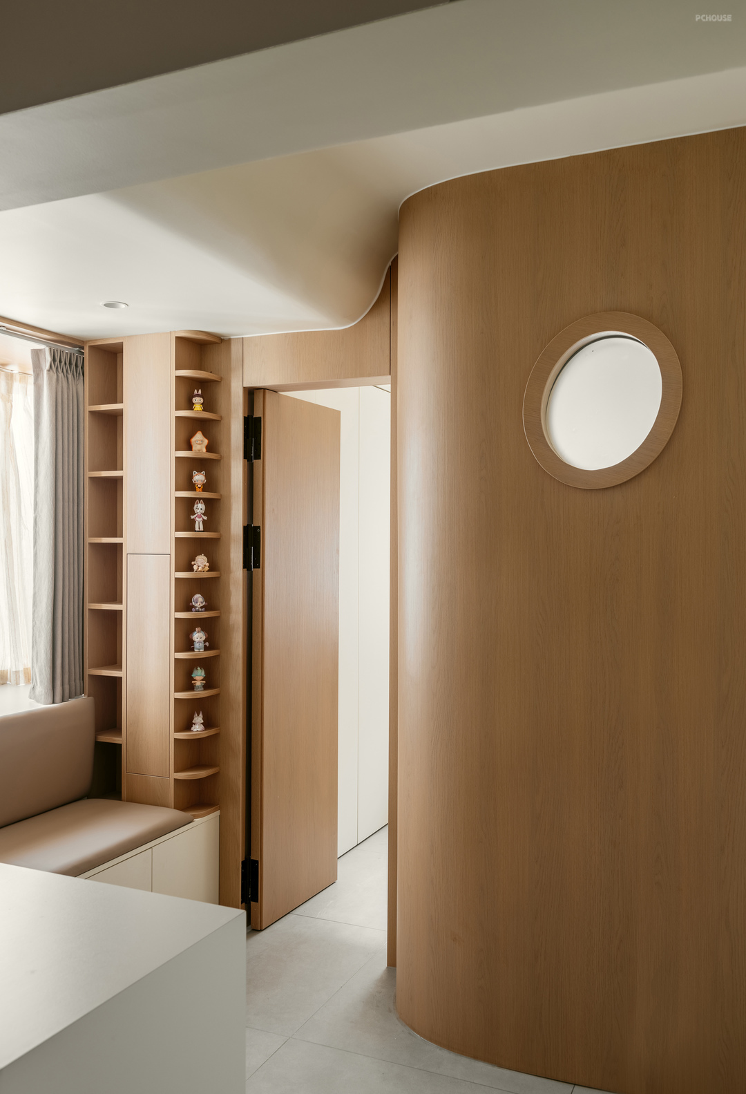 儿童房整体的外立面都是暖色的木饰面,进门就可以感受木质带来的温暖感受,立面的椭圆形孔洞内嵌磨砂玻璃,透光不透人,第一可以增加餐厅采光,丰富立面空间,第二当父母下班回家推开门的第一眼,就可以看到椭圆窗户透过来暖暖的光,传达家的温暖,为在外奔波的父母点亮回家的第一盏灯!