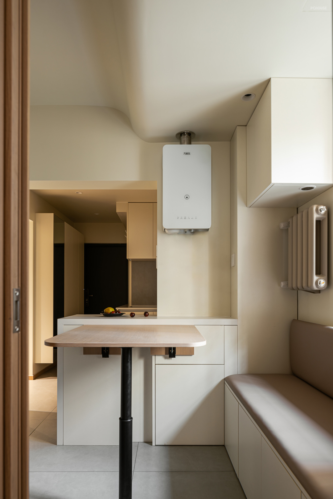 2:将原客餐厅位置调换,厨房空间变大,电器都可以内嵌,通过岛台做移动的操作台增加操作空间,餐厅挪到有窗户的区域,用餐体验得到改善,后期男主在这里办公环境也得到很大的改善,新增的卡座变成了强大的收纳盒子